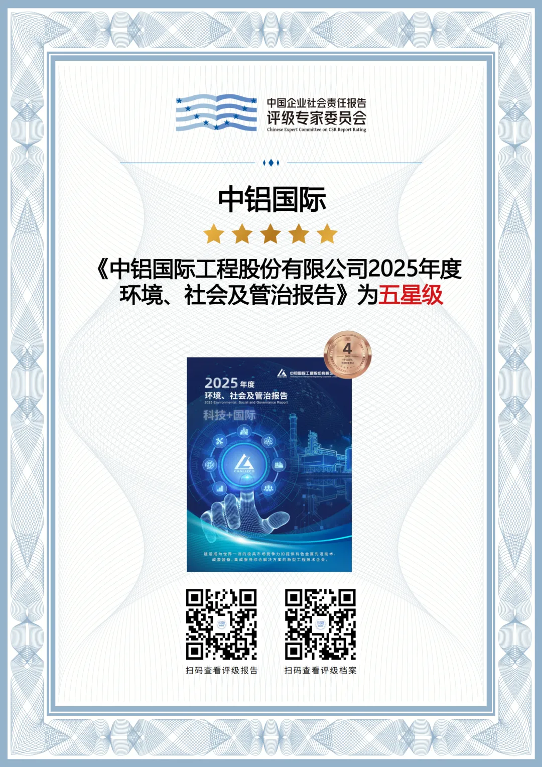近日,经“中国企业社会责任报告评级专家委员会”评定,《中铝国际工程股份有限公司2025年度环境、社会及管治报告》为“五星级”,是一份卓越的企业可持续发展报告。