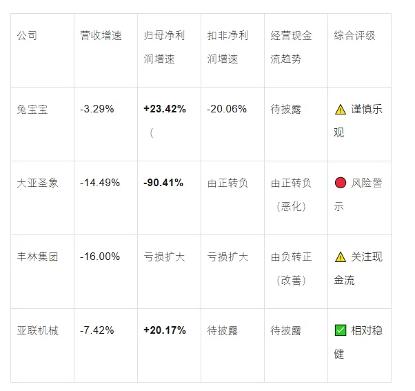 兔宝宝:归母净利润逆势增长23.29%,但扣非净利润连续两年下滑,增长质量存疑 大亚圣象:业绩加速恶化,净利润连降七年,经营现金流转负 丰林集团:连续两年亏损,亏损额小幅扩大,刨花板业务亏损加剧 亚联机械:营收下滑但净利润增长,成本控制成效显著