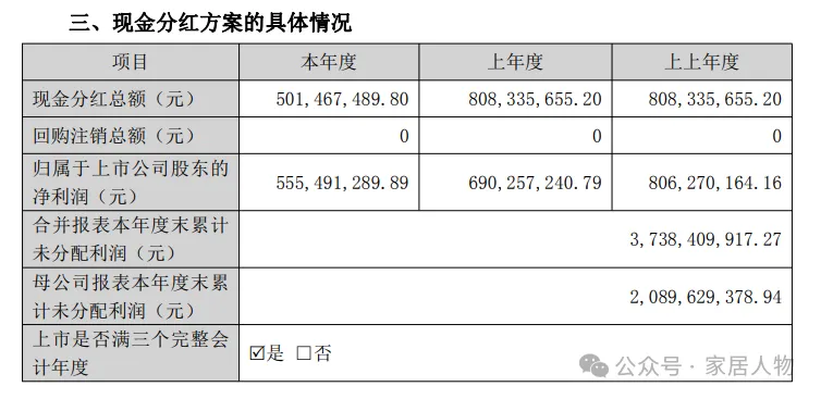 尽管业绩下滑,富森美依然延续了高分红政策。2025年度利润分配预案为:每10股派发现金红利3.10元(含税),合计派发现金股利约2.32亿元。值得注意的是,加上2024年度和2025年半年度分红,公司2025年全年累计现金分红总额约为5.01亿元,占当年归母净利润的90%以上。