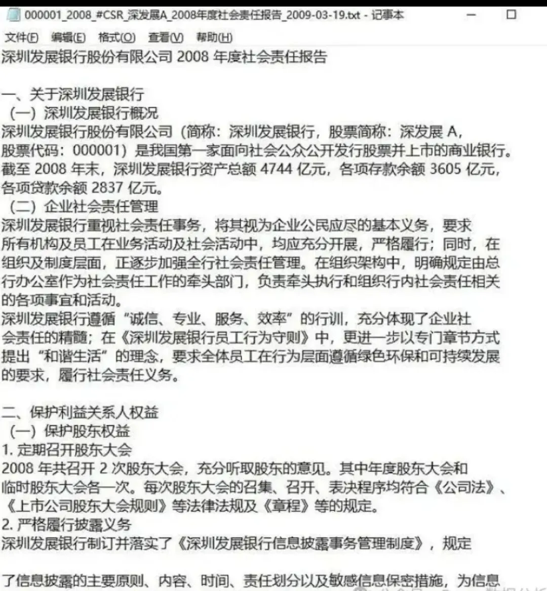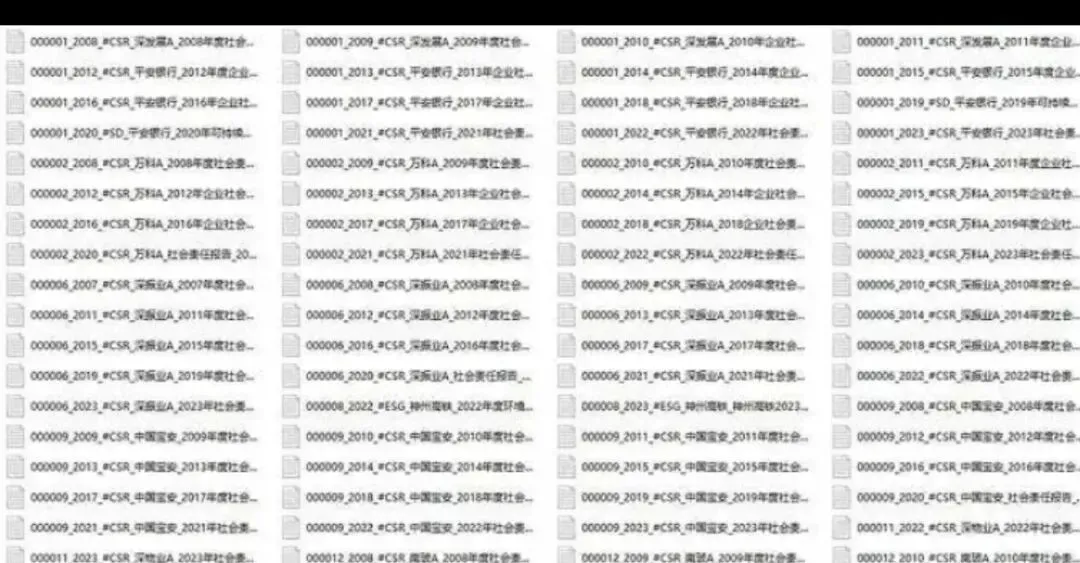 绝大部分企业每年只发布一个社会责任相关的报告(无论企业管它叫CSR、ESG还是可持续),统一存放在“社会责任报告(去重)”文件夹中。标题中“XXX家企业YYY份”指的就是这里的样本企业数量和报告数量。但是,也存在发布了不止一个报告的情况(例如既发布了CSR报告,又发布了ESG报告的)。对于这种情况,优先“社会责任报告(去重)”文件夹中存放社会责任报告,而将另一个报告放在在此“企业发布的其他报告”文件夹中。