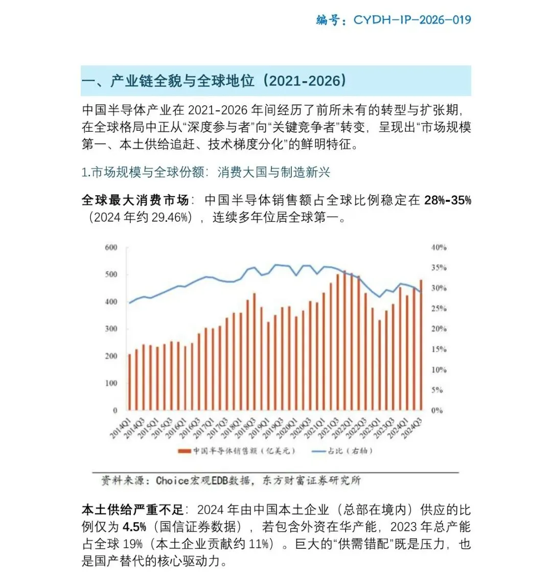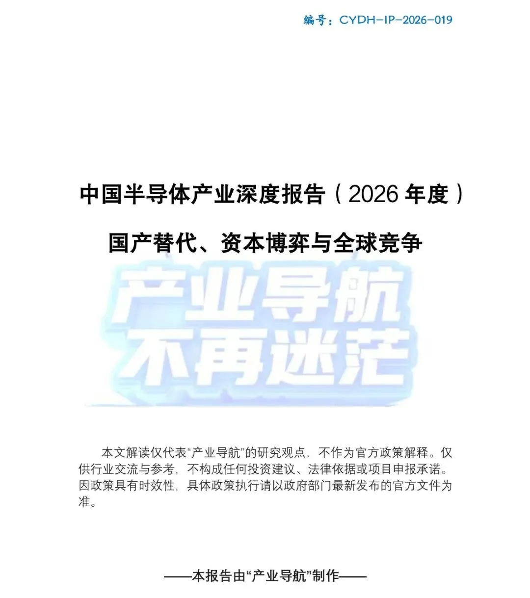 时间已经来到2026年的4月,过去的这五年,中国半导体产业经历了一段前所未有的转型与扩张期。我们在全球产业链中的角色,正经历着从“深度参与者”向“关键竞争者”的重大转变。为了帮大家拨开行业迷雾、看懂政策红利与资本风向,我们“产业导航”团队精心制作了关于半导体行业的重磅报告:CYDH-IP-2026-019的《中国半导体产业深度报告(2026年度):国产替代、资本博弈与全球竞争》,总字数近两万五千字,凝聚了我们产业导航研究组的专家心血。
