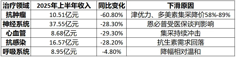 收入从237.36亿元降至205.84亿元,是业绩下滑的主因。核心治疗领域表现如下: