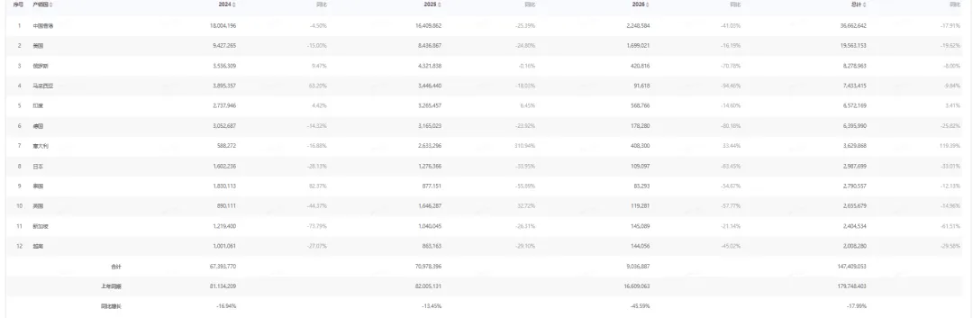 整体数据显示,几乎所有主要市场在2026年的出口额均较2025年出现断崖式下跌。这一现象可能由以下原因导致: