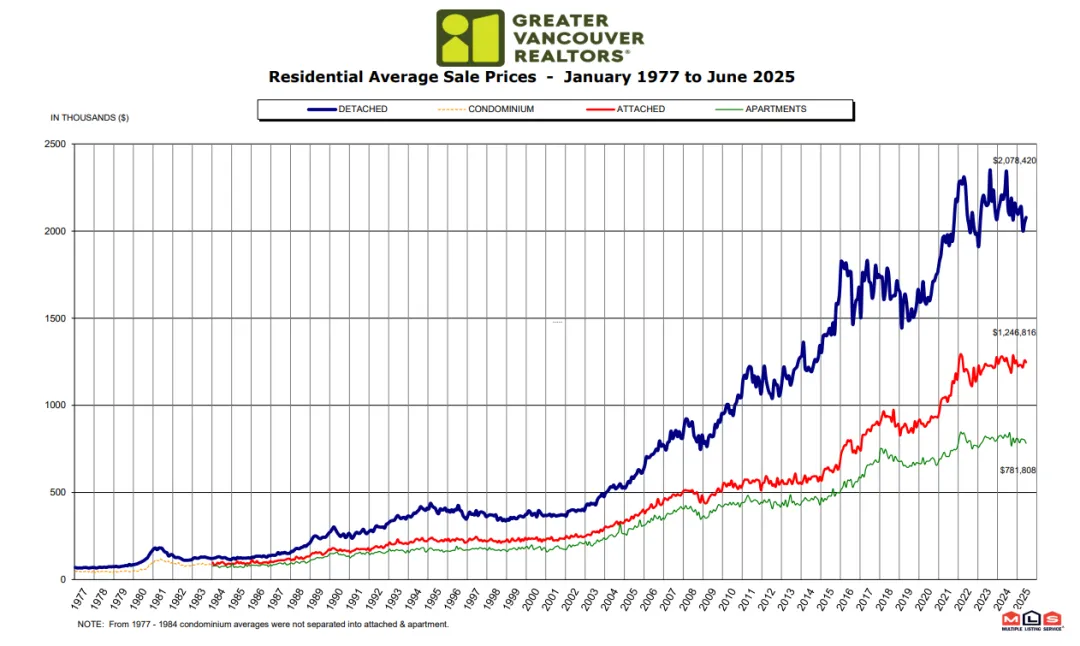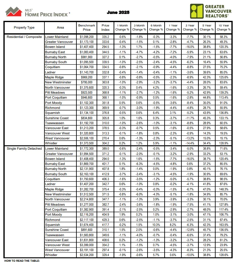 大温地区所有住宅物业的MLS®房价指数综合基准价目前为$1,173,100加元,较2024年6月下降了2.8%,较2025年5月下降了0.3%。