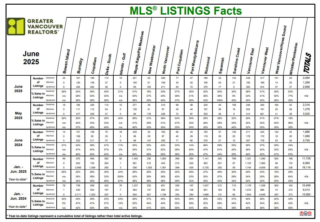 There were 6,315 detached, attached and apartment properties newly listed for sale on the Multiple Listing Service® (MLS®) in Metro Vancouver in June 2025. This represents a 10.3 percent increase compared to the 5,723 properties listed in June 2024. This was 12.7 percent above the 10-year seasonal average (5,604).
