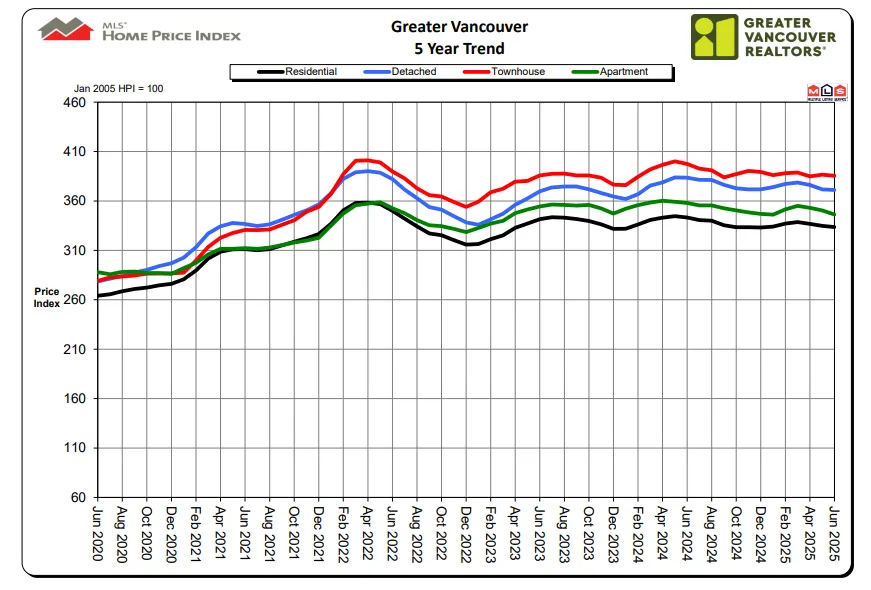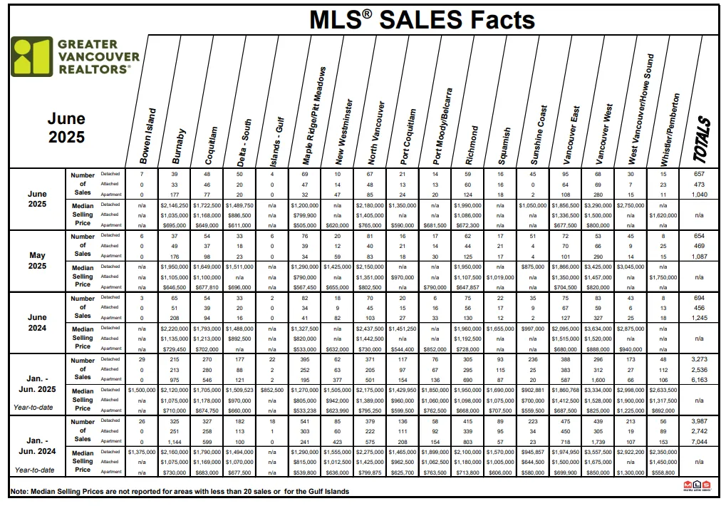 Sales of detached homes in June 2025 reached 657, a 5.3 percent decrease from the 694 detached sales recorded in June 2024. The benchmark price for a detached home is $1,994,500. This represents a 3.2 percent decrease from June 2024 and a 0.1 percent decrease compared to May 2025.
