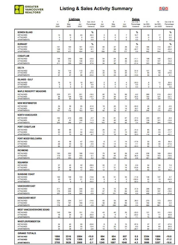 “On a trended basis, signs are emerging that sales activity is rounding the corner after a challenging first half to the year, with the year-over-year decline in sales in June halving the decline we saw in May,” said Andrew Lis, GVR’s director of economics and data analytics. “If this momentum continues, it may not be long before sales are up year-over-year, which would mark a shift toward a market with more demand than the unusually low demand we’ve seen so far this year.”