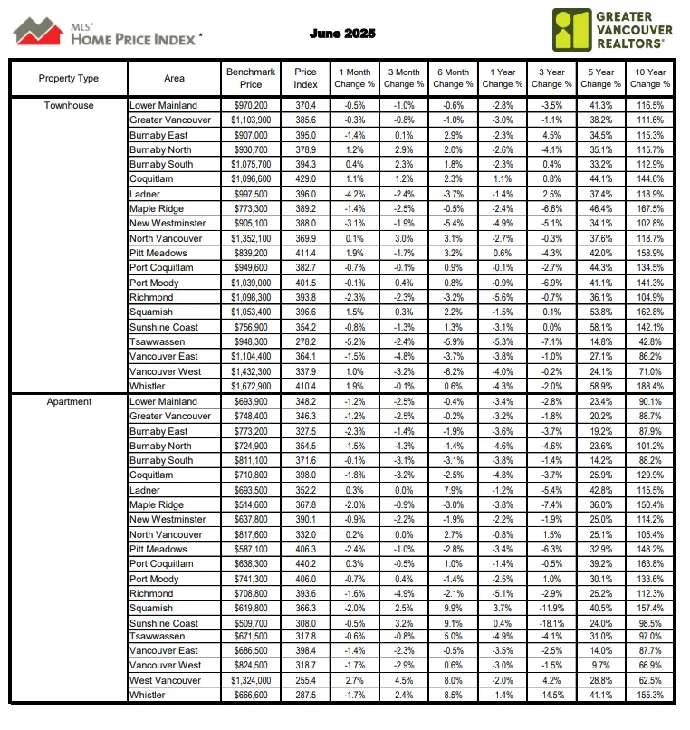 Attached home sales in June 2025 totalled 473, a 3.7 percent increase compared to the 456 sales in June 2024. The benchmark price of a townhouse is $1,103,900. This represents a three percent decrease from June 2024 and a 0.3 percent decrease compared to May 2025.