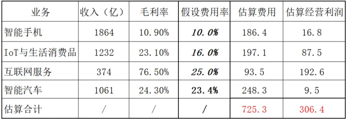上表中,智能汽车费用率已知为23.4%;互联网服务对标其他大厂的互联网广告业务,取25%费用率;生活消费品对标美的集团,取16%费用率。智能手机最合适的对标对象是OPPO和vivo,但这两家公司未上市,无法获得具体数据。经过多次拟合,当费用率取10%时,最接近真实财报数据(上表中红色数字与财报中的费用和经营利润最吻合)。