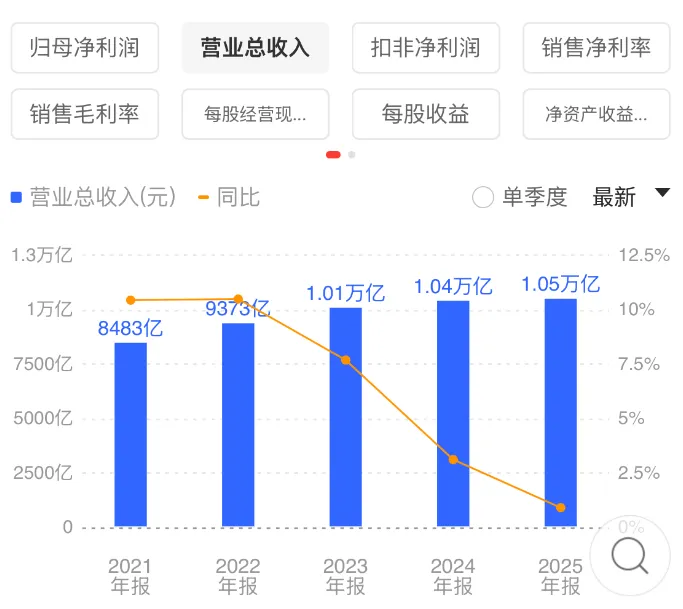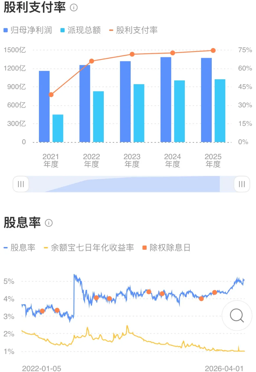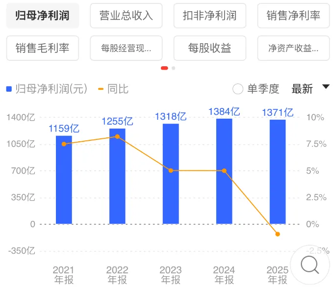 业绩方面,25年营收10501.87亿元,同比增长0.91%,归母净利润1370.95亿元,同比微降0.92%,但同口径增长2.0%,扣非净利润增长4.3%,市场地位就体现出来了,主营业务非常稳定。