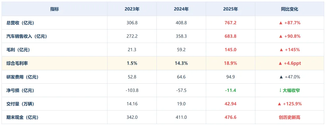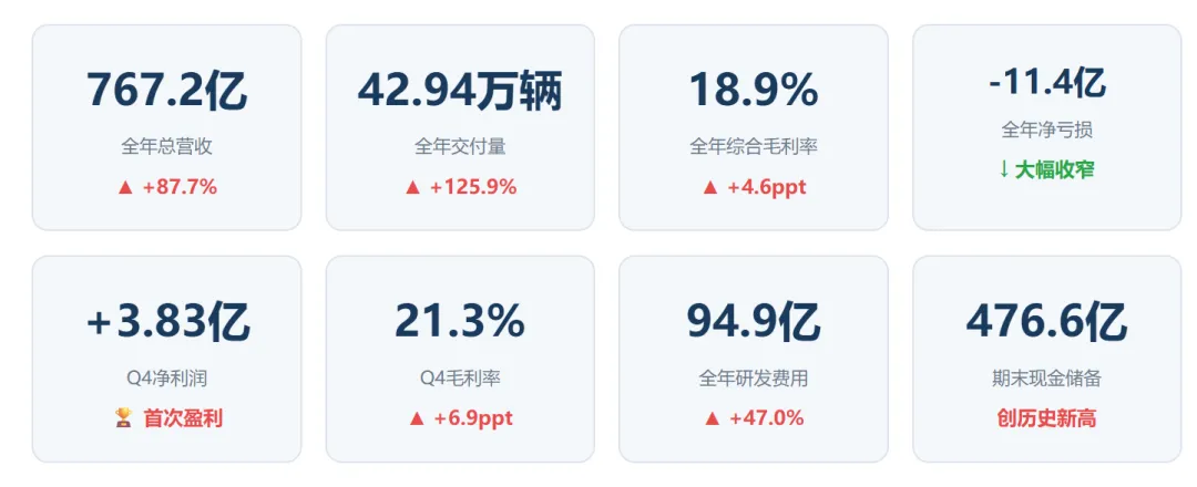 ? 销量翻倍增长:全年交付429,445辆,同比+125.9%,远超年初目标。MONA M03作为15万级爆款车型,凭借越级智驾能力打开大众市场,显著提升规模效应。