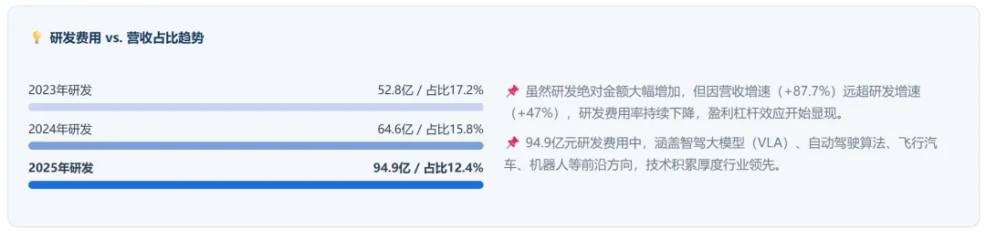 分季度看,收入的增速还是出现了逐步下降的趋势,不过这也和去年的季度末高增速有关,我们不看同比看环比的话,可以发现每个Q都是环比增长的,从Q1的158亿一路涨到Q4的222亿;另外,毛利率的部分也是一路上涨的趋势,从Q1的15.6%一路涨到Q4的21.3%,这里面主要的原因还是汽车毛利率的提升。每个季度10W+的交付量其实已经很让人满意了,小鹏2026年如果可以继续高增长,再增长60%+那么它的年销量就会来到70W这个体量,这个数量在今天的新能车里绝对是翘楚的存在,这已经超出了新势力的头名在新势力里可以排第一了。除了遥遥领先的比亚迪,还有传统老大哥吉利、长安、上汽通用五菱、奇瑞这些企业,现在新势力要做的就是拿下更多的市场份额,坦白说这些企业包括比亚迪,在10W+的市场上未来很难和新势力掰手腕,也许十万以下的市场才是它们的归宿。从研发的投入上就可以看到差距,小鹏2025年全年研发费用达94.9亿元(同比+47%),体现了小鹏对技术领先的持续坚守。研发投入占营收比约12.4%,在新势力中处于高位。最近三年小鹏的研发费用以及营收占比如下,我们可以看到占比下降,但是整体的研发费用在高速增长。(虽然研发高速增长,但是营收增长的更快