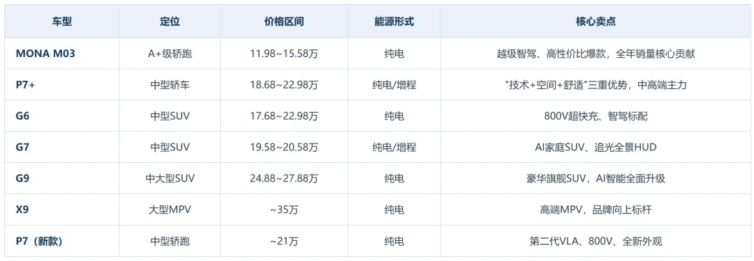 )坦白说,这几家新势力中,小鹏算是比较另类的一个了,它完全follow的是特斯拉的技术路线,虽然纯视觉我一直觉得无法解决最后一公里的问题,但是真的all in这个技术还是值得我们尊重的。小鹏的产品矩阵非常的清晰,MONA M03主要10-15万这个核心价位,是它的核心车型;15-25万这个价位有多款车型,但是并不重复,比如有轿车P7,有SUV的G6和G7,主要就是可以满足不同的使用场景和用户需求;在往上25-35这个价位,高端车型有可以和理想、问界、蔚来的旗舰车掰手腕的G9,还有一款X9的商务MPV,可以说小鹏的产品线是我看到的车企里最齐全的之一。我不知道小鹏未来会不会再出一款10万以下的车来和比亚迪们硬怼,我想如果有一天小鹏可以把成本控制的更好,它真的有实力在10万以下的市场强夺传统车企的份额,这应该是新能车最后一个传统的阵地了,我希望零跑和小鹏可以合力完成这个壮举,我甚至觉得未来零跑、小鹏和比亚迪可以成为三足鼎立的存在。MONA M03 爆款效应让小鹏尝到了甜头,如果小鹏价格下沉,对其他厂商来说真的是降维打击。何小鹏在2026小鹏全球新品发布会上宣布:2026年小鹏将在全球市场实现"十车连发",并从中国式出口转向全球深度本地化运营:- ? Robotaxi运营启动:2026年开始Robotaxi商业化运营,布局智能出行平台