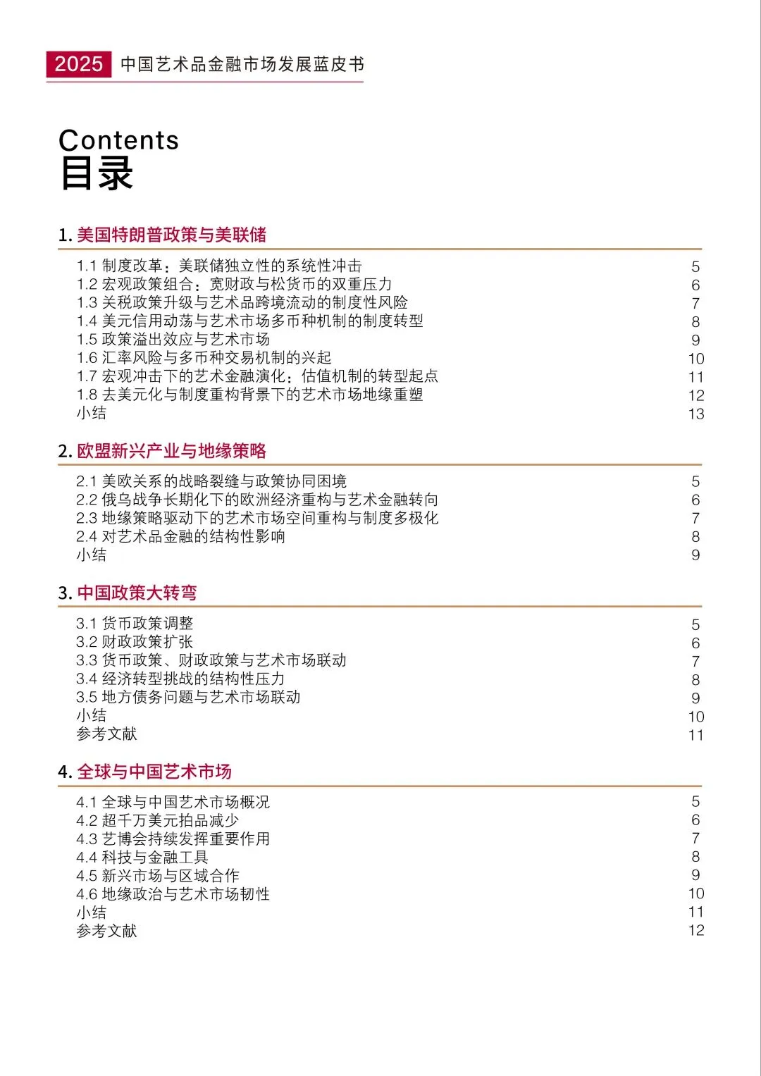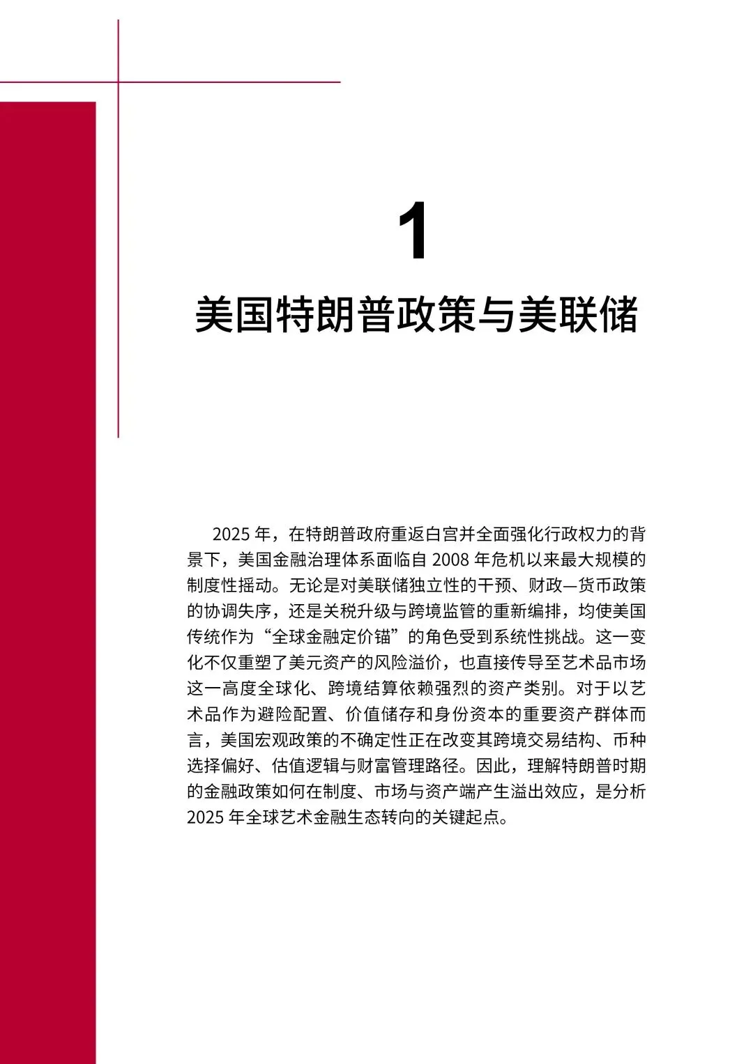 全球经济格局深度重构、国内宏观政策在系统性转向的新发展周期,随着内需推动进程持续加快,"文化消费"已成为拉动经济增长、培育新质生产力的核心引擎。这一转型期恰逢"十五五"规划谋篇布局的重要窗口。在国家文化强国战略引领与产业政策的推动下,中国艺术品金融市场正迈入价值重构、生态升级的全新发展阶段,系统研究艺术品金融市场的变革逻辑与发展动向,将有助于完善高标准文化市场体系,推动文化与金融深度融合、产业高质量发展。《中国艺术品金融市场发展蓝皮书(2025)》以全球金融、艺术市场 “大转弯” 为核心主线,致力于全景呈现全球与中国艺术品金融市场的深层变革与最新动向,从金融市场的底层逻辑与发展活力、艺术品市场的价值重估与发展规律、全球艺术交易中心的格局演进与城市特质、科技发展对艺术金融的变革影响与未来趋势、中国艺术品金融人才的能力建设五个核心维度出发,深入剖析艺术品金融市场的完整生态体系与发展机遇,助力艺术品金融复合型人才的体系化培养,推动中国艺术品金融市场规范化、高质量发展。《中国艺术品金融市场发展蓝皮书(2025)》由亚洲艺术品金融商学院发布,院长范勇担任主编,特邀韩宗佳先生、邱家和先生担任副主编,张晓明、丁方、陈少瑜、李磊、许彬、童雁汝南、张正霖、袁慧敏、陈能军、黄淑霞担任学术顾问,张舒涵、李佩婷、张煦然、张若玥、孙咪娜担任撰稿人,刘雨萌担任校审。2025年美国特朗普政府的政策组合对全球艺术金融形成系统性冲击:对美联储独立性的制度干预、宽财政+松货币的政策组合、关税升级与跨境监管收紧,叠加美元信用动荡,推动艺术市场加速去美元化与多币种交易机制落地。艺术市场估值机制迎来转型起点,全球地缘格局重构,亚洲、欧洲艺术金融节点地位显著提升,艺术品成为高净值人群避险配置的核心选择。