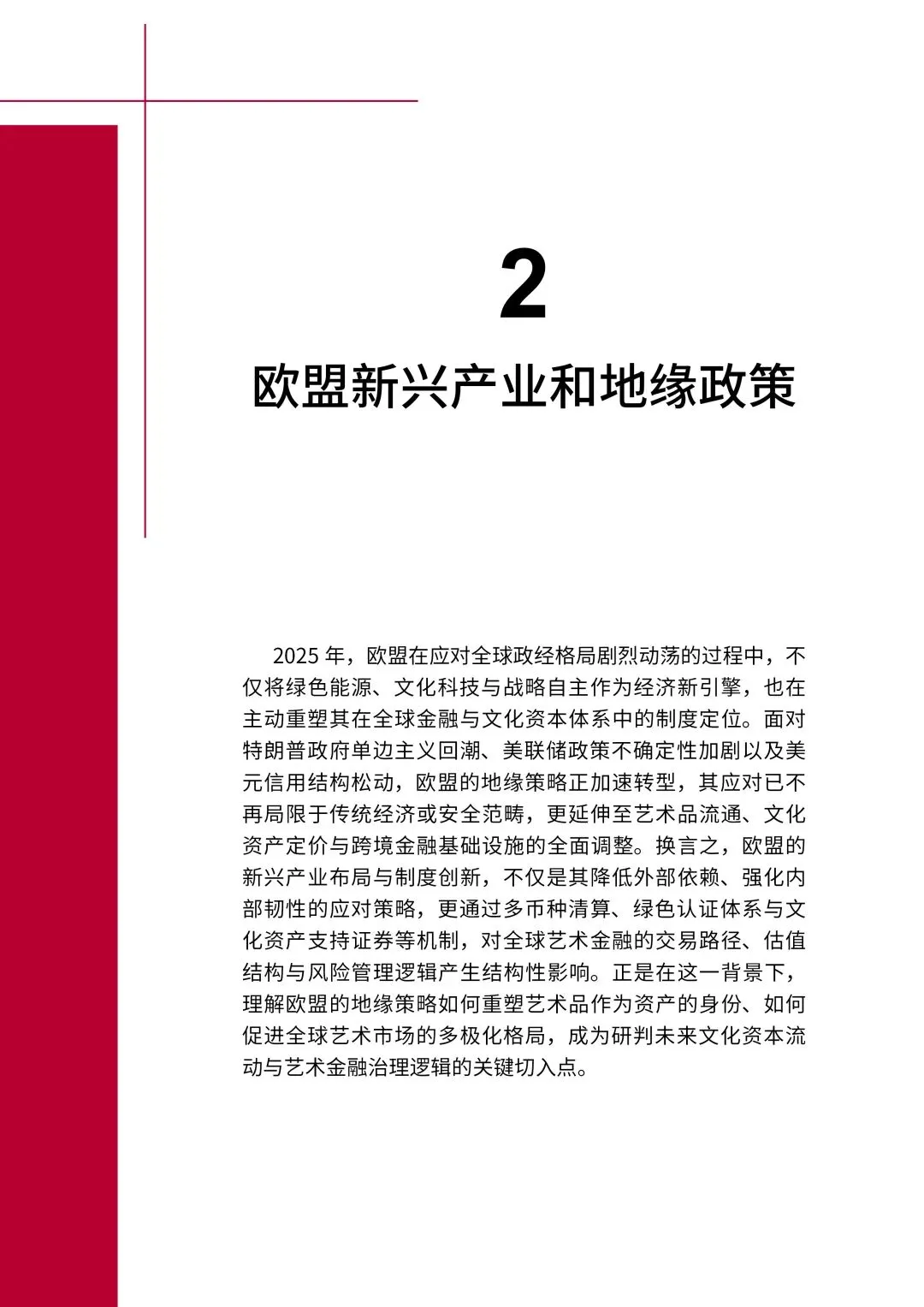 欧盟以绿色能源、文化科技为双向驱动,应对美欧战略裂缝与俄乌战争长期化影响,推动艺术市场向制度多极化转型。通过多币种结算、文化资产支持证券、绿色主权基金等工具,将艺术品纳入地缘风险对冲体系,巴黎-柏林-布鲁塞尔成为欧洲艺术金融核心枢纽,艺术品金融从市场驱动迈入地缘制度驱动新阶段。