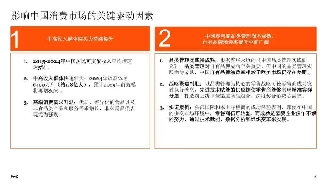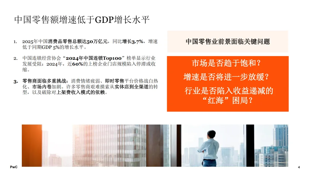 这份由普华永道于2026年1月发布的《中国消费市场报告》指出,尽管2025年中国消费品零售总额增速(3.7%)低于GDP增速(5%),零售行业面临消费情绪疲弱、价格战激烈和转型压力等挑战,但中长期前景依然乐观。报告从四个关键驱动因素展开分析: