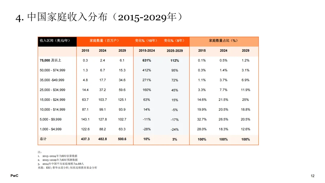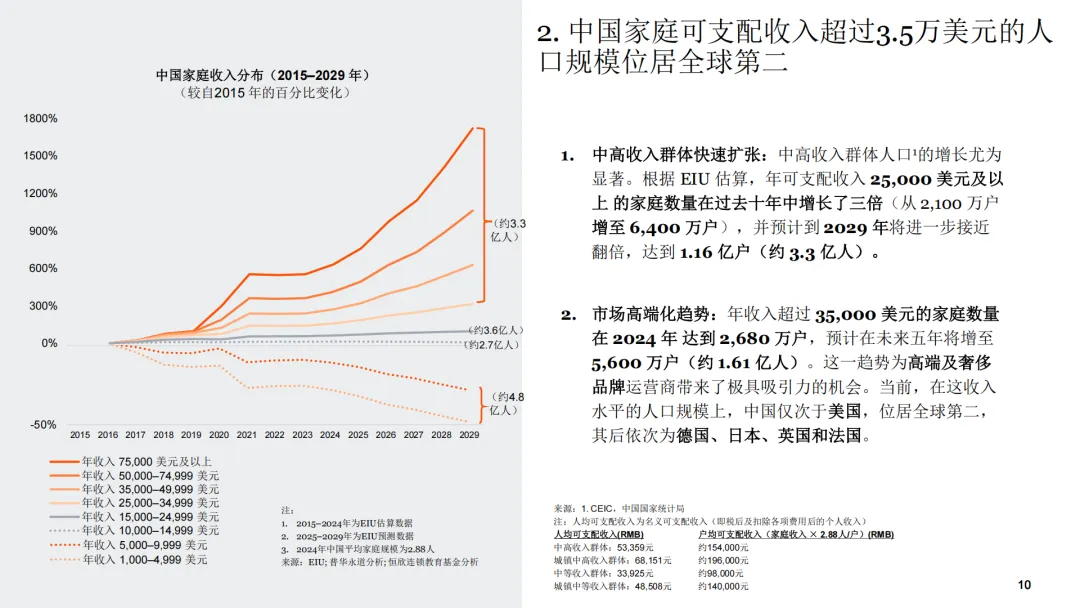 中高收入群体持续扩容:过去十年中国居民可支配收入年均增长约5%,中高收入家庭(年收入2.5万美元以上)数量预计到2029年将达1.16亿户。虽然消费能力提升,但受房价下跌和经济放缓影响,居民储蓄意愿增强,存在“储蓄悖论”。