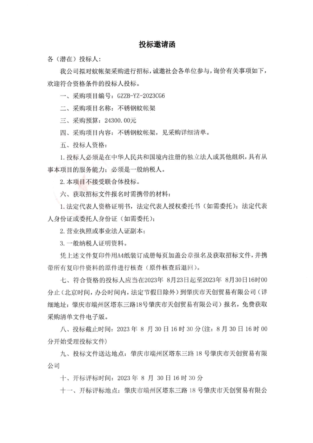 不锈钢蚊帐架投标邀请函