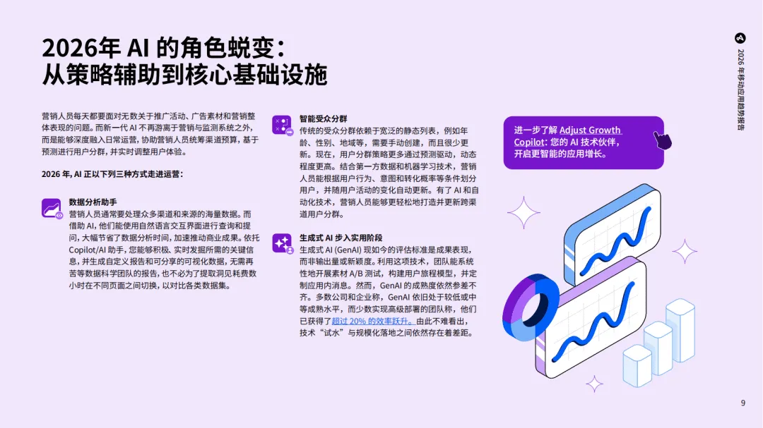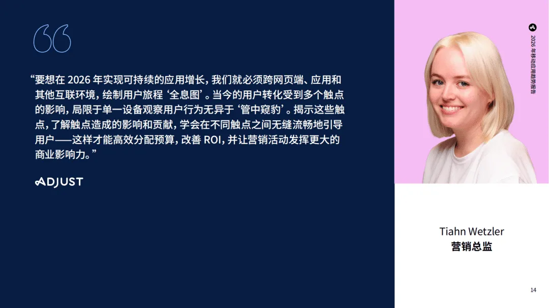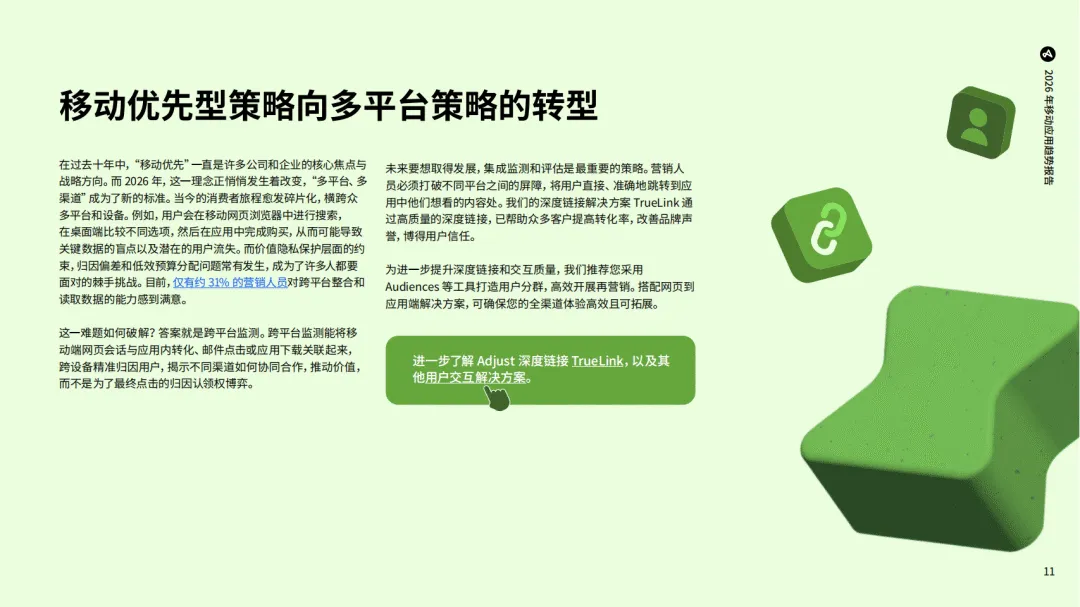 Adjust《2026年移动应用趋势报告》依托全球多品类应用的海量数据,剖析了移动应用行业的发展现状与未来趋势,指出2026年行业将迎来以AI为核心、多平台融合的变革新阶段,数据驱动与跨渠道运营成为增长关键。