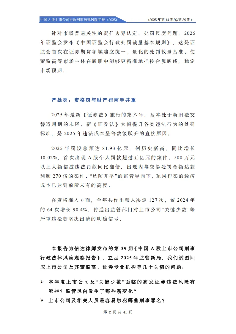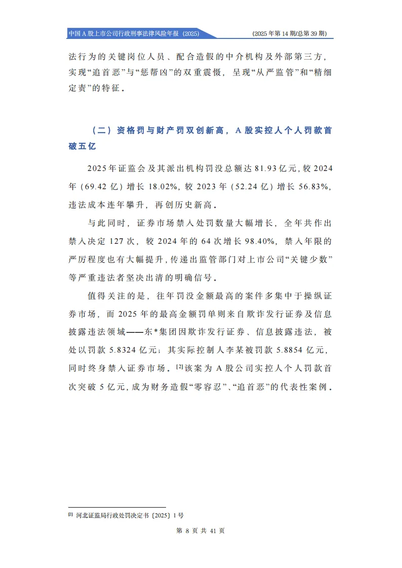 《中国A股上市公司行政刑事法律风险年报(2025)》展现了2025年资本市场严监管、精细化监管的核心特征,证监会罚没总额、市场禁入决定数量均创历史新高,行刑衔接机制持续深化,上市公司及相关主体的行政刑事法律风险显著提升。