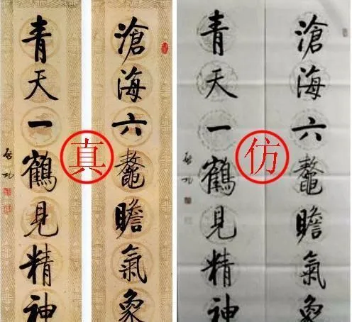 有些仿真的印刷技术,像前些年日本二玄社的仿真印刷,以及现在欧洲更高级的技术,能直接把画印到宣纸上,仿真程度很高,制作假画没有一定鉴别经验则难以辨认。更有些造假者,把水印版画买来后用笔加添颜色,或者弄出水洇的痕迹,一看好像不是印的。不过,仔细分析,水印也是能看出来的。比如飞白之处,书法绘画是有方向性的,有走向,但是刻的版上没有,仔细看这些地方都是死板的点,缺少方向性。另外,笔画交叉处应是两次着墨,墨色重一些,但是印刷品没有,而后上的颜色,则是浮在上面,也能够看出来。