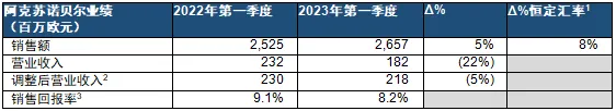 ● 营业收入为1.82亿欧元(2022年同期为2.32亿欧元);调整后营业收入2为2.18亿欧元(2022年同期为2.30亿欧元);销售回报率3为8.2%(2022年同期为9.1%)