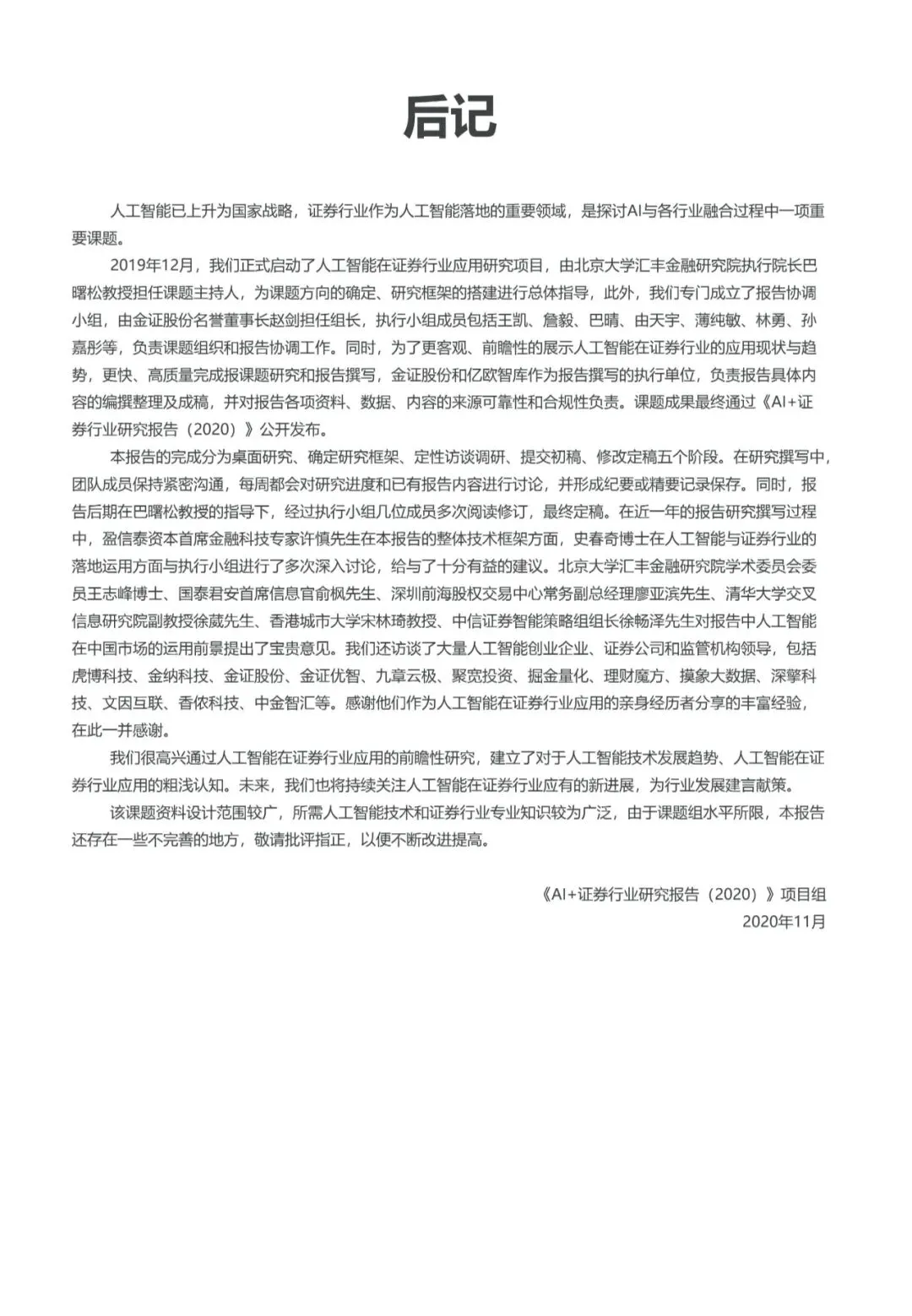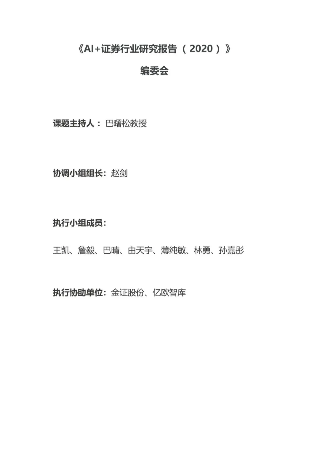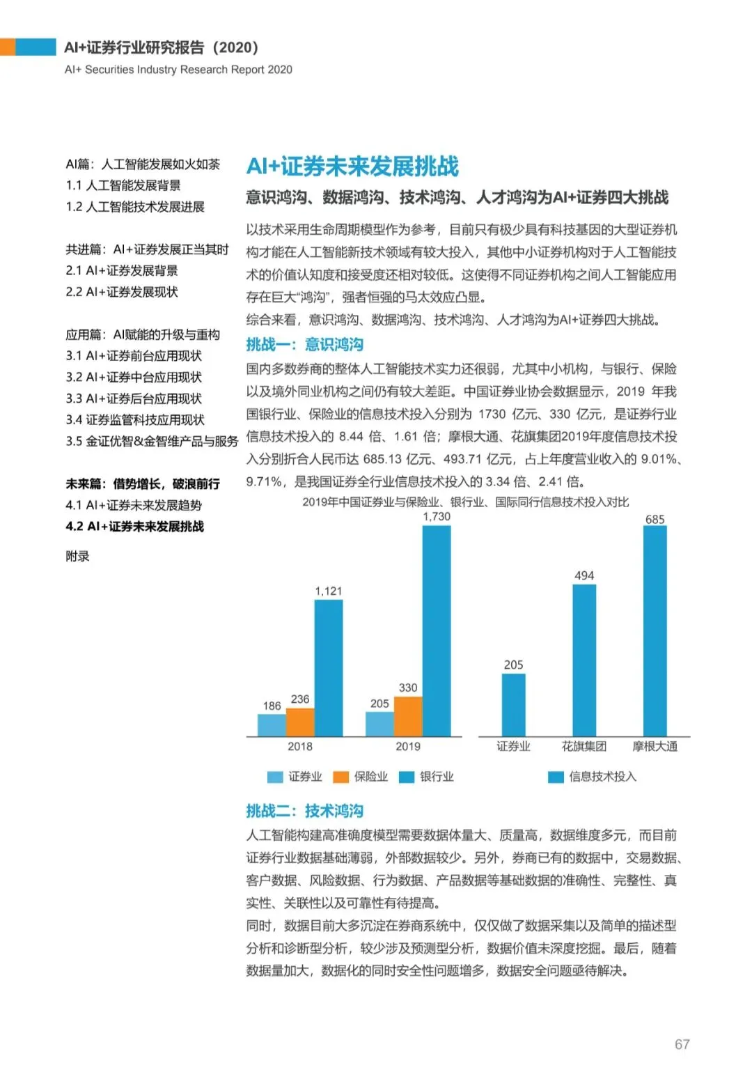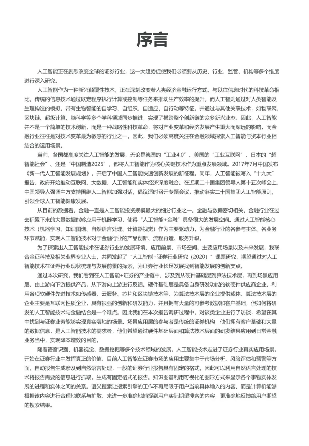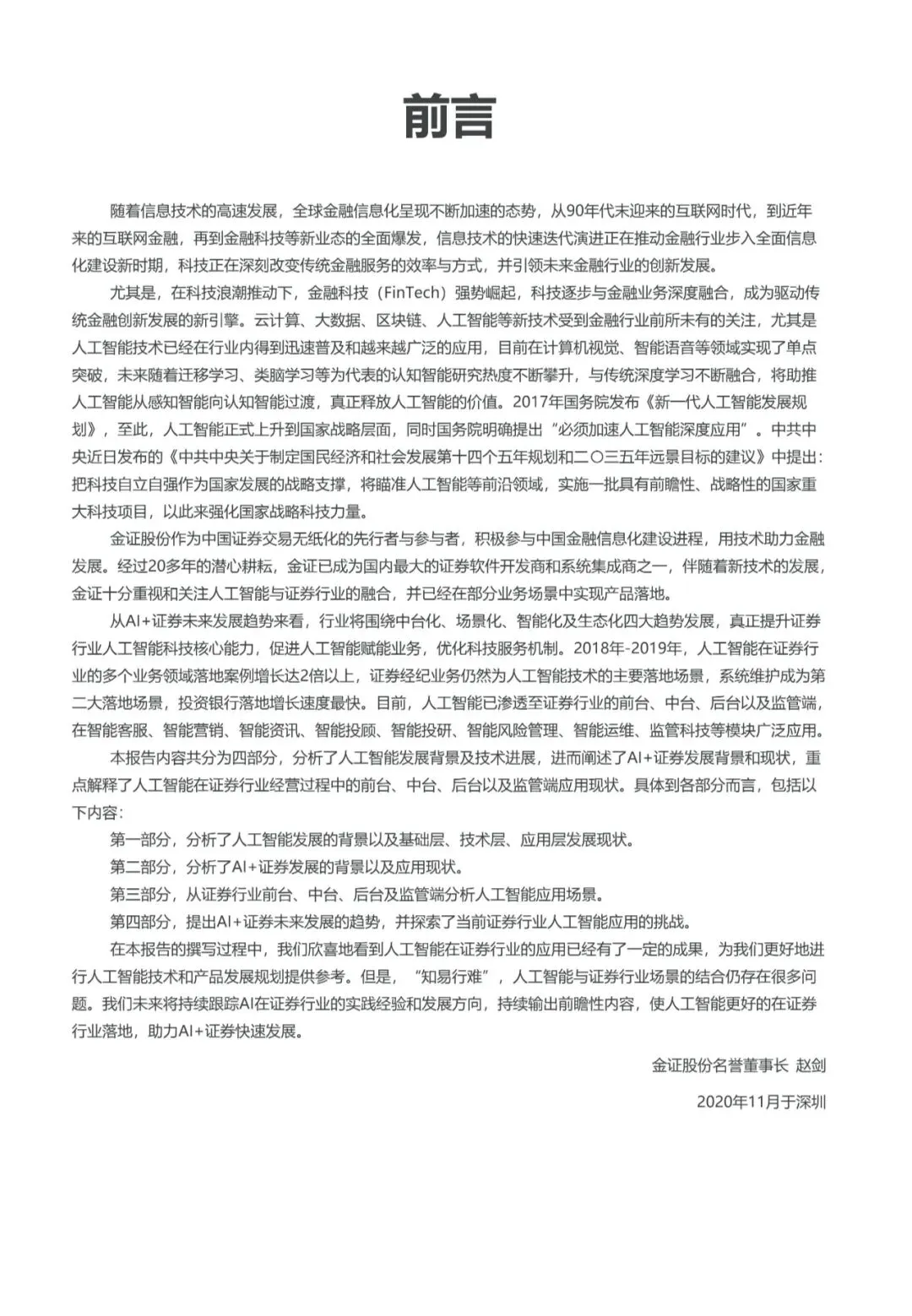 2020年12月10日,《AI+证券行业研究报告(2020)》正式发布。该报告在北京大学汇丰金融研究院执行院长、中国银行业协会首席经济学家巴曙松教授指导下,由金证股份与亿欧智库历时一年时间共同完成。报告通过对人工智能企业、监管机构、证券公司等多个行业的从业专家进行访谈,从不同角度看待AI在证券行业的现状与未来发展,同时辅以大量文献资料作为数据支撑,分析了人工智能发展背景及技术进展,进而阐述了AI+证券发展背景和现状,重点解释了人工智能在证券行业经营过程中的前台、中台、后台以及监管端应用现状。报告认为平台化、场景化、智能化及生态化为AI+证券发展四大趋势,意识鸿沟、数据鸿沟、技术鸿沟、人才鸿沟为AI+证券四大挑战。