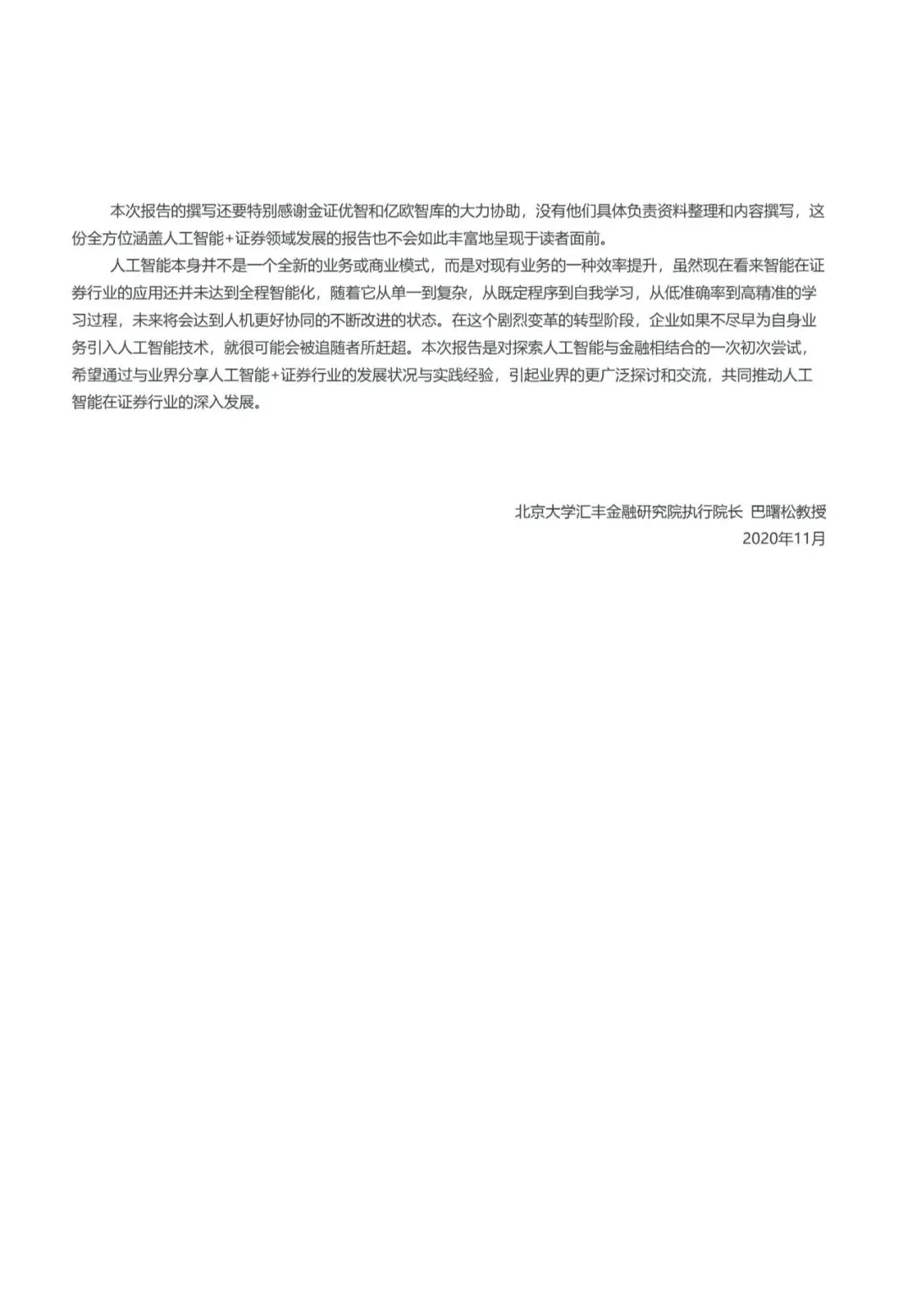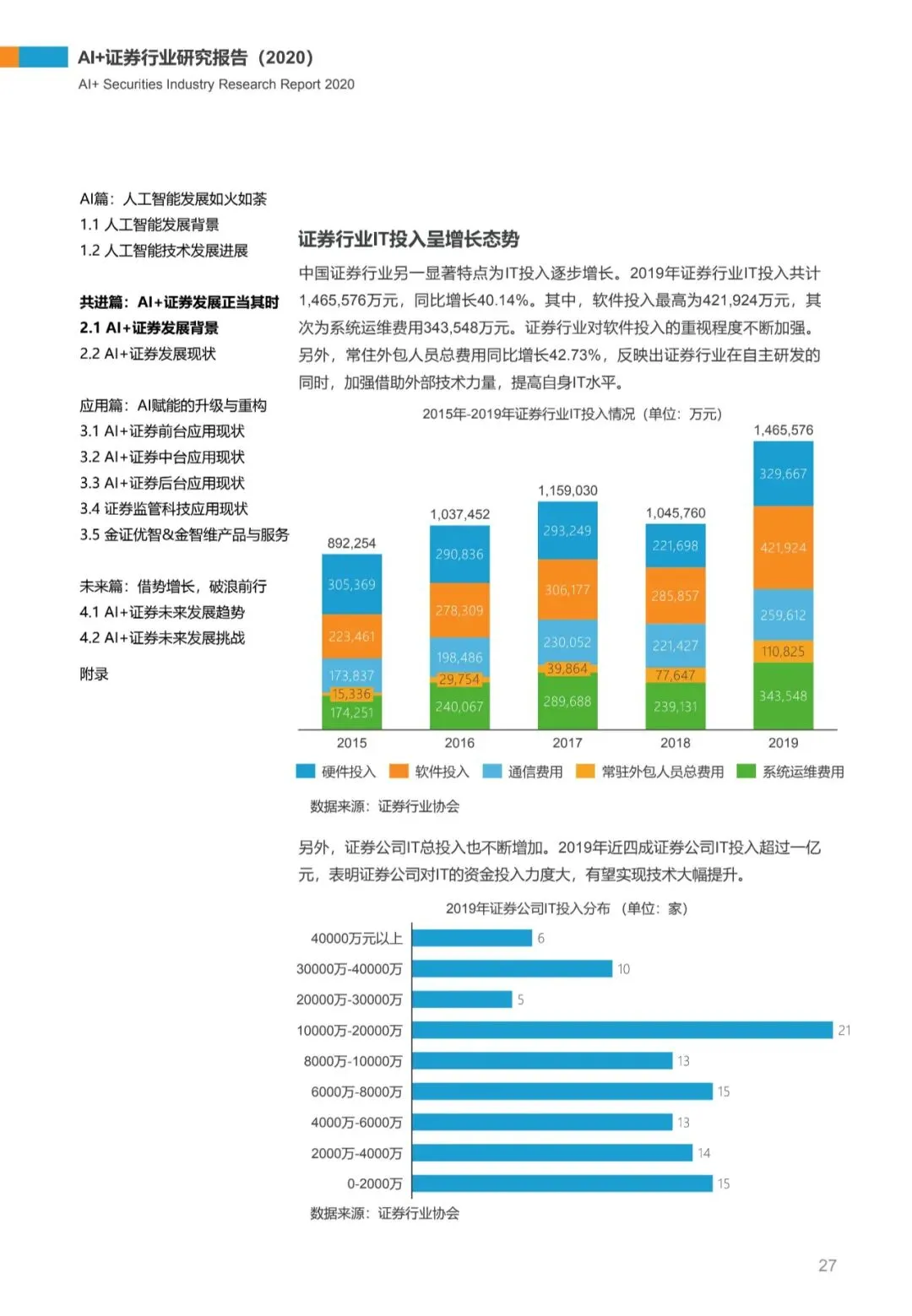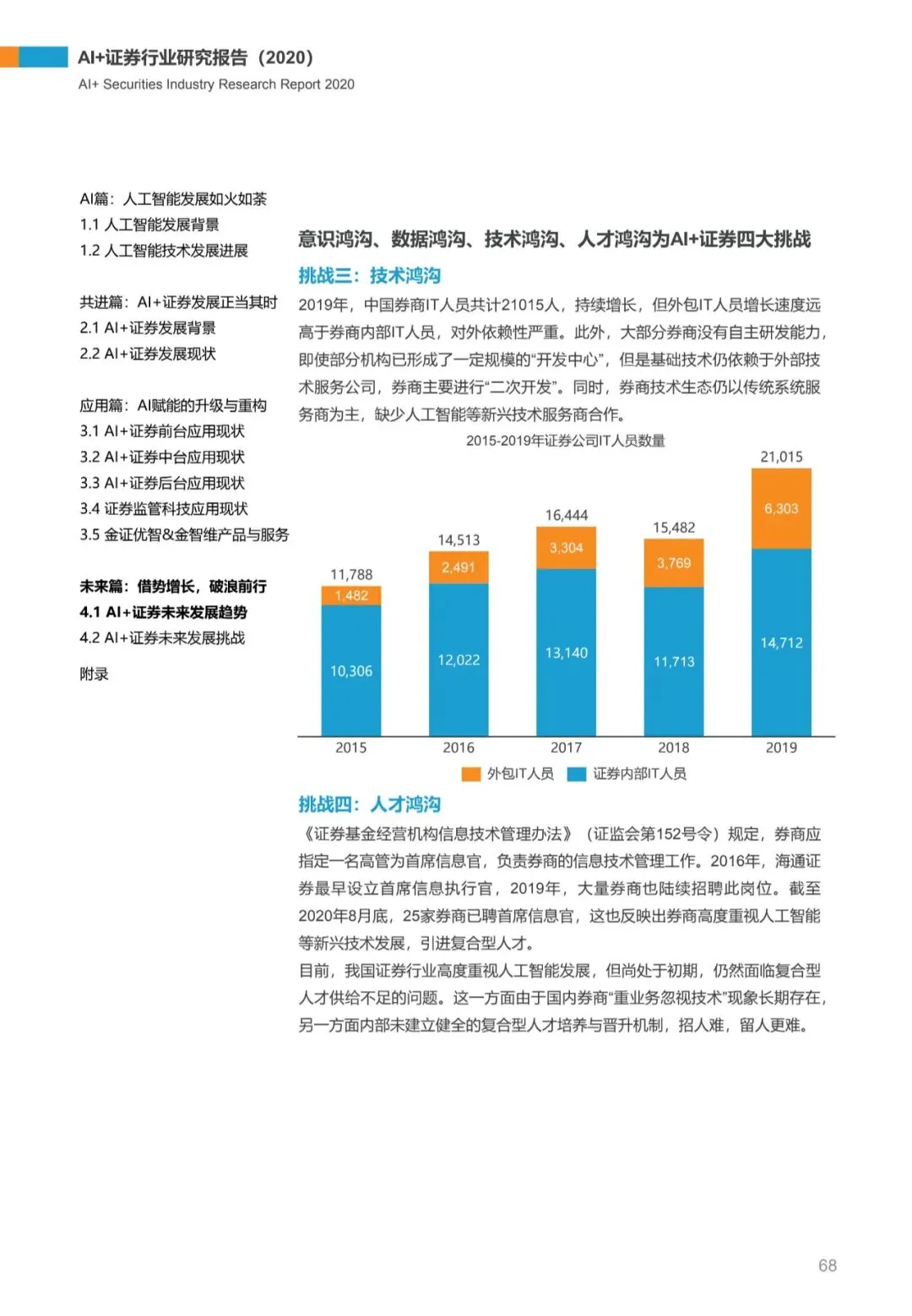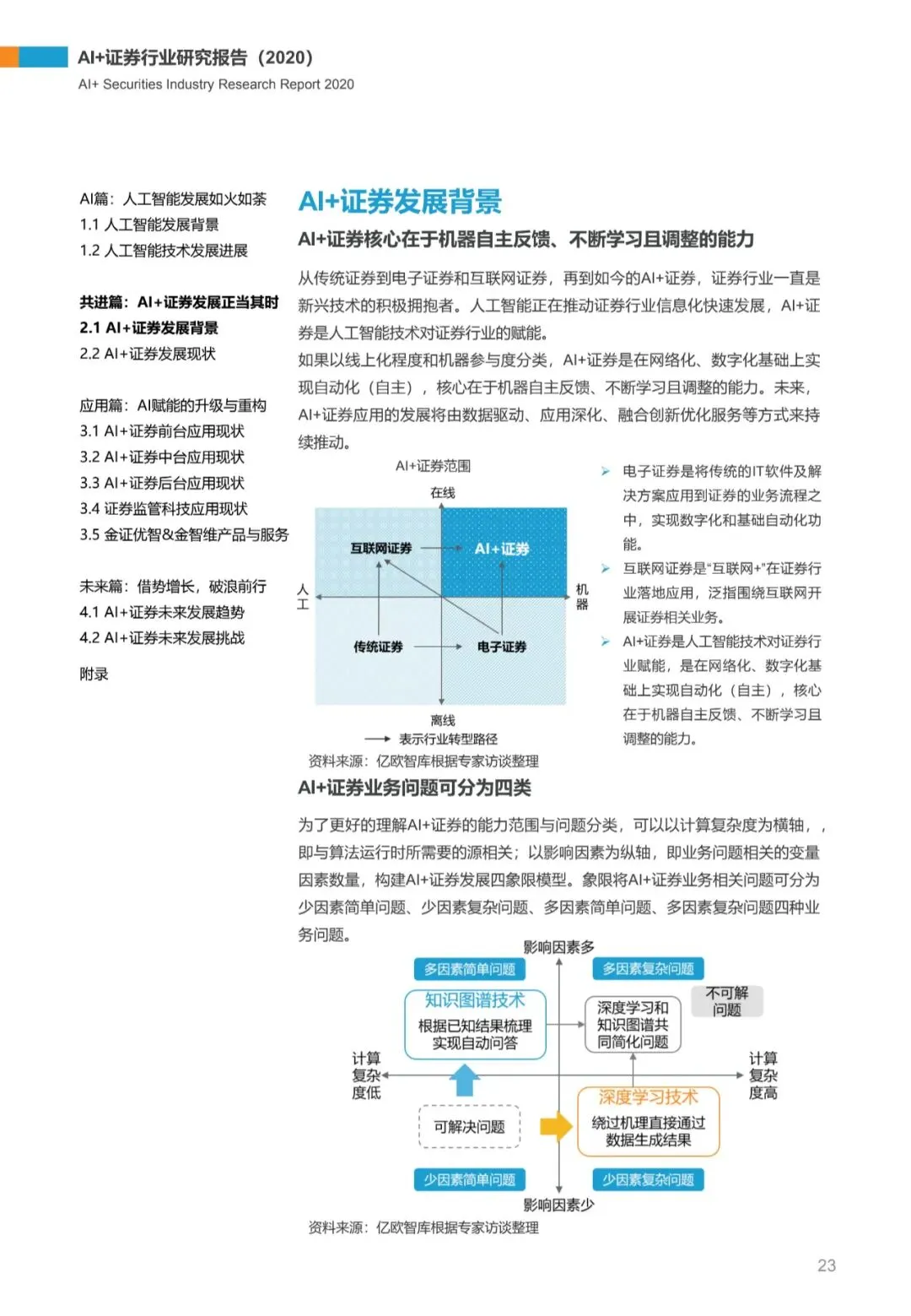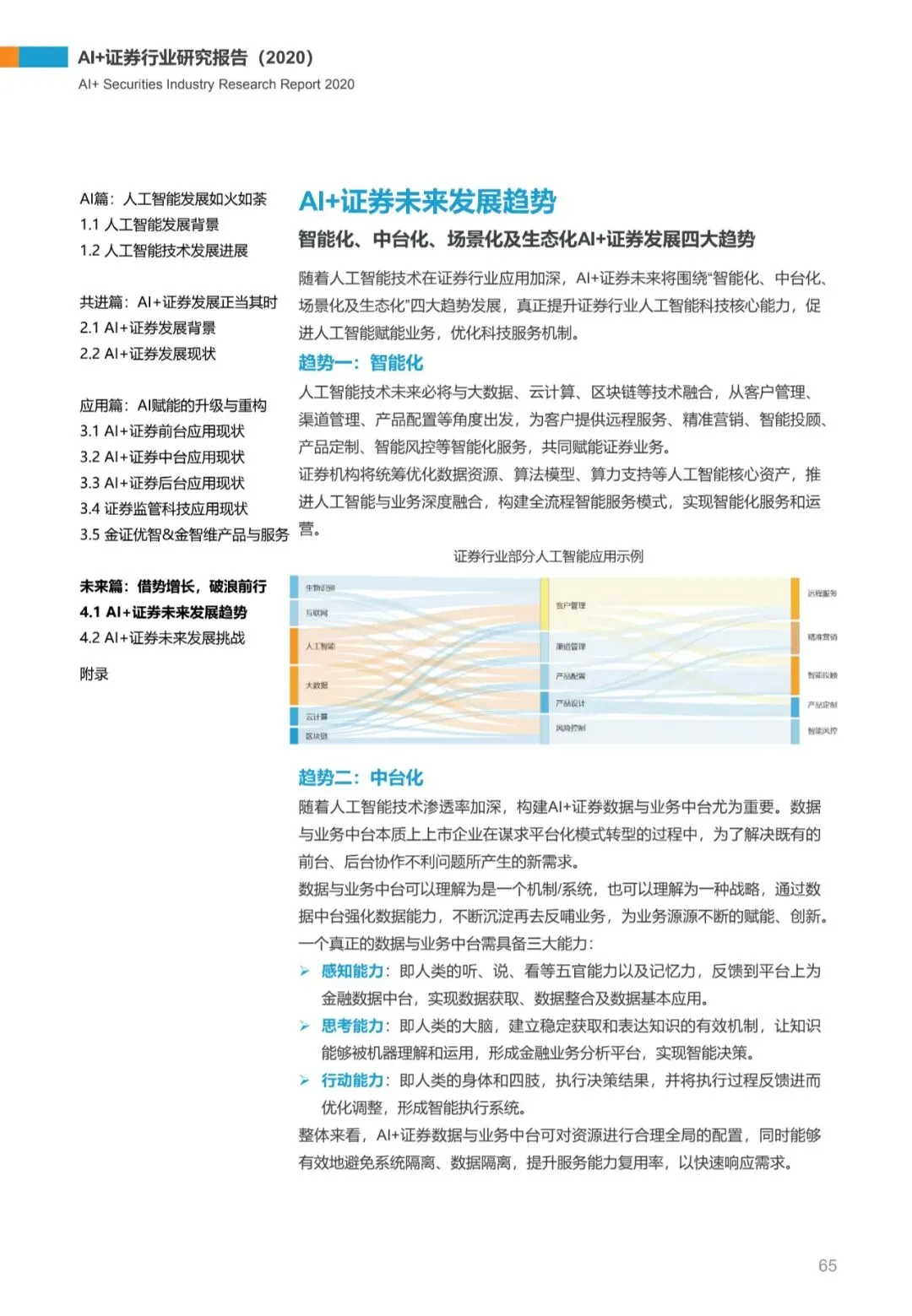 2020年12月10日,《AI+证券行业研究报告(2020)》正式发布。该报告在北京大学汇丰金融研究院执行院长、中国银行业协会首席经济学家巴曙松教授指导下,由金证股份与亿欧智库历时一年时间共同完成。报告通过对人工智能企业、监管机构、证券公司等多个行业的从业专家进行访谈,从不同角度看待AI在证券行业的现状与未来发展,同时辅以大量文献资料作为数据支撑,分析了人工智能发展背景及技术进展,进而阐述了AI+证券发展背景和现状,重点解释了人工智能在证券行业经营过程中的前台、中台、后台以及监管端应用现状。报告认为平台化、场景化、智能化及生态化为AI+证券发展四大趋势,意识鸿沟、数据鸿沟、技术鸿沟、人才鸿沟为AI+证券四大挑战。