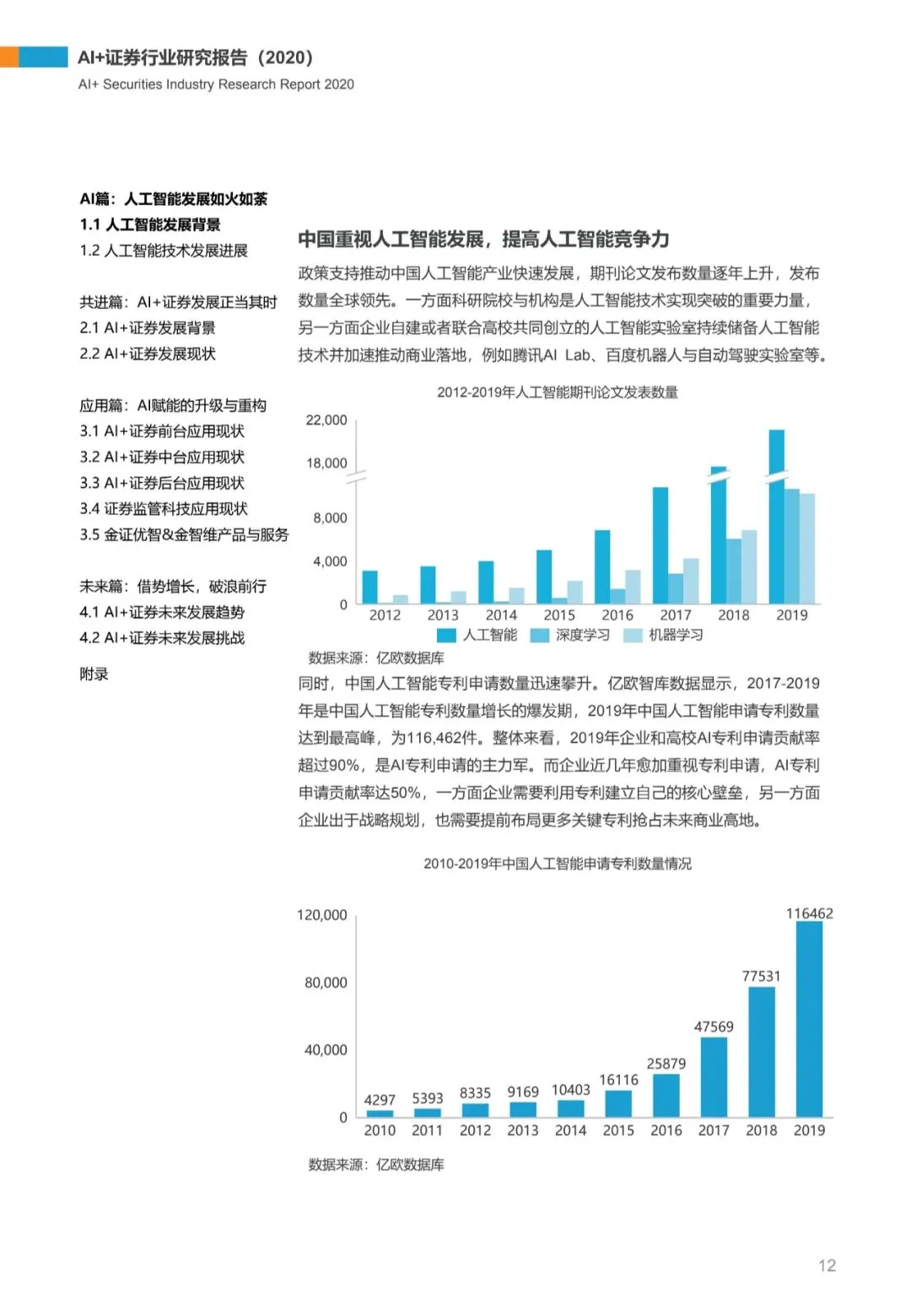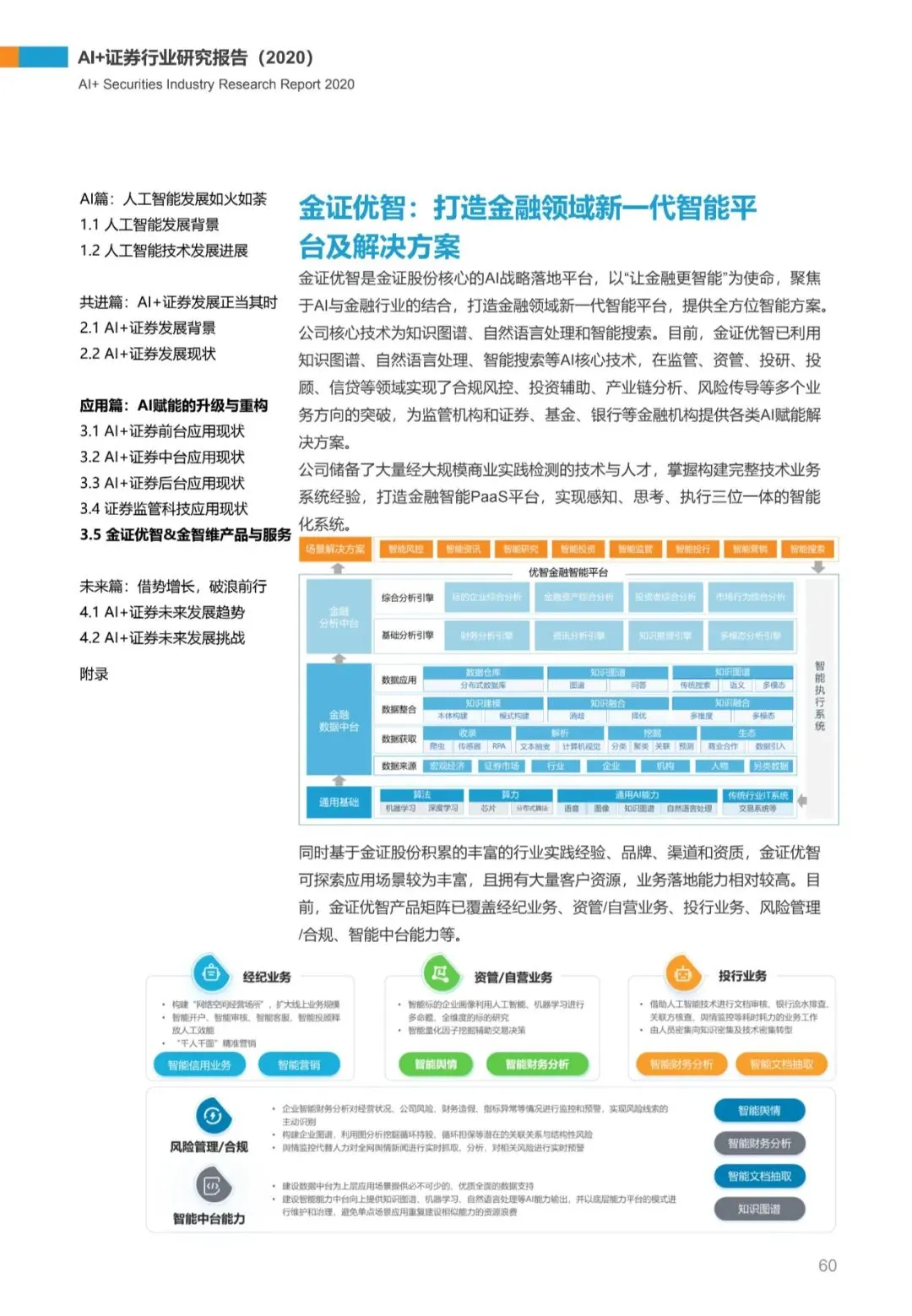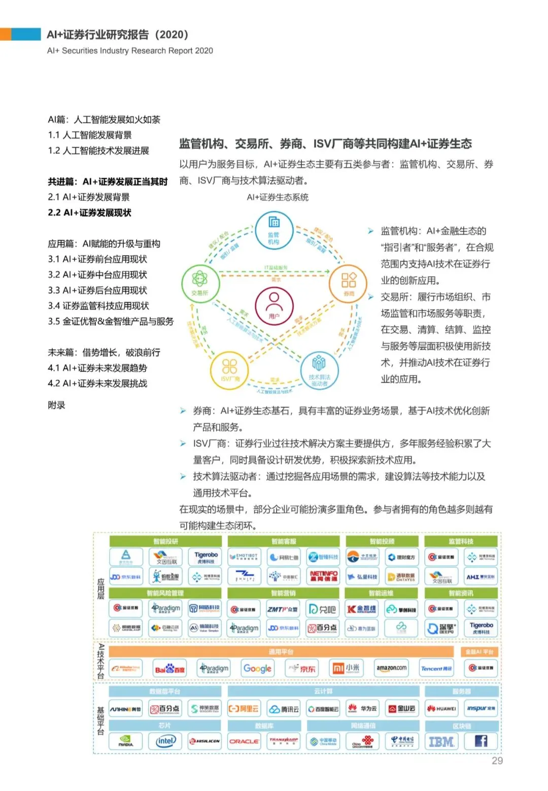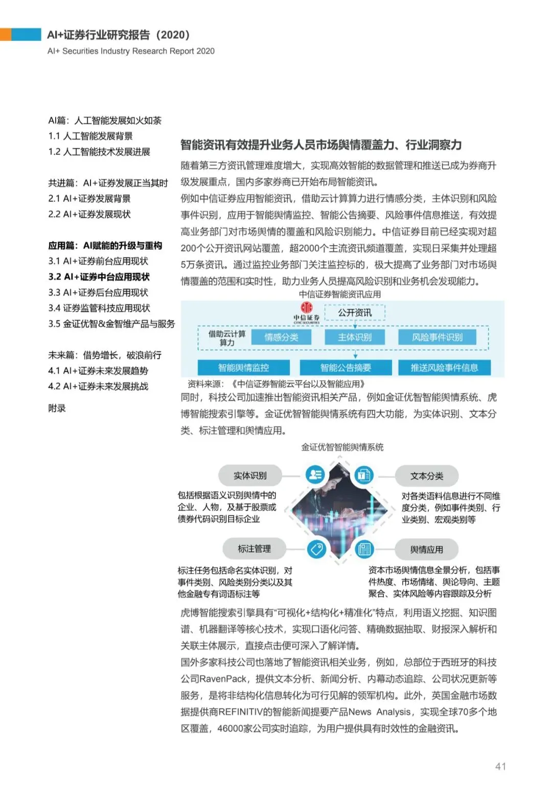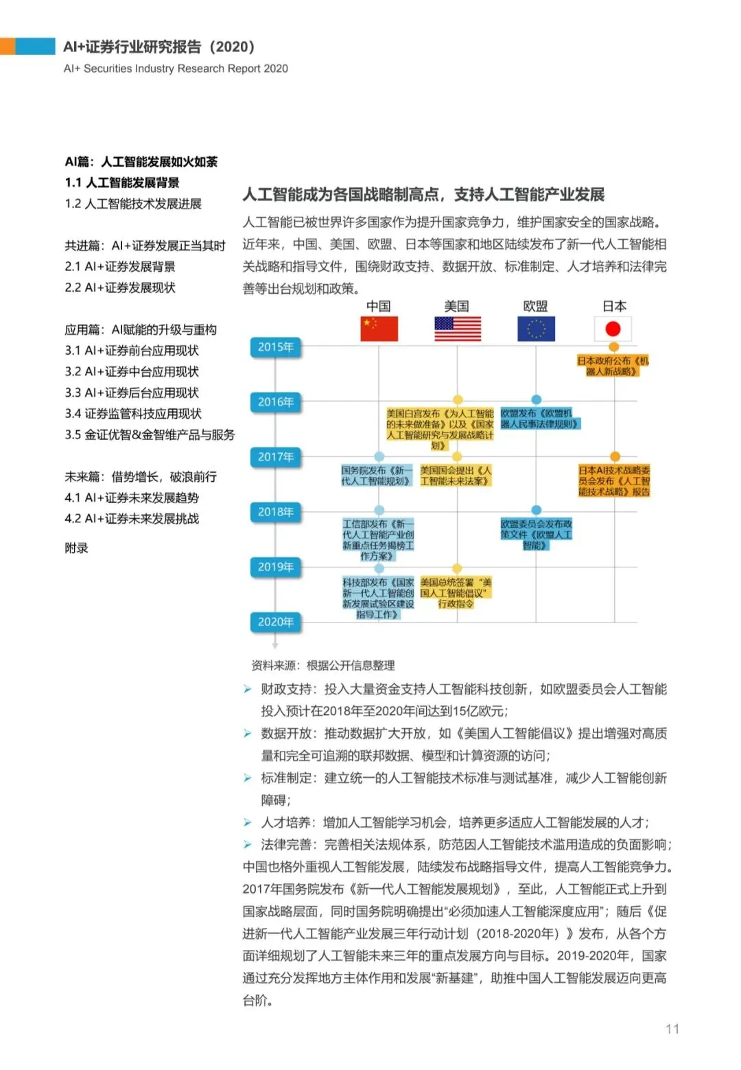 2020年12月10日,《AI+证券行业研究报告(2020)》正式发布。该报告在北京大学汇丰金融研究院执行院长、中国银行业协会首席经济学家巴曙松教授指导下,由金证股份与亿欧智库历时一年时间共同完成。报告通过对人工智能企业、监管机构、证券公司等多个行业的从业专家进行访谈,从不同角度看待AI在证券行业的现状与未来发展,同时辅以大量文献资料作为数据支撑,分析了人工智能发展背景及技术进展,进而阐述了AI+证券发展背景和现状,重点解释了人工智能在证券行业经营过程中的前台、中台、后台以及监管端应用现状。报告认为平台化、场景化、智能化及生态化为AI+证券发展四大趋势,意识鸿沟、数据鸿沟、技术鸿沟、人才鸿沟为AI+证券四大挑战。