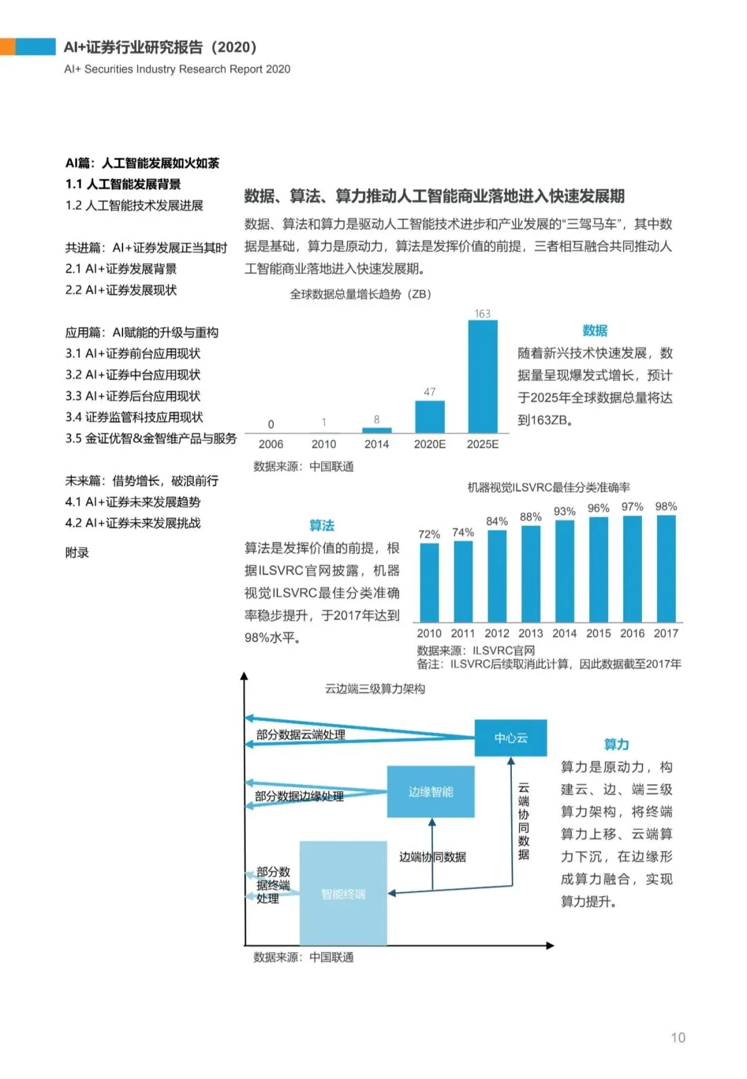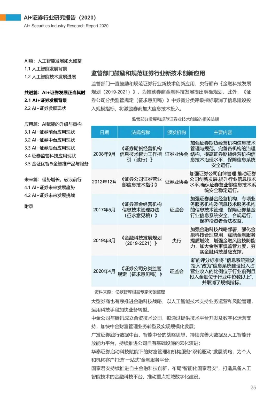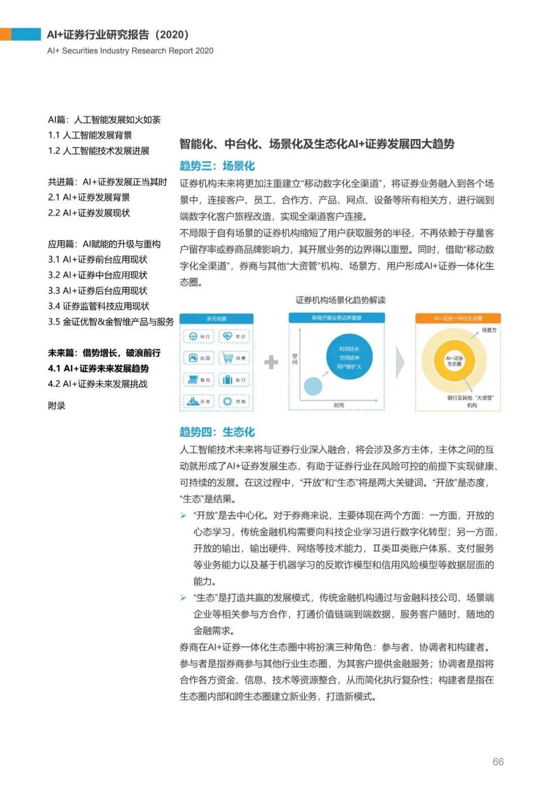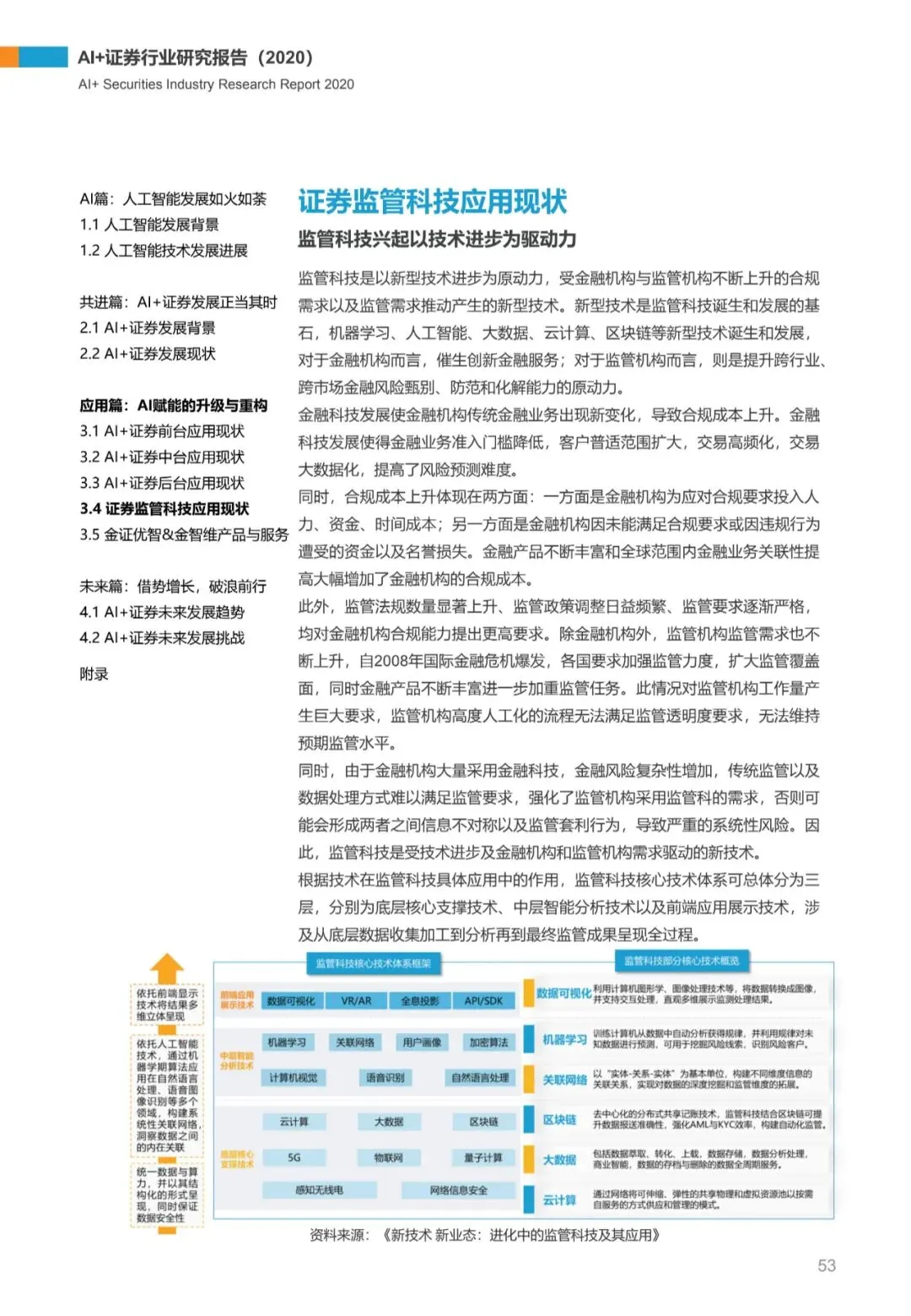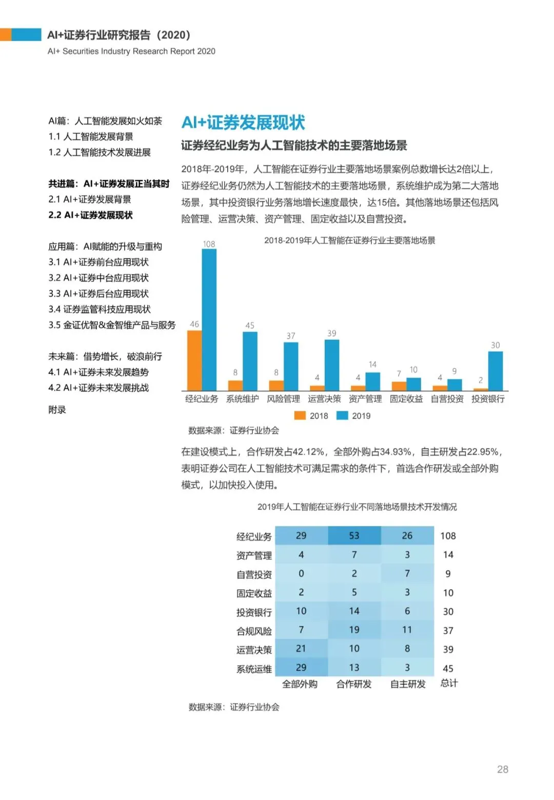 2020年12月10日,《AI+证券行业研究报告(2020)》正式发布。该报告在北京大学汇丰金融研究院执行院长、中国银行业协会首席经济学家巴曙松教授指导下,由金证股份与亿欧智库历时一年时间共同完成。报告通过对人工智能企业、监管机构、证券公司等多个行业的从业专家进行访谈,从不同角度看待AI在证券行业的现状与未来发展,同时辅以大量文献资料作为数据支撑,分析了人工智能发展背景及技术进展,进而阐述了AI+证券发展背景和现状,重点解释了人工智能在证券行业经营过程中的前台、中台、后台以及监管端应用现状。报告认为平台化、场景化、智能化及生态化为AI+证券发展四大趋势,意识鸿沟、数据鸿沟、技术鸿沟、人才鸿沟为AI+证券四大挑战。