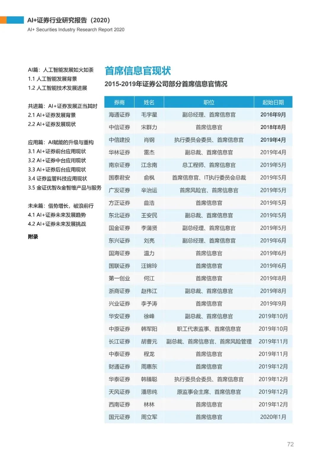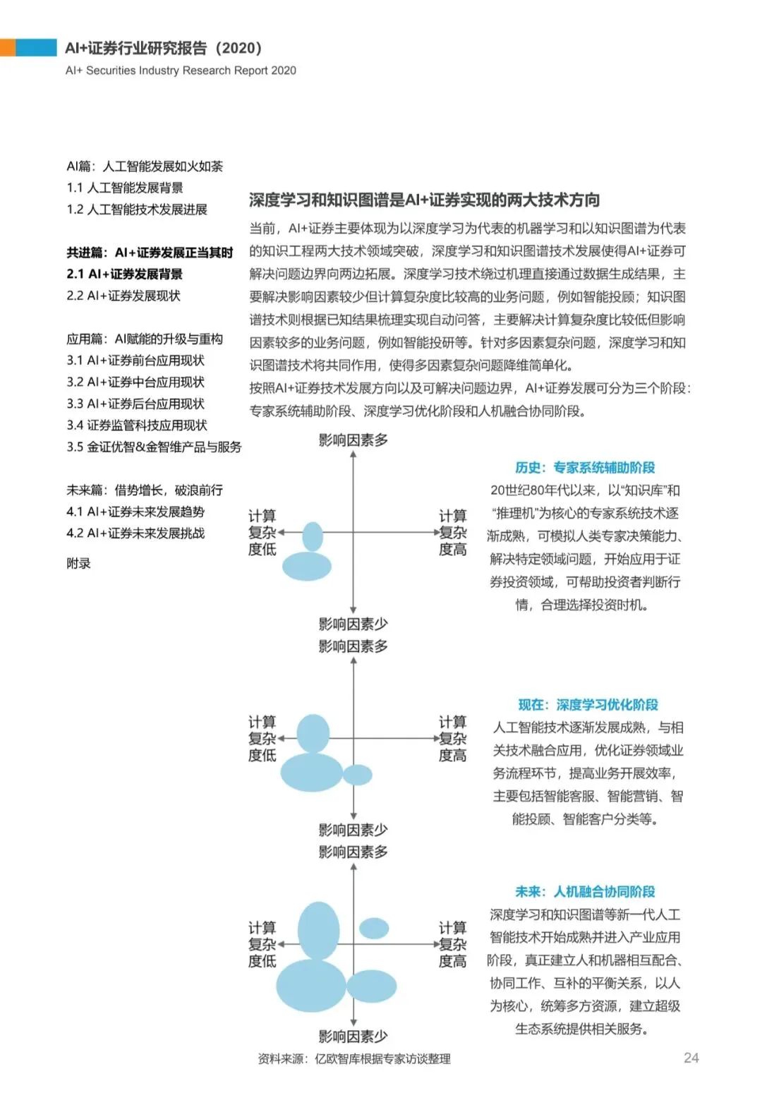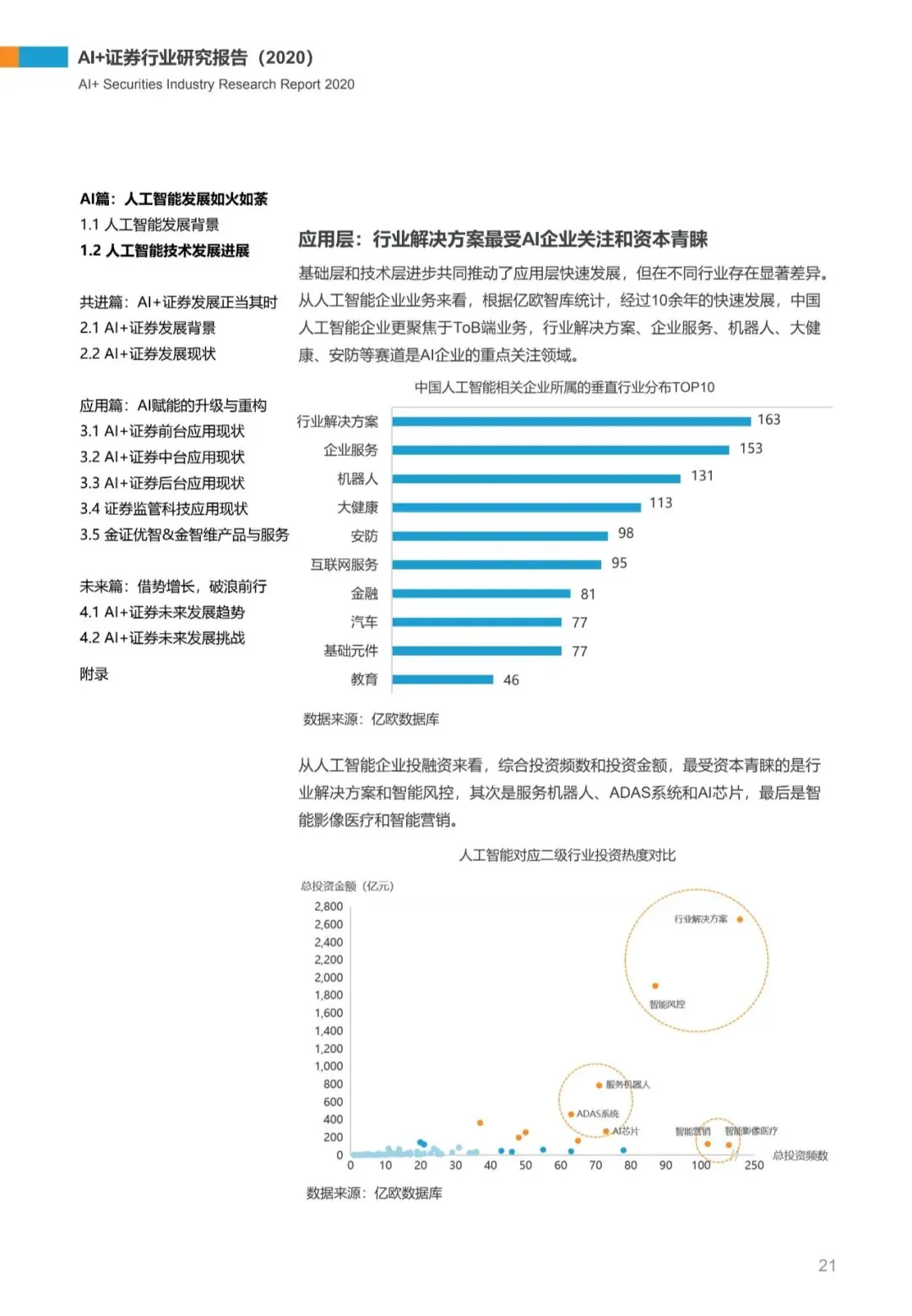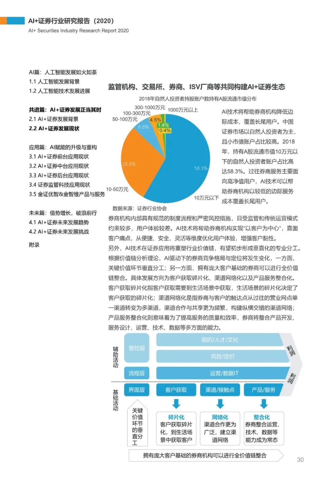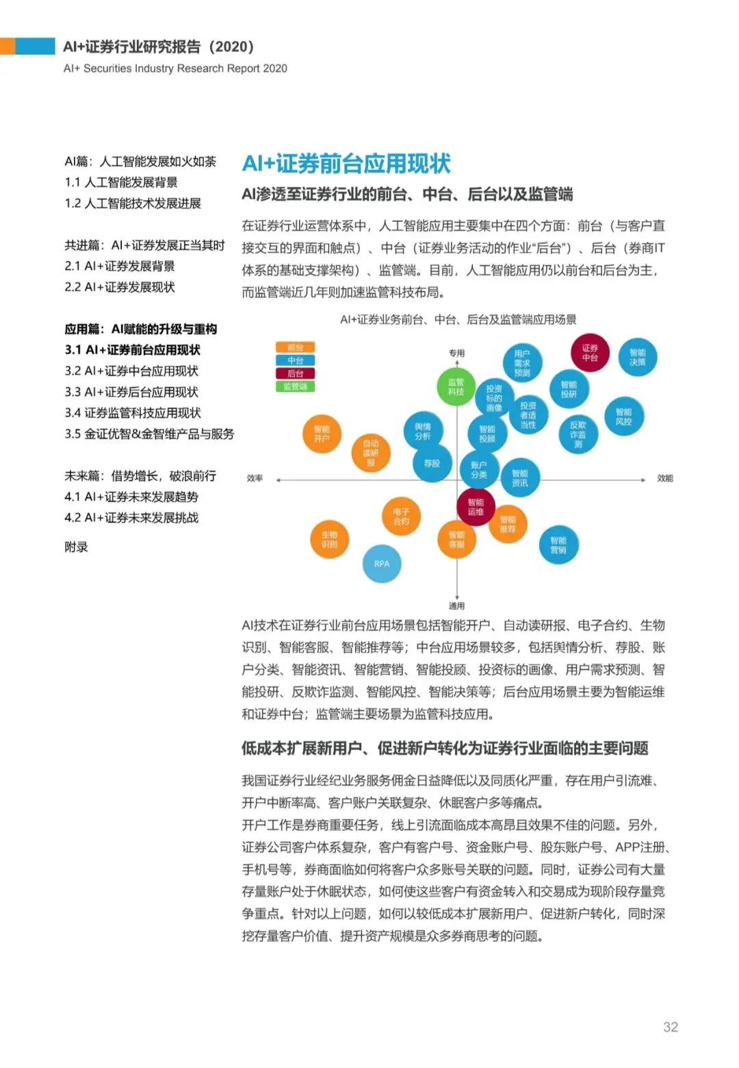 2020年12月10日,《AI+证券行业研究报告(2020)》正式发布。该报告在北京大学汇丰金融研究院执行院长、中国银行业协会首席经济学家巴曙松教授指导下,由金证股份与亿欧智库历时一年时间共同完成。报告通过对人工智能企业、监管机构、证券公司等多个行业的从业专家进行访谈,从不同角度看待AI在证券行业的现状与未来发展,同时辅以大量文献资料作为数据支撑,分析了人工智能发展背景及技术进展,进而阐述了AI+证券发展背景和现状,重点解释了人工智能在证券行业经营过程中的前台、中台、后台以及监管端应用现状。报告认为平台化、场景化、智能化及生态化为AI+证券发展四大趋势,意识鸿沟、数据鸿沟、技术鸿沟、人才鸿沟为AI+证券四大挑战。