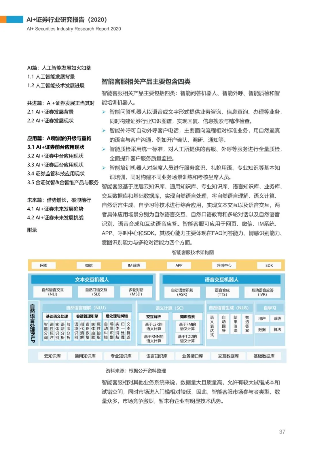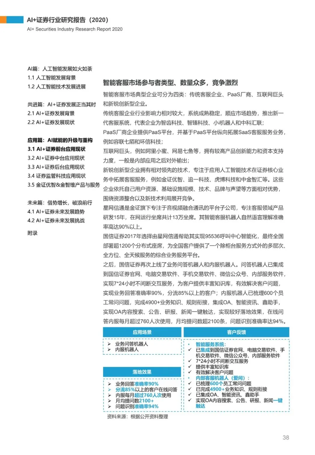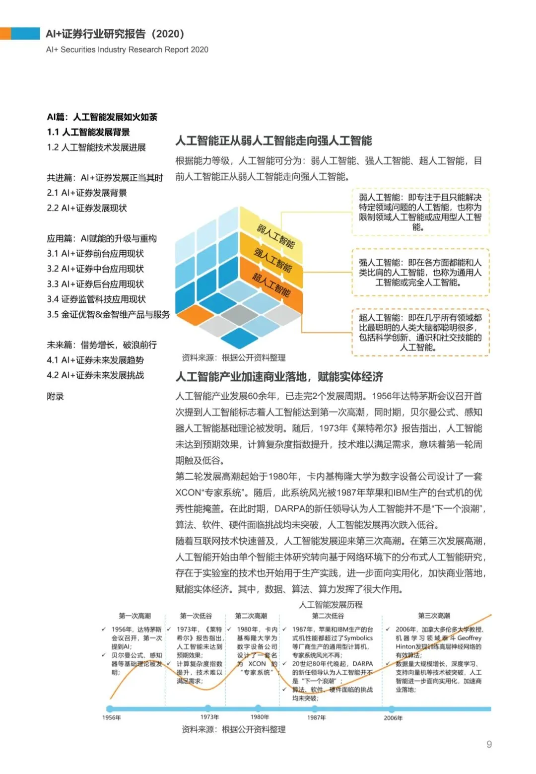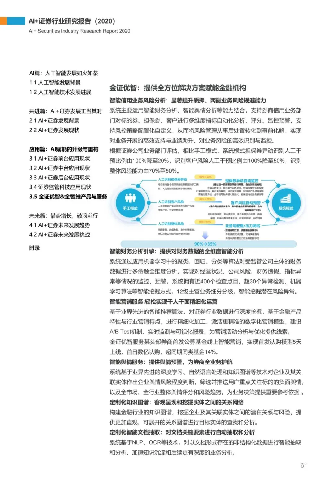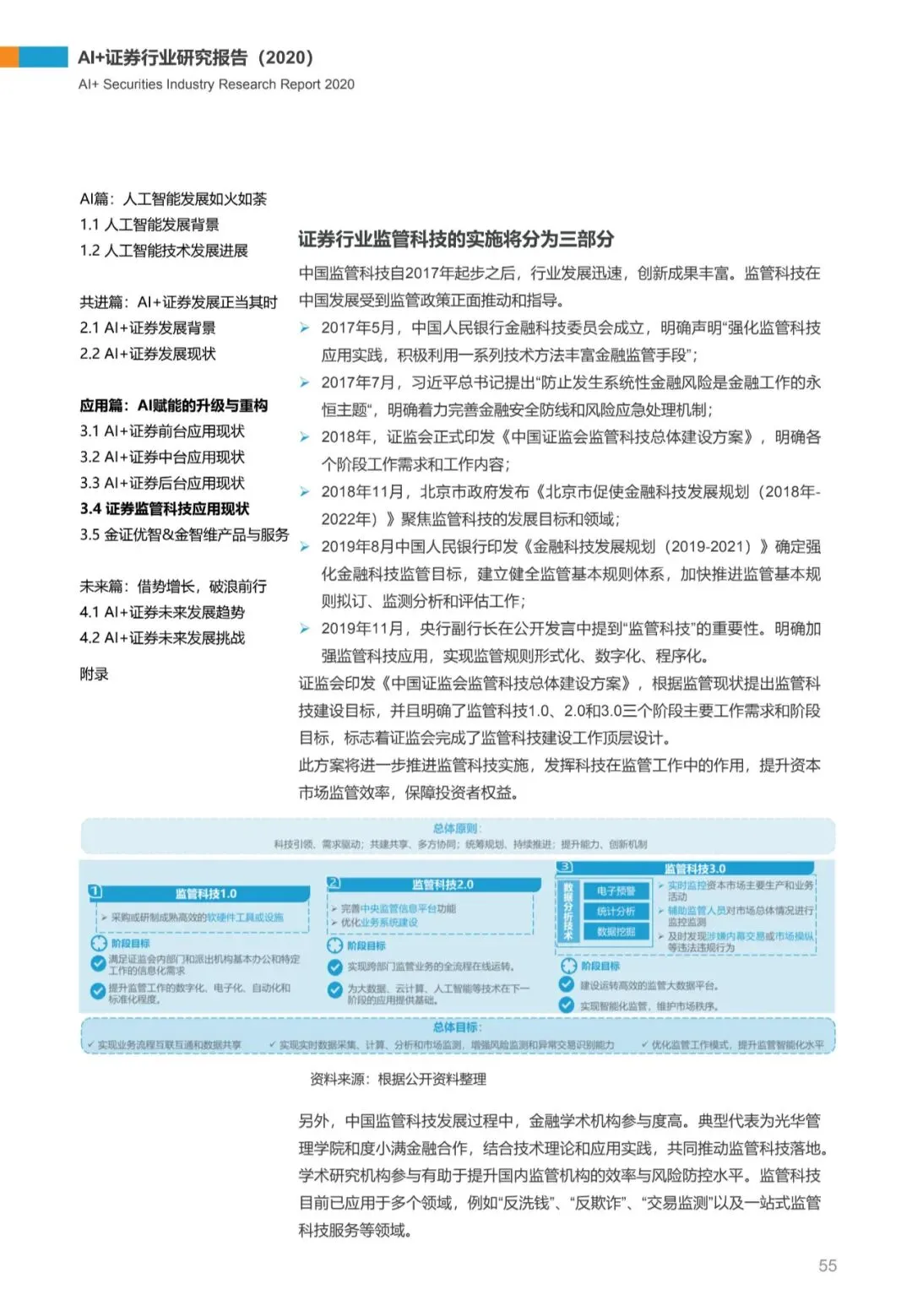 2020年12月10日,《AI+证券行业研究报告(2020)》正式发布。该报告在北京大学汇丰金融研究院执行院长、中国银行业协会首席经济学家巴曙松教授指导下,由金证股份与亿欧智库历时一年时间共同完成。报告通过对人工智能企业、监管机构、证券公司等多个行业的从业专家进行访谈,从不同角度看待AI在证券行业的现状与未来发展,同时辅以大量文献资料作为数据支撑,分析了人工智能发展背景及技术进展,进而阐述了AI+证券发展背景和现状,重点解释了人工智能在证券行业经营过程中的前台、中台、后台以及监管端应用现状。报告认为平台化、场景化、智能化及生态化为AI+证券发展四大趋势,意识鸿沟、数据鸿沟、技术鸿沟、人才鸿沟为AI+证券四大挑战。
