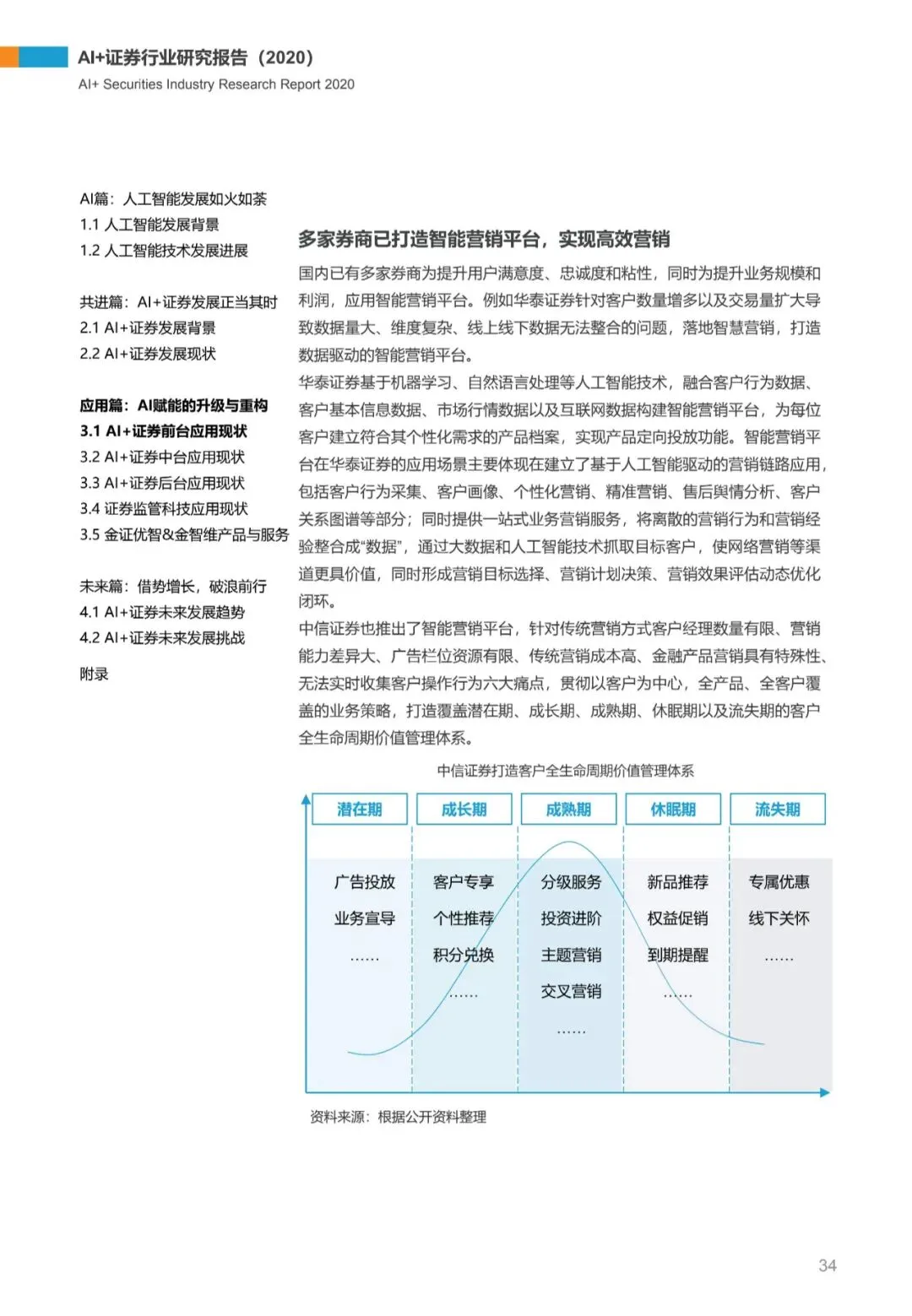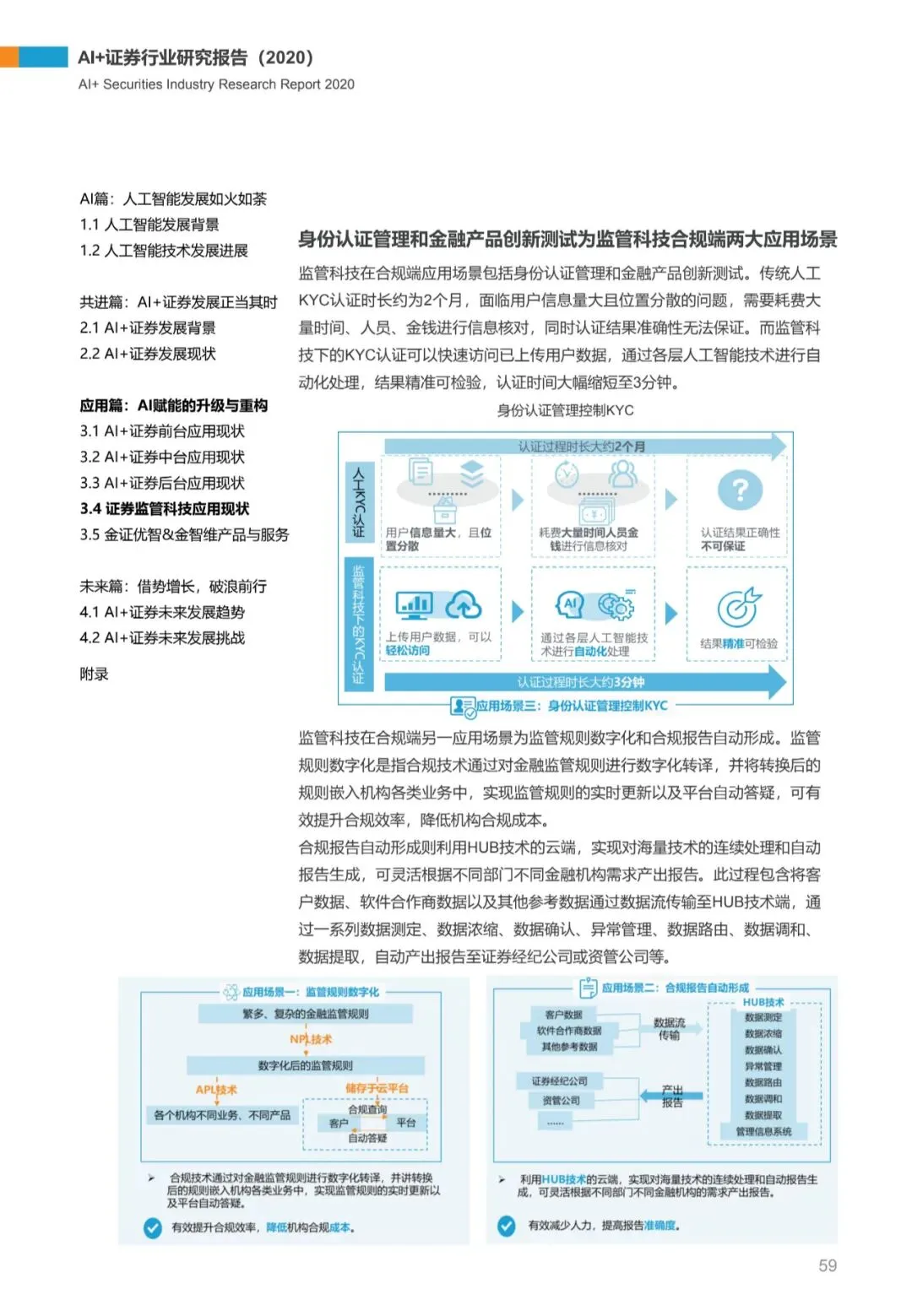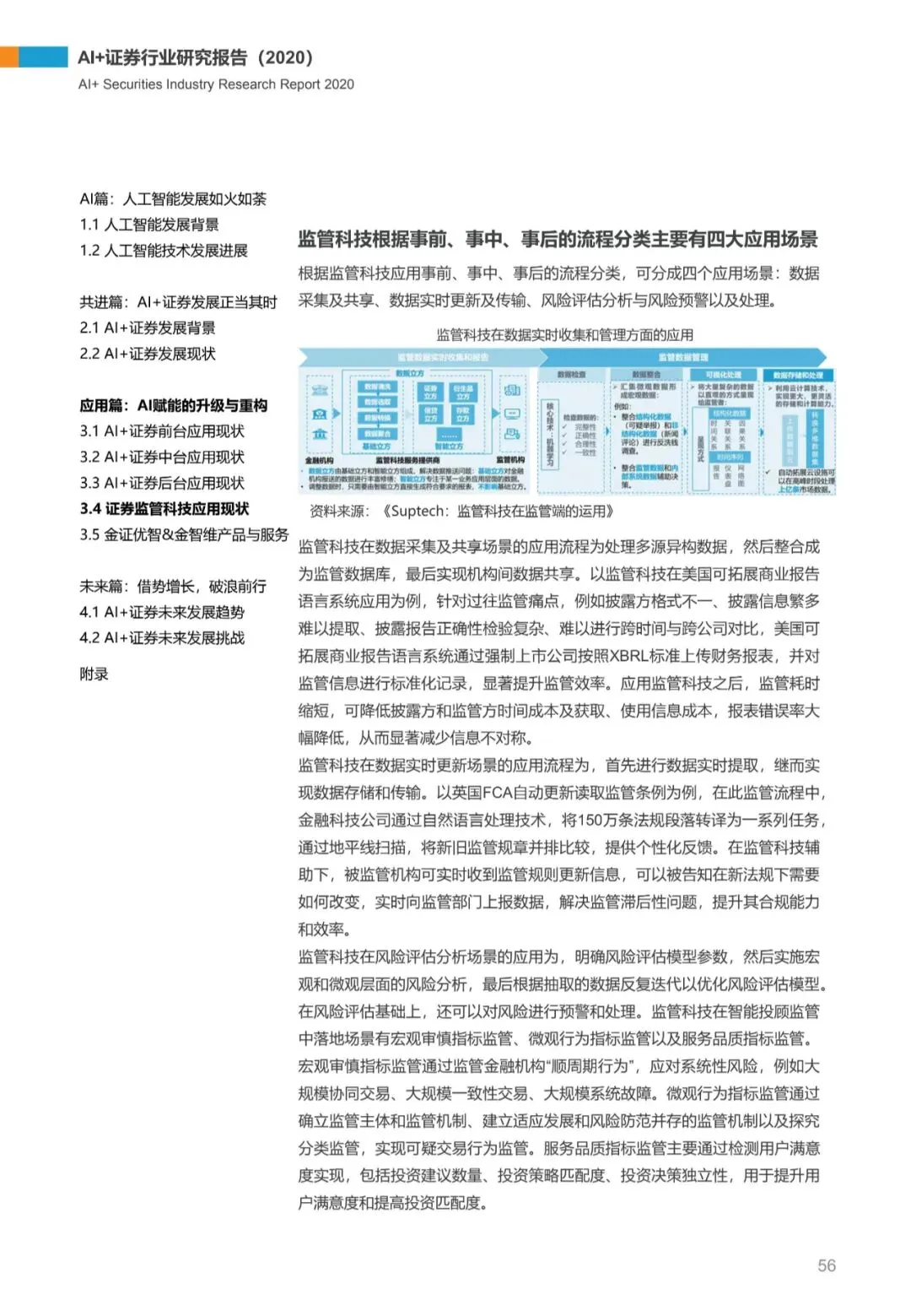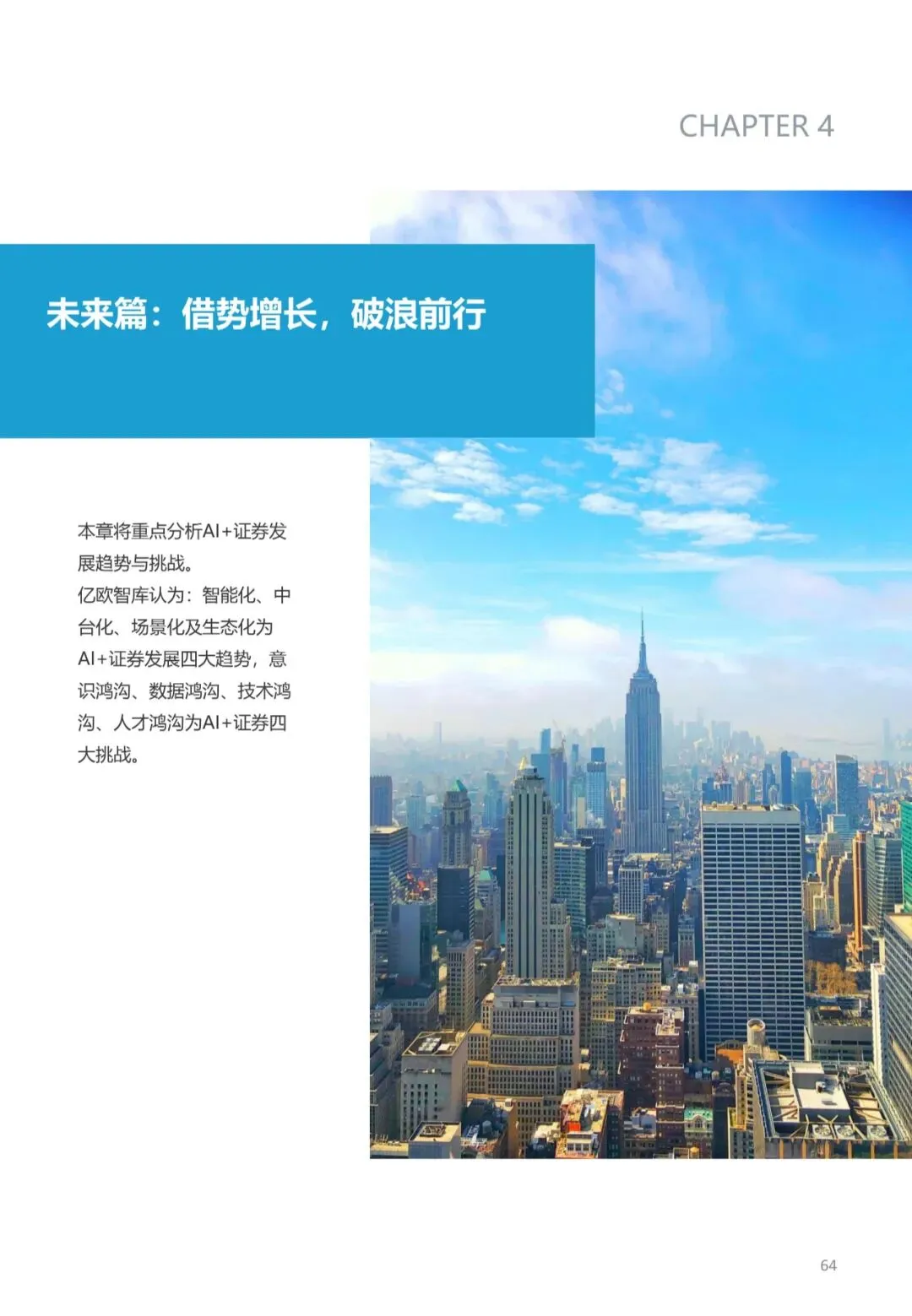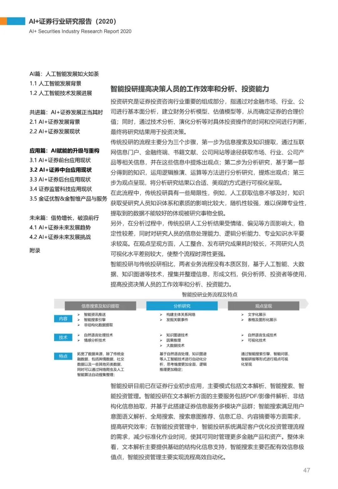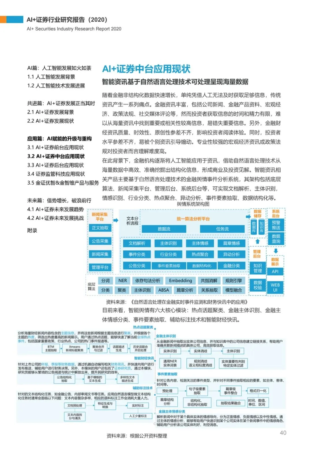 2020年12月10日,《AI+证券行业研究报告(2020)》正式发布。该报告在北京大学汇丰金融研究院执行院长、中国银行业协会首席经济学家巴曙松教授指导下,由金证股份与亿欧智库历时一年时间共同完成。报告通过对人工智能企业、监管机构、证券公司等多个行业的从业专家进行访谈,从不同角度看待AI在证券行业的现状与未来发展,同时辅以大量文献资料作为数据支撑,分析了人工智能发展背景及技术进展,进而阐述了AI+证券发展背景和现状,重点解释了人工智能在证券行业经营过程中的前台、中台、后台以及监管端应用现状。报告认为平台化、场景化、智能化及生态化为AI+证券发展四大趋势,意识鸿沟、数据鸿沟、技术鸿沟、人才鸿沟为AI+证券四大挑战。