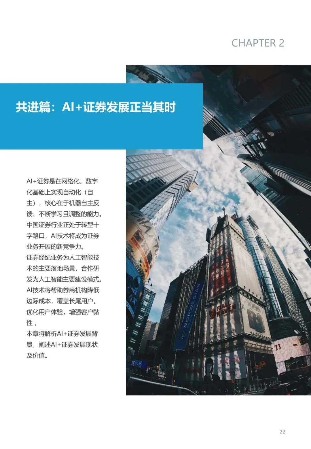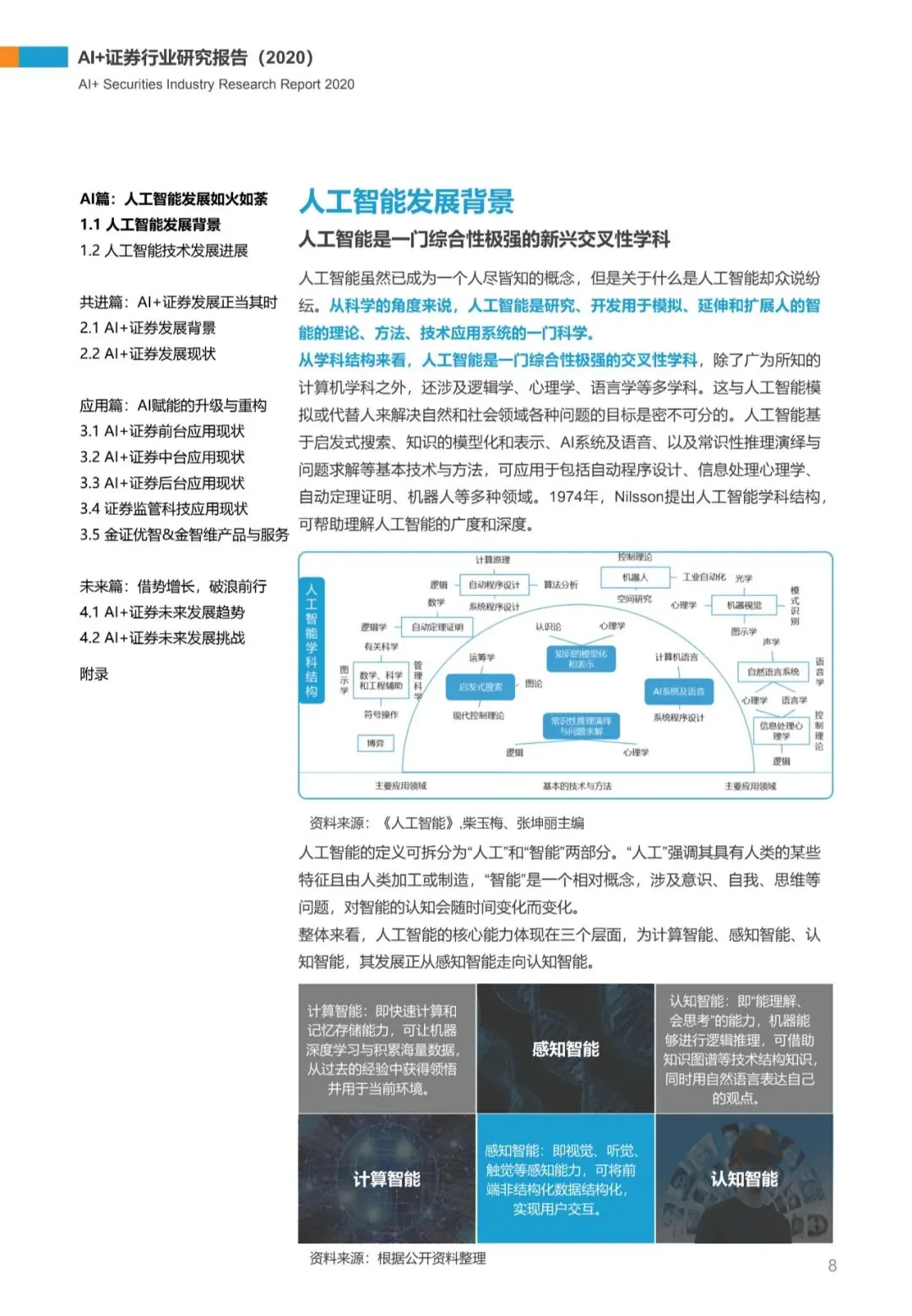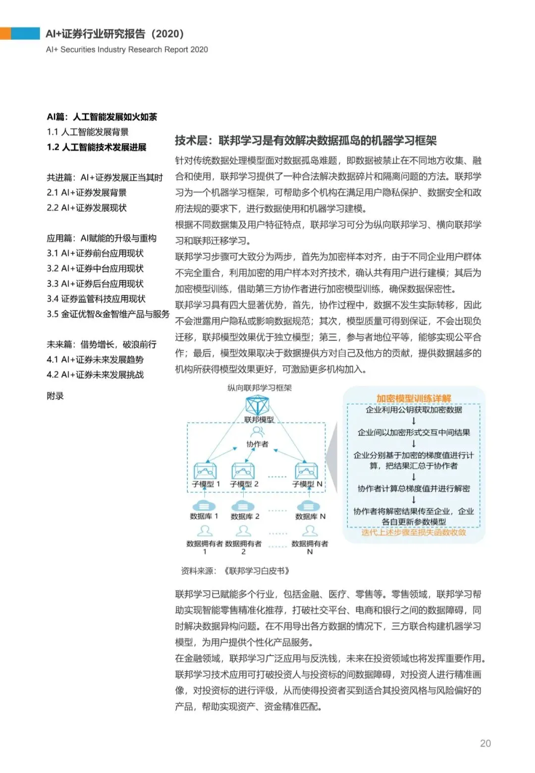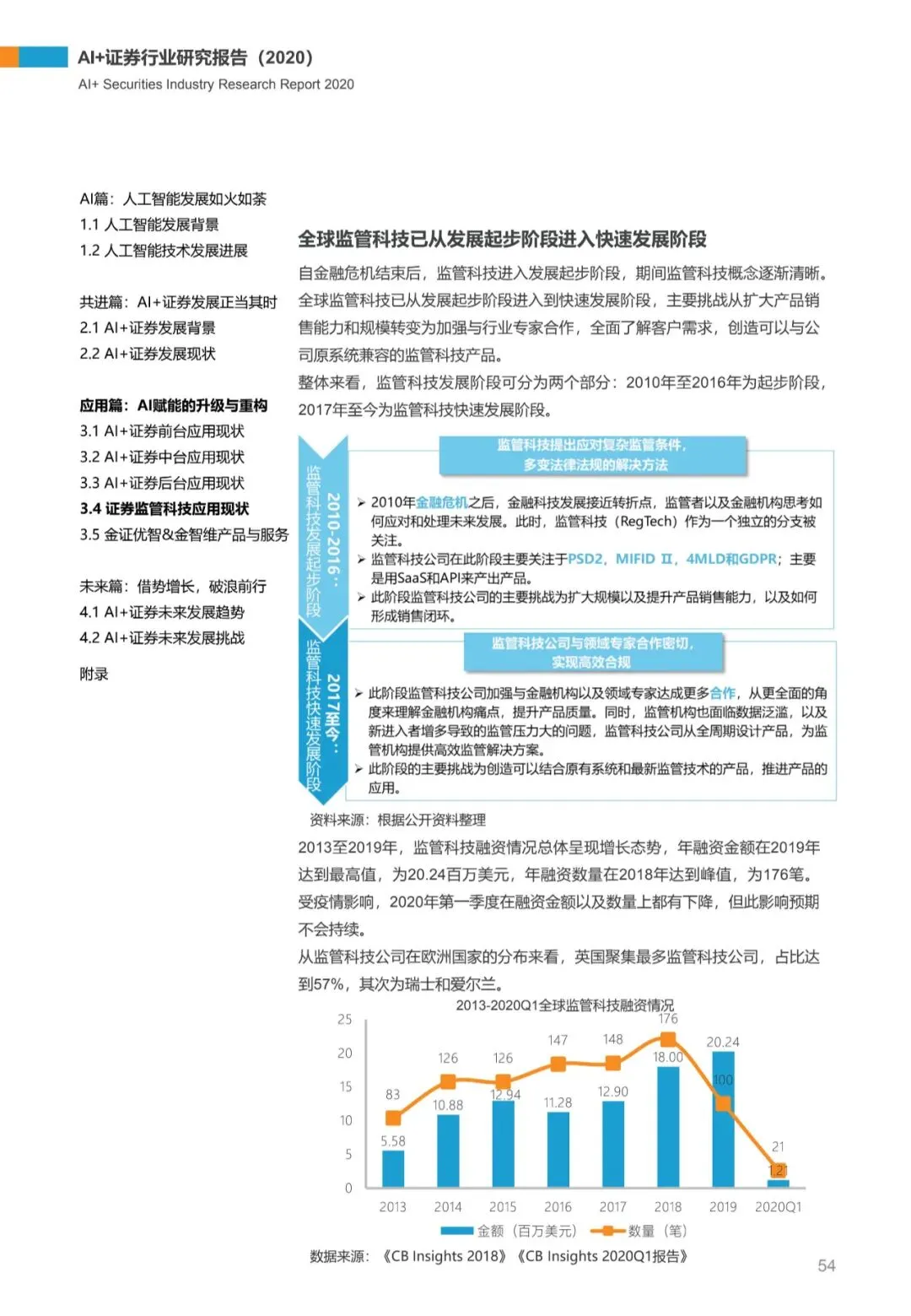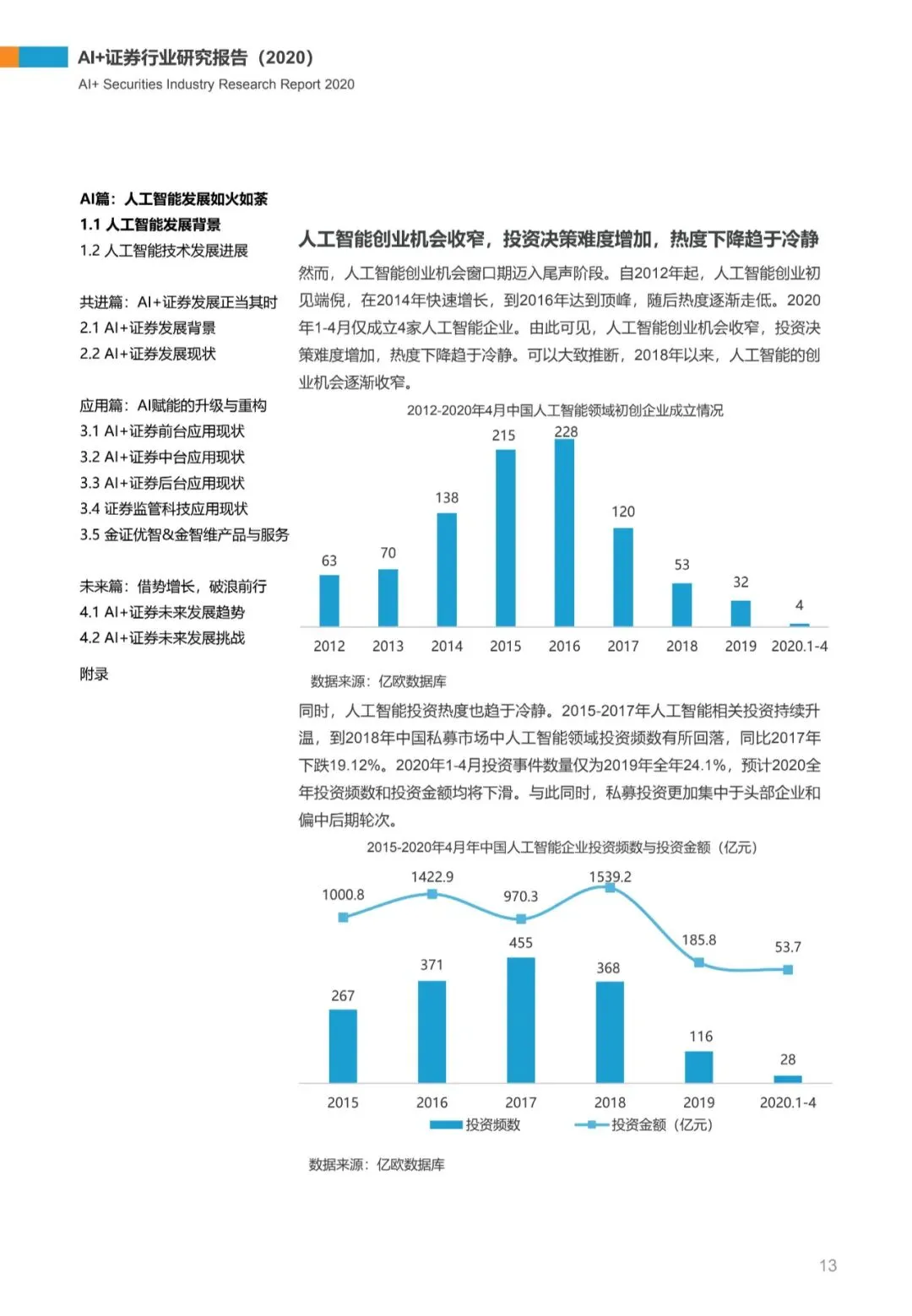 2020年12月10日,《AI+证券行业研究报告(2020)》正式发布。该报告在北京大学汇丰金融研究院执行院长、中国银行业协会首席经济学家巴曙松教授指导下,由金证股份与亿欧智库历时一年时间共同完成。报告通过对人工智能企业、监管机构、证券公司等多个行业的从业专家进行访谈,从不同角度看待AI在证券行业的现状与未来发展,同时辅以大量文献资料作为数据支撑,分析了人工智能发展背景及技术进展,进而阐述了AI+证券发展背景和现状,重点解释了人工智能在证券行业经营过程中的前台、中台、后台以及监管端应用现状。报告认为平台化、场景化、智能化及生态化为AI+证券发展四大趋势,意识鸿沟、数据鸿沟、技术鸿沟、人才鸿沟为AI+证券四大挑战。