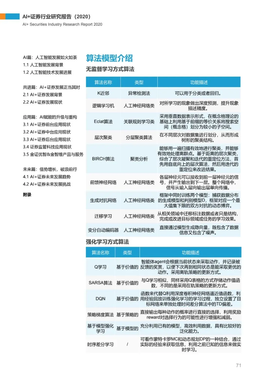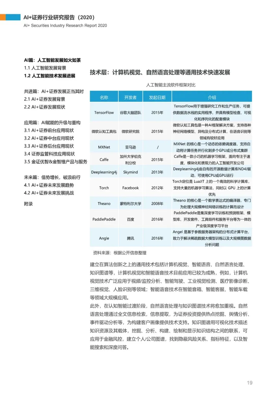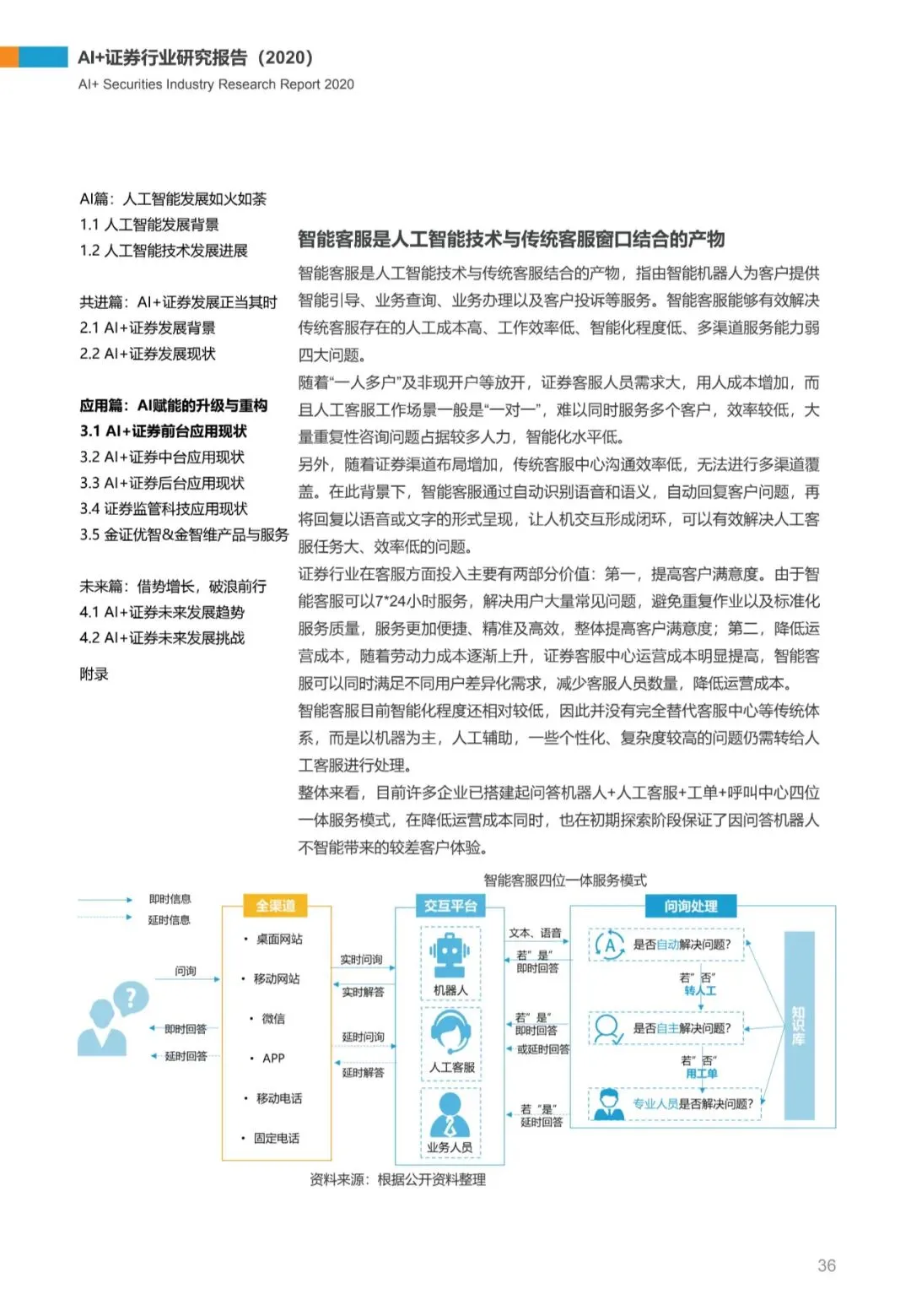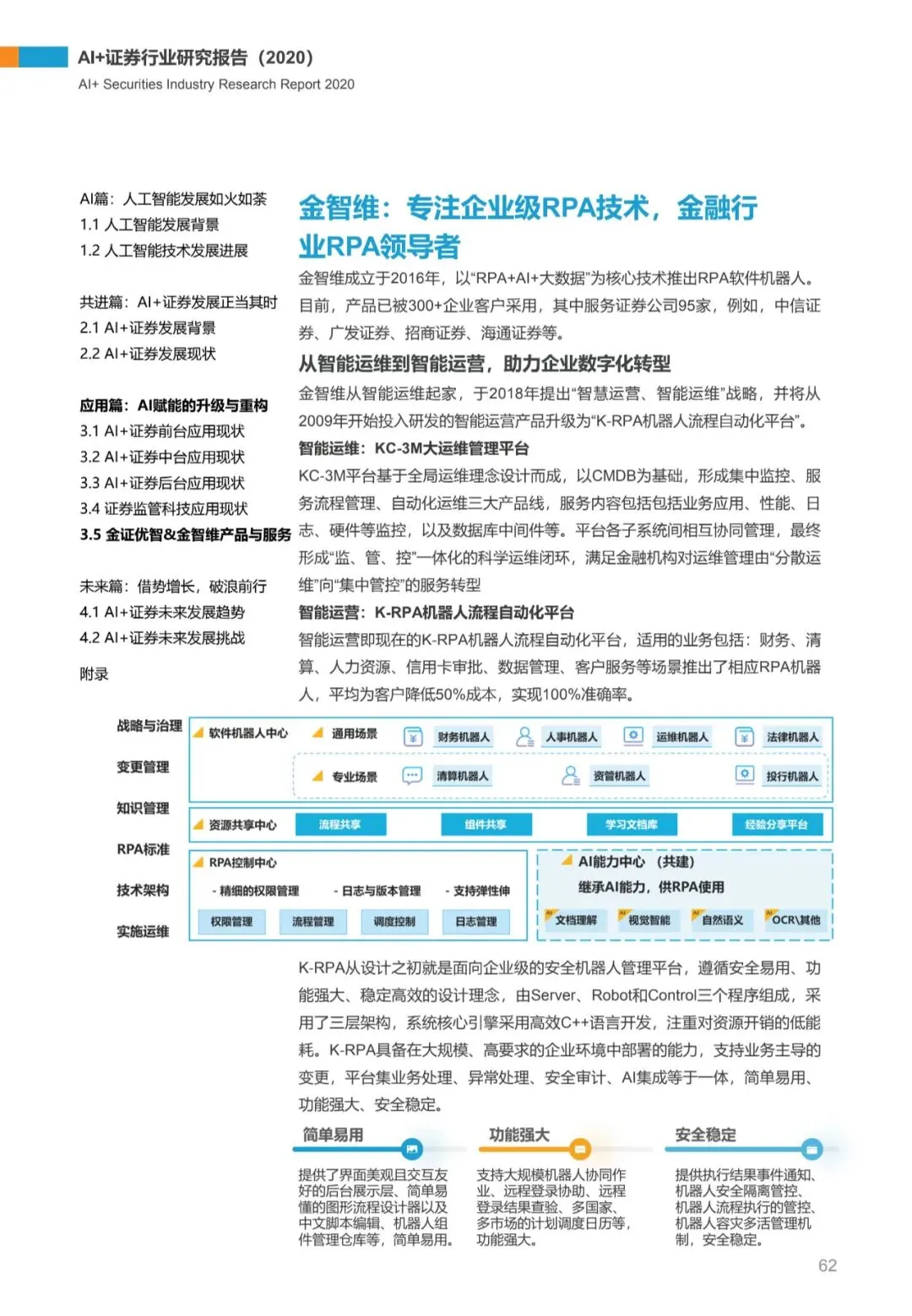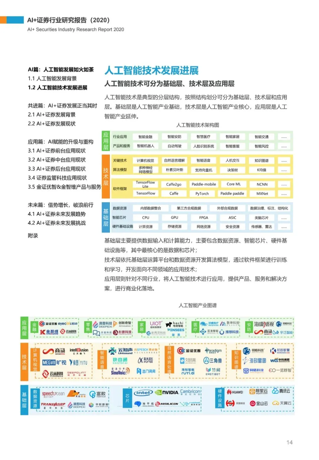 2020年12月10日,《AI+证券行业研究报告(2020)》正式发布。该报告在北京大学汇丰金融研究院执行院长、中国银行业协会首席经济学家巴曙松教授指导下,由金证股份与亿欧智库历时一年时间共同完成。报告通过对人工智能企业、监管机构、证券公司等多个行业的从业专家进行访谈,从不同角度看待AI在证券行业的现状与未来发展,同时辅以大量文献资料作为数据支撑,分析了人工智能发展背景及技术进展,进而阐述了AI+证券发展背景和现状,重点解释了人工智能在证券行业经营过程中的前台、中台、后台以及监管端应用现状。报告认为平台化、场景化、智能化及生态化为AI+证券发展四大趋势,意识鸿沟、数据鸿沟、技术鸿沟、人才鸿沟为AI+证券四大挑战。