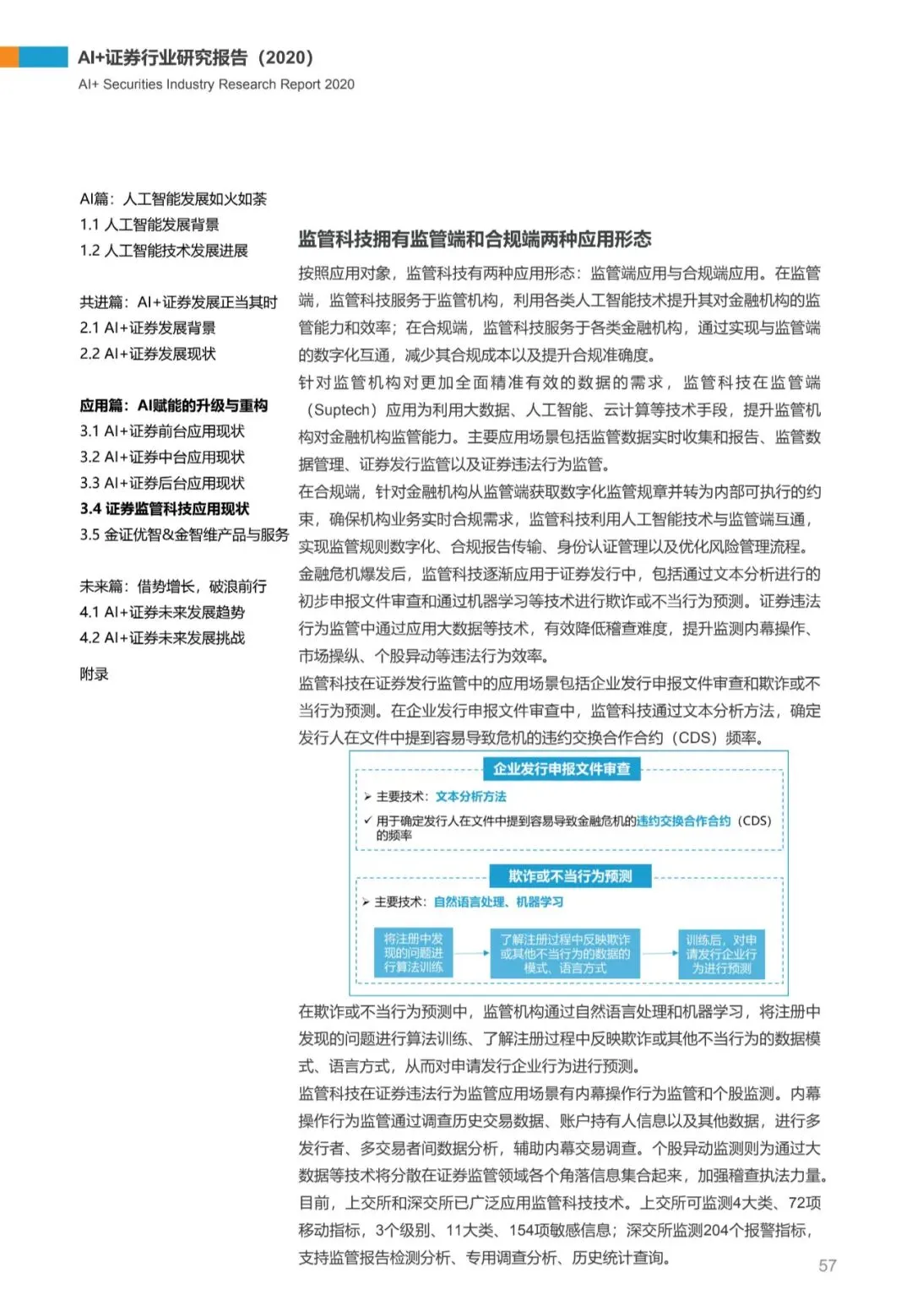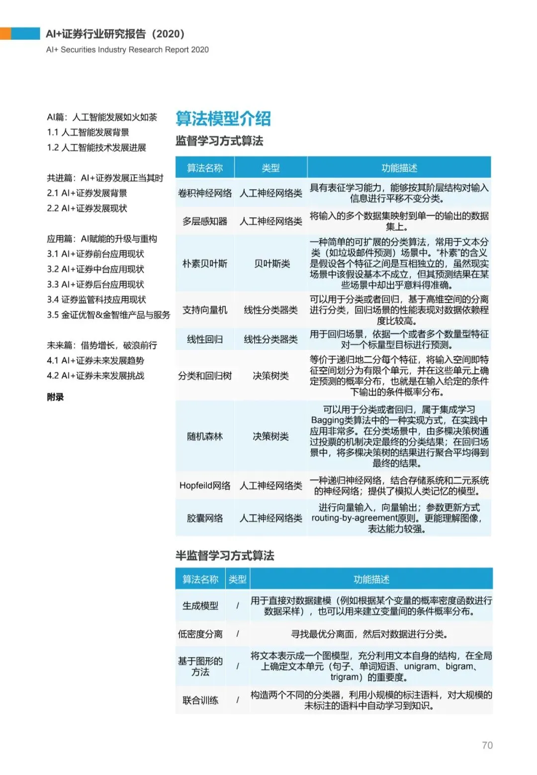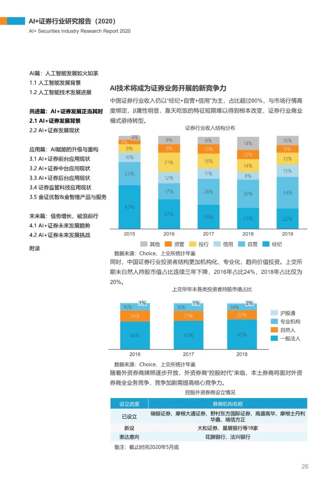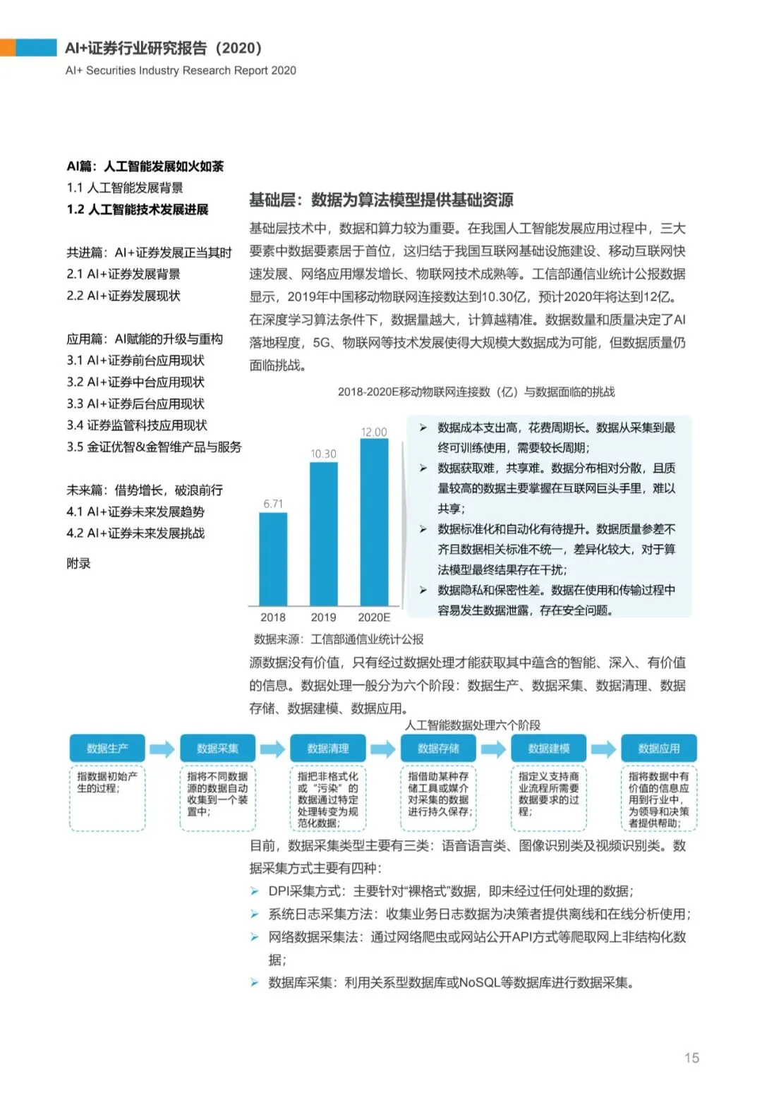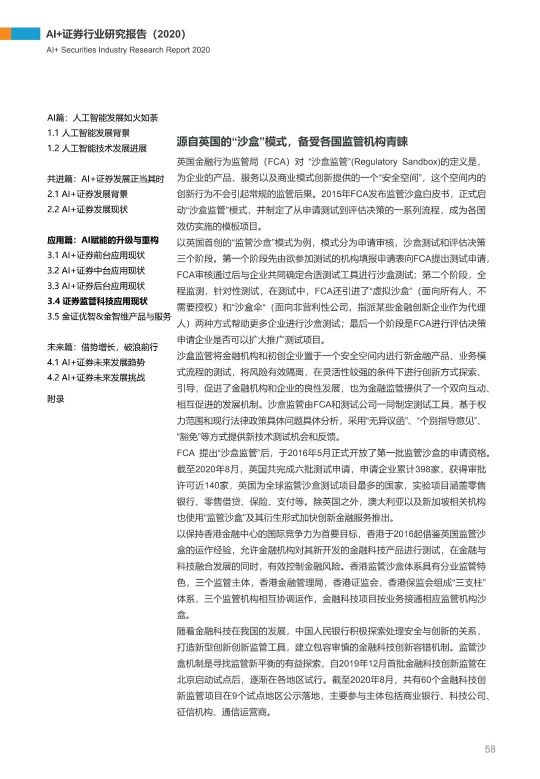 2020年12月10日,《AI+证券行业研究报告(2020)》正式发布。该报告在北京大学汇丰金融研究院执行院长、中国银行业协会首席经济学家巴曙松教授指导下,由金证股份与亿欧智库历时一年时间共同完成。报告通过对人工智能企业、监管机构、证券公司等多个行业的从业专家进行访谈,从不同角度看待AI在证券行业的现状与未来发展,同时辅以大量文献资料作为数据支撑,分析了人工智能发展背景及技术进展,进而阐述了AI+证券发展背景和现状,重点解释了人工智能在证券行业经营过程中的前台、中台、后台以及监管端应用现状。报告认为平台化、场景化、智能化及生态化为AI+证券发展四大趋势,意识鸿沟、数据鸿沟、技术鸿沟、人才鸿沟为AI+证券四大挑战。