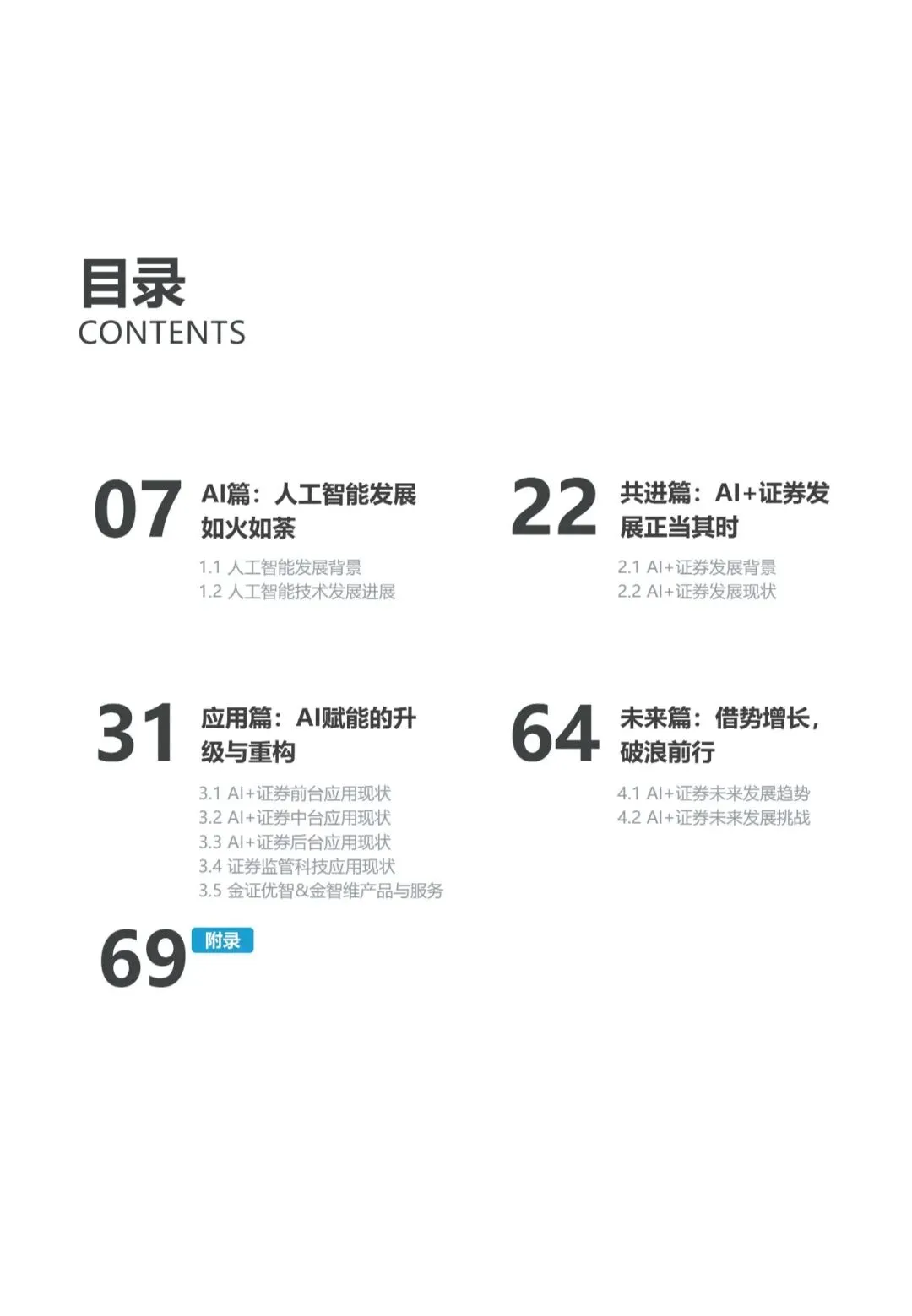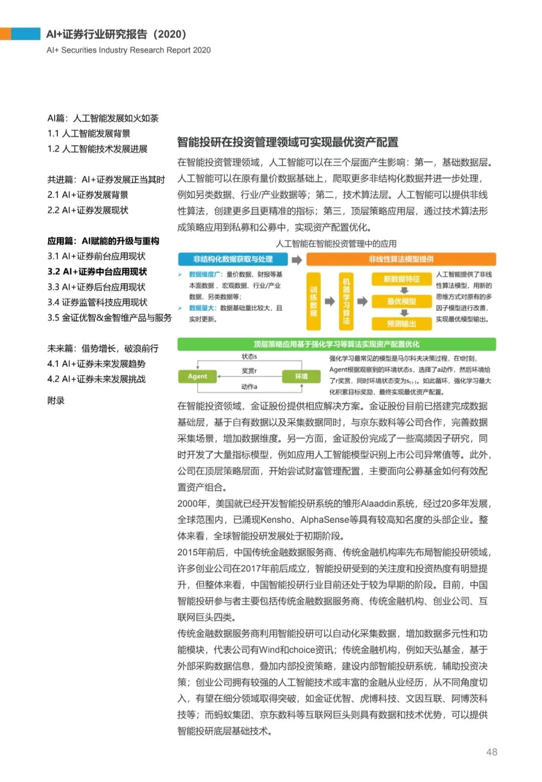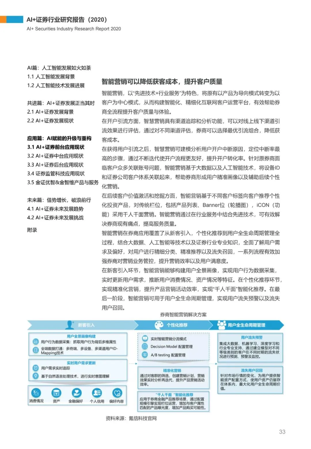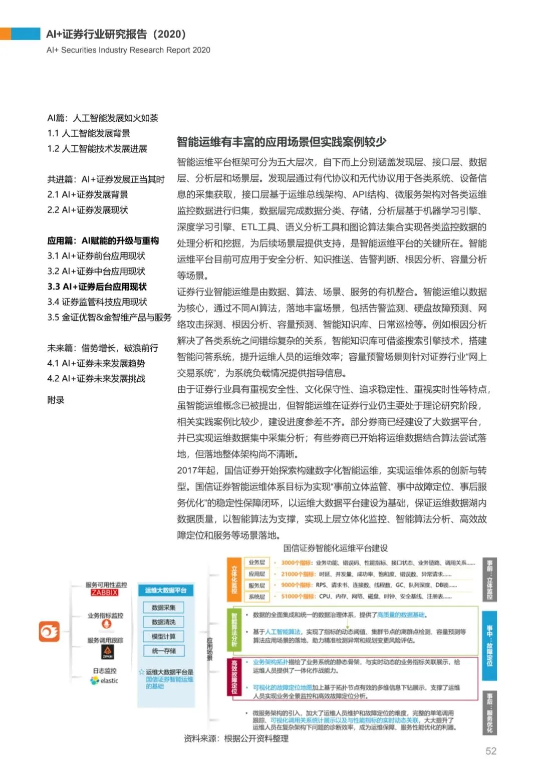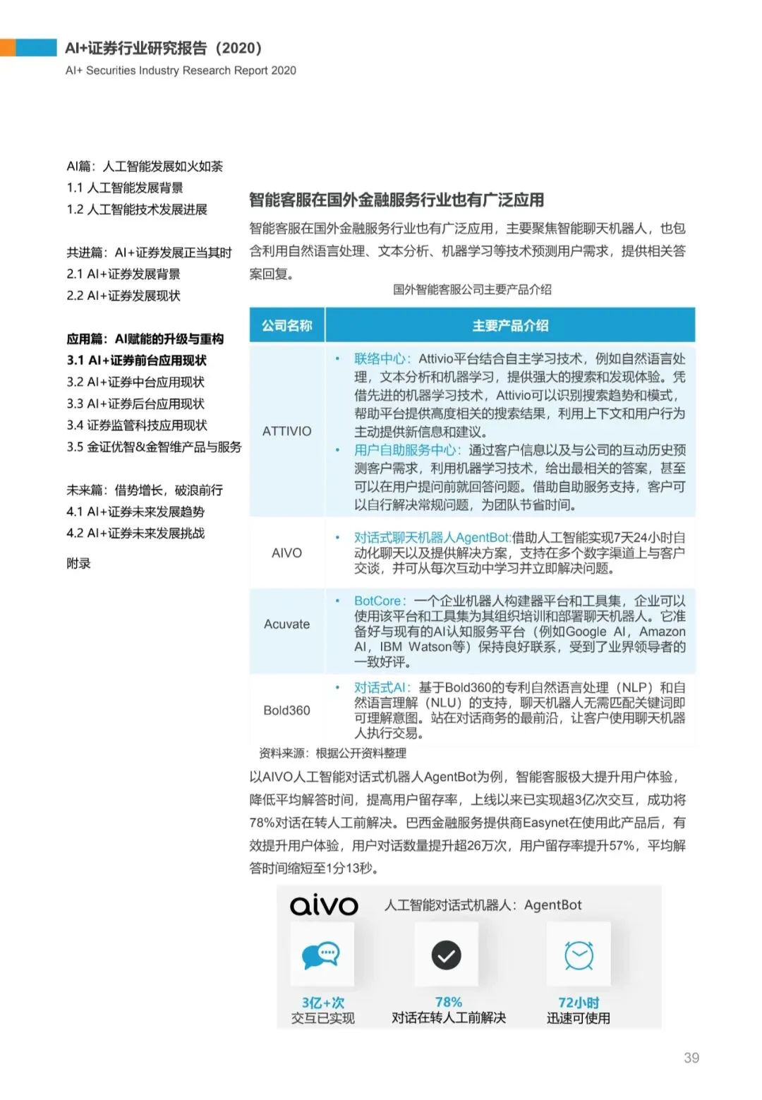 2020年12月10日,《AI+证券行业研究报告(2020)》正式发布。该报告在北京大学汇丰金融研究院执行院长、中国银行业协会首席经济学家巴曙松教授指导下,由金证股份与亿欧智库历时一年时间共同完成。报告通过对人工智能企业、监管机构、证券公司等多个行业的从业专家进行访谈,从不同角度看待AI在证券行业的现状与未来发展,同时辅以大量文献资料作为数据支撑,分析了人工智能发展背景及技术进展,进而阐述了AI+证券发展背景和现状,重点解释了人工智能在证券行业经营过程中的前台、中台、后台以及监管端应用现状。报告认为平台化、场景化、智能化及生态化为AI+证券发展四大趋势,意识鸿沟、数据鸿沟、技术鸿沟、人才鸿沟为AI+证券四大挑战。