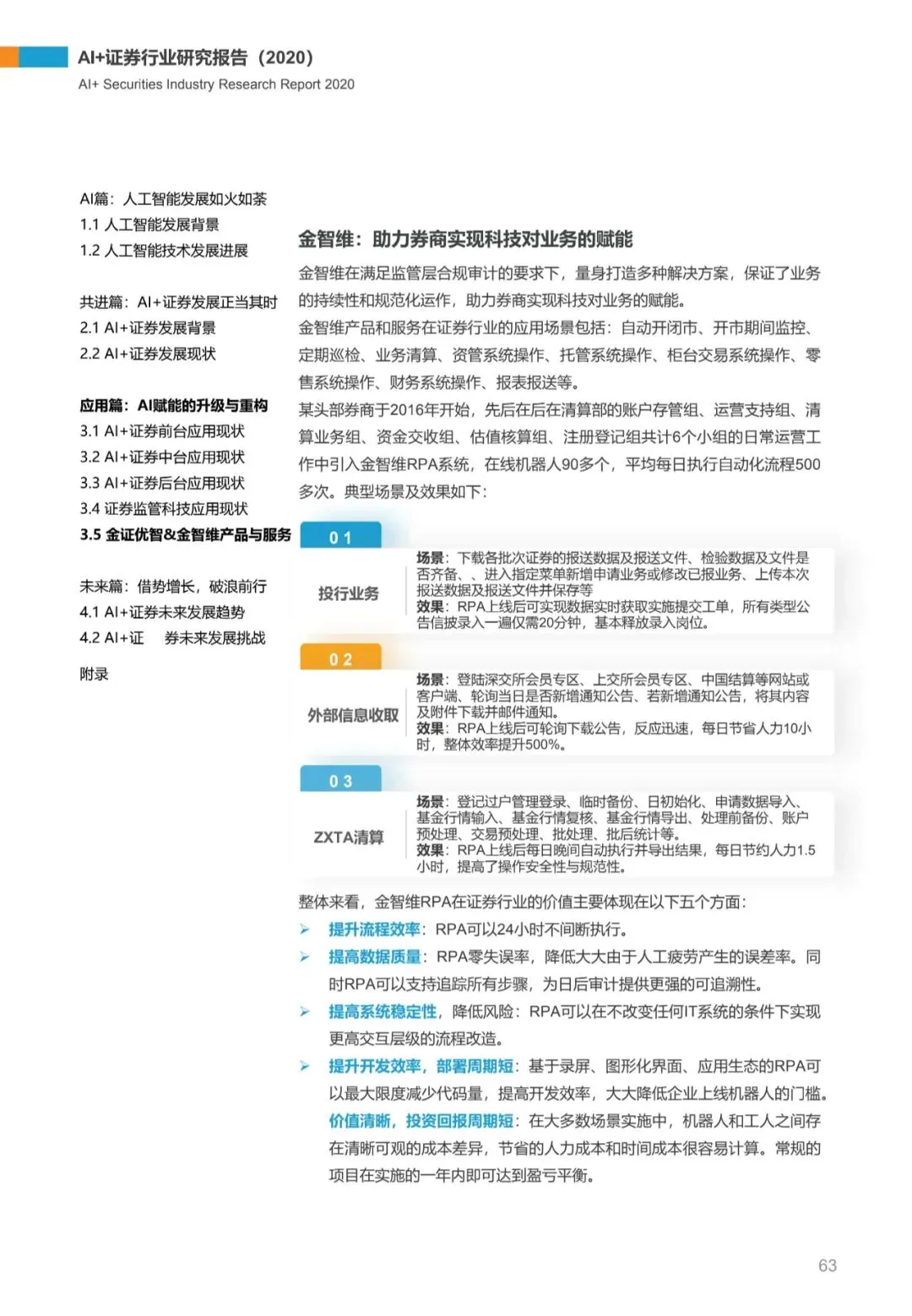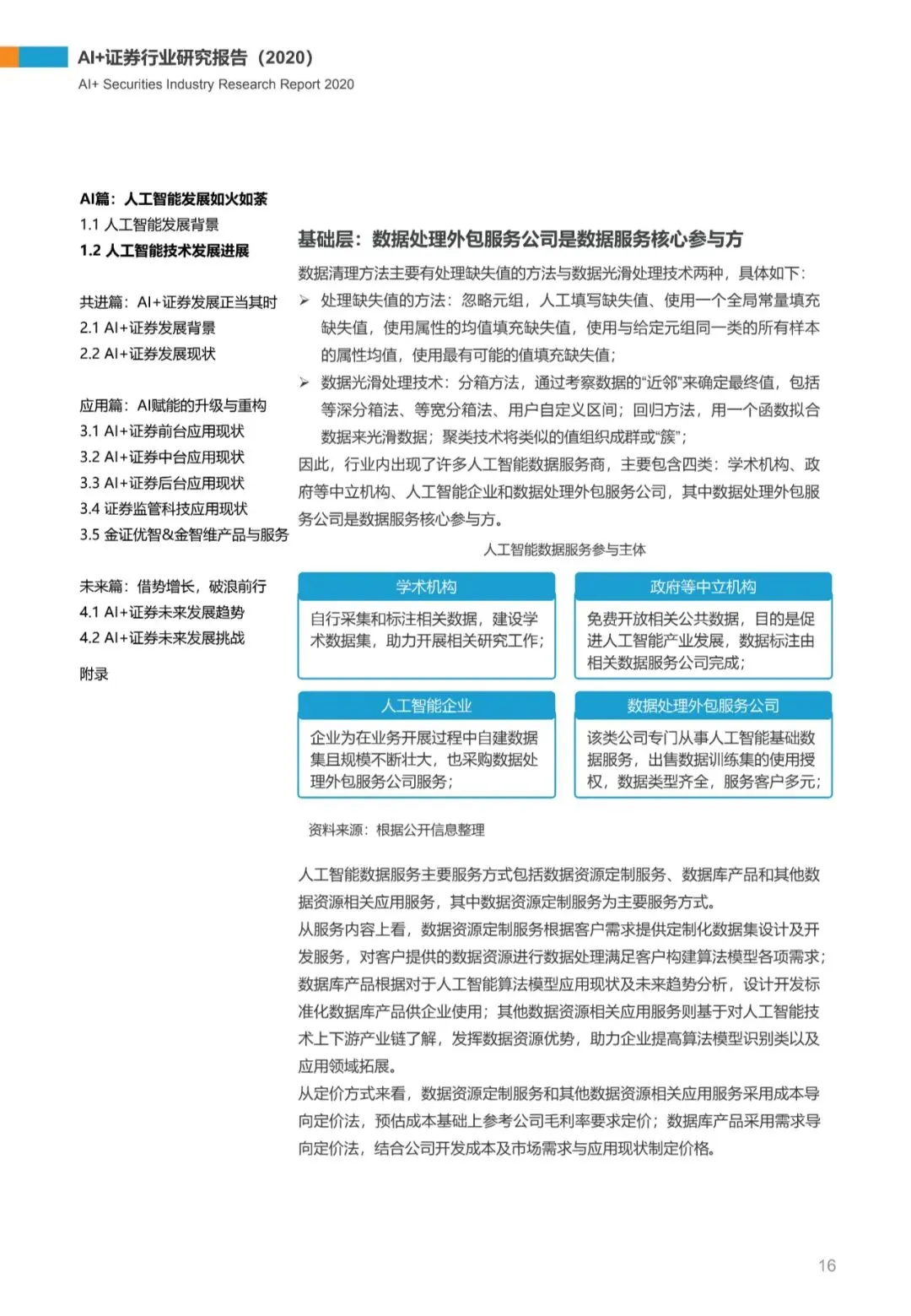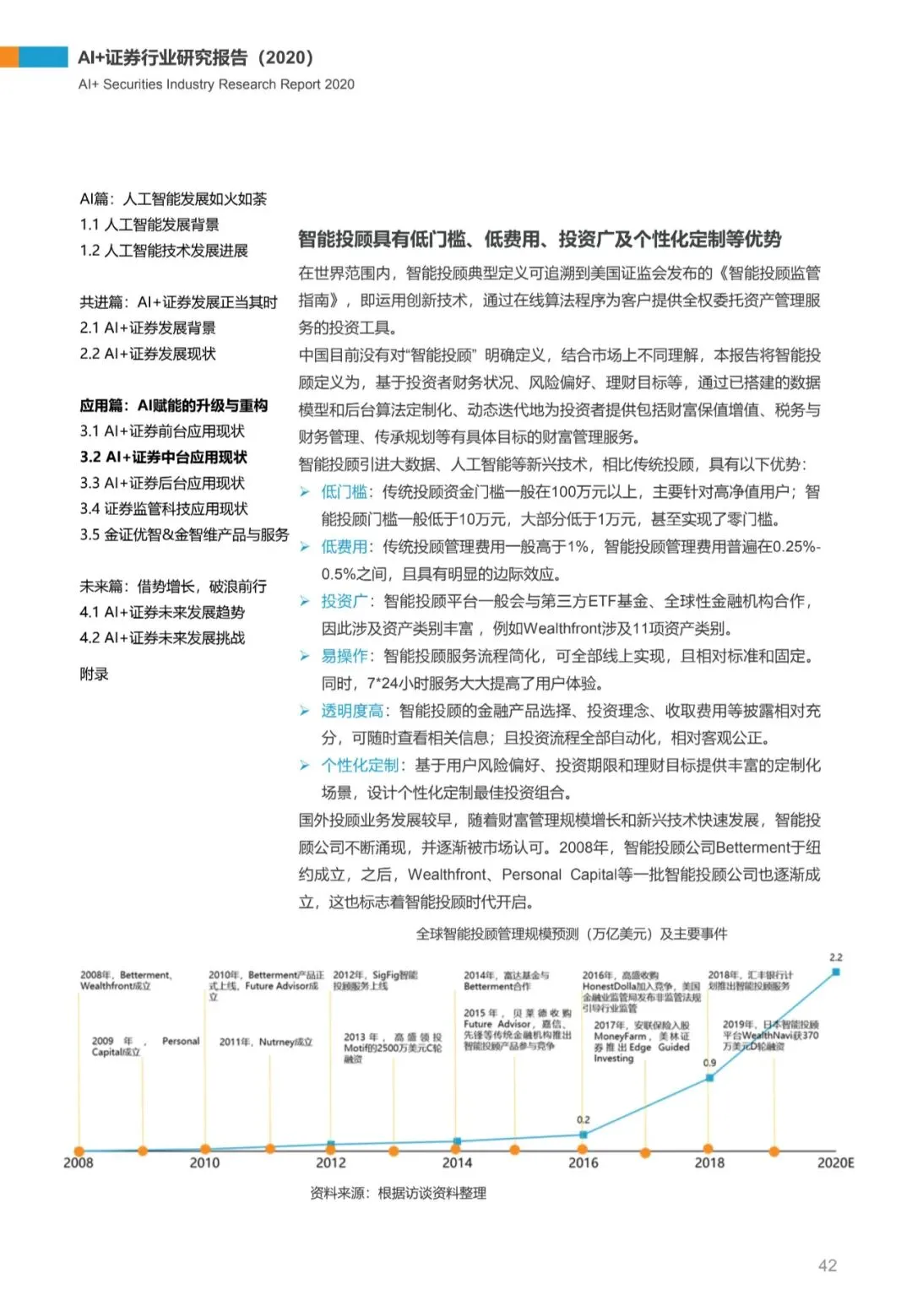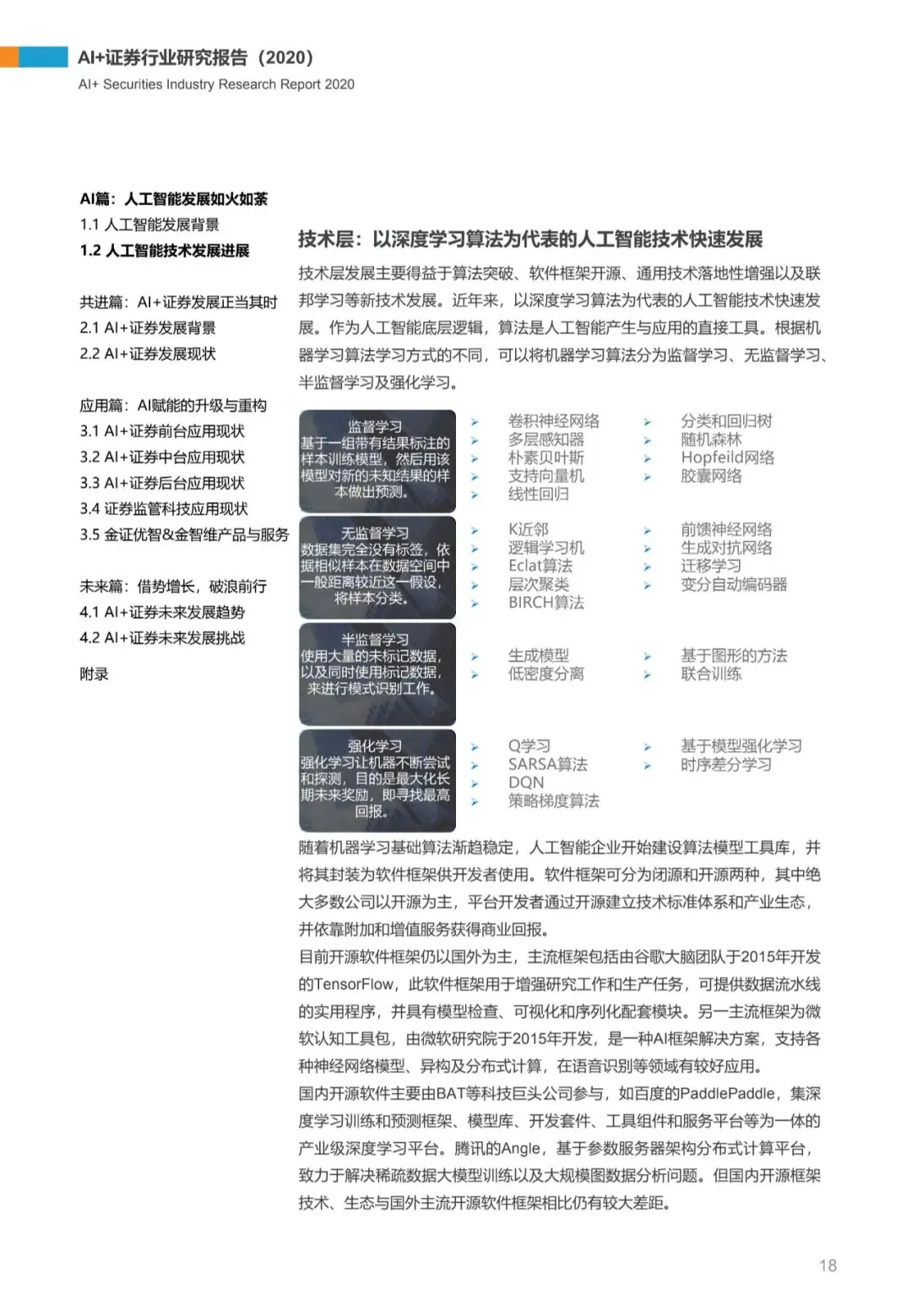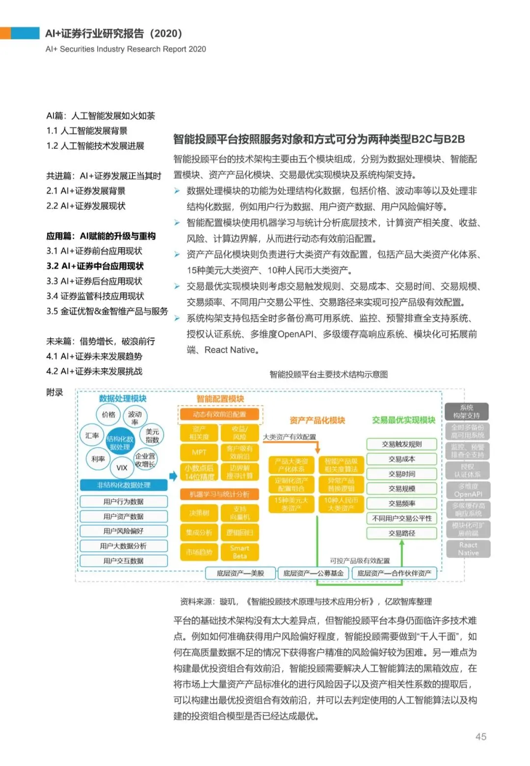 2020年12月10日,《AI+证券行业研究报告(2020)》正式发布。该报告在北京大学汇丰金融研究院执行院长、中国银行业协会首席经济学家巴曙松教授指导下,由金证股份与亿欧智库历时一年时间共同完成。报告通过对人工智能企业、监管机构、证券公司等多个行业的从业专家进行访谈,从不同角度看待AI在证券行业的现状与未来发展,同时辅以大量文献资料作为数据支撑,分析了人工智能发展背景及技术进展,进而阐述了AI+证券发展背景和现状,重点解释了人工智能在证券行业经营过程中的前台、中台、后台以及监管端应用现状。报告认为平台化、场景化、智能化及生态化为AI+证券发展四大趋势,意识鸿沟、数据鸿沟、技术鸿沟、人才鸿沟为AI+证券四大挑战。