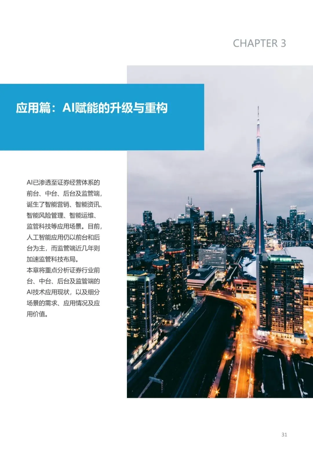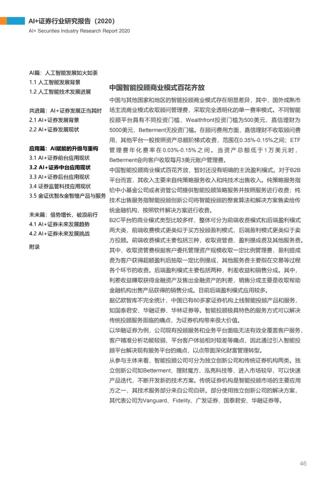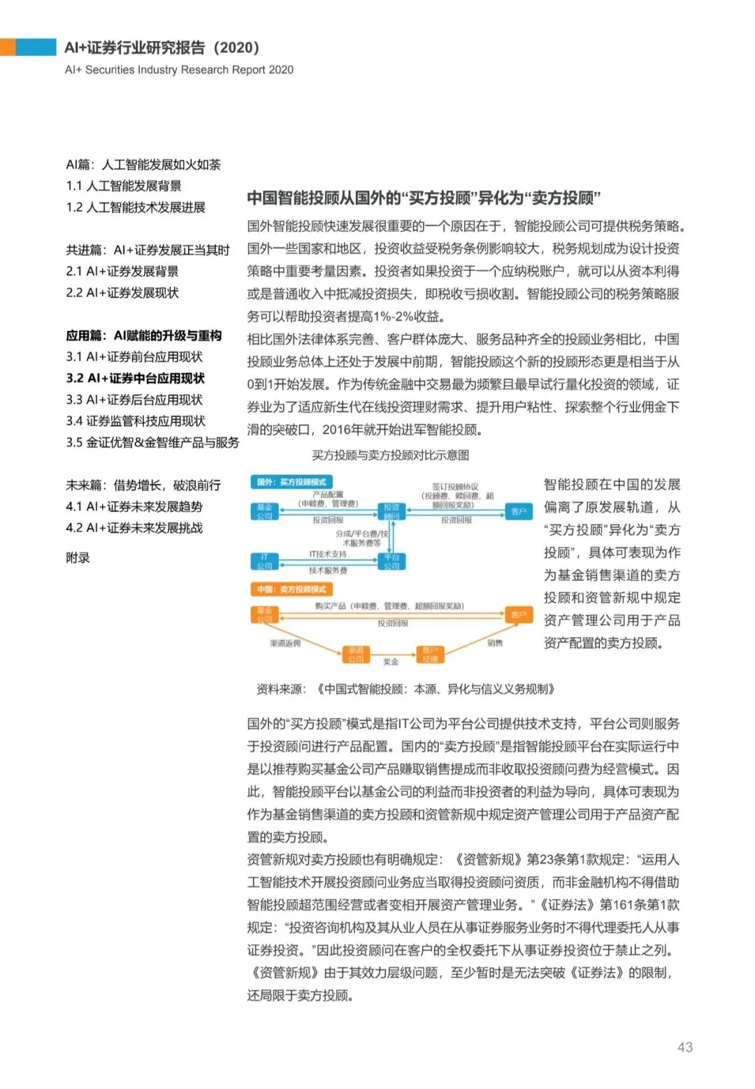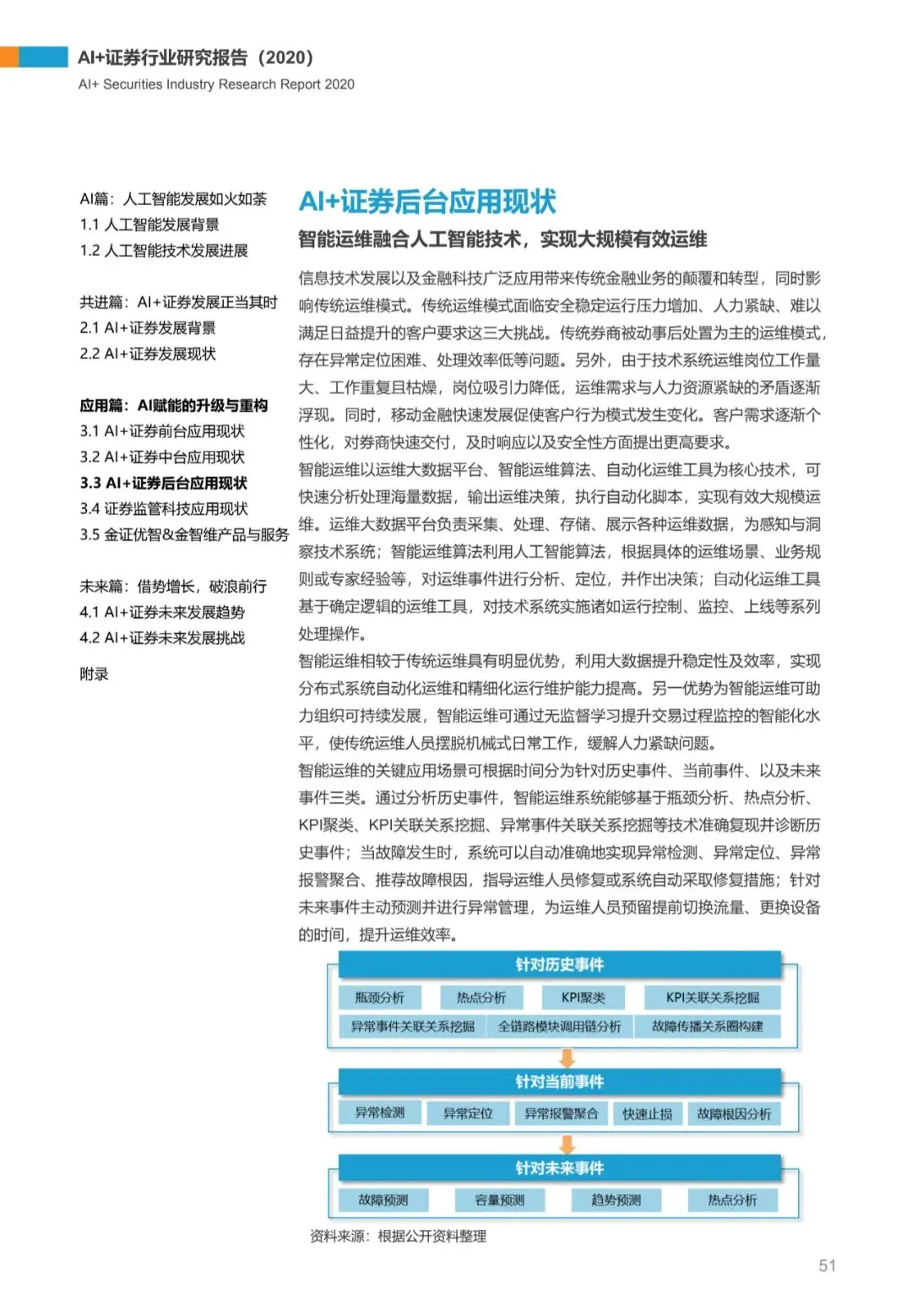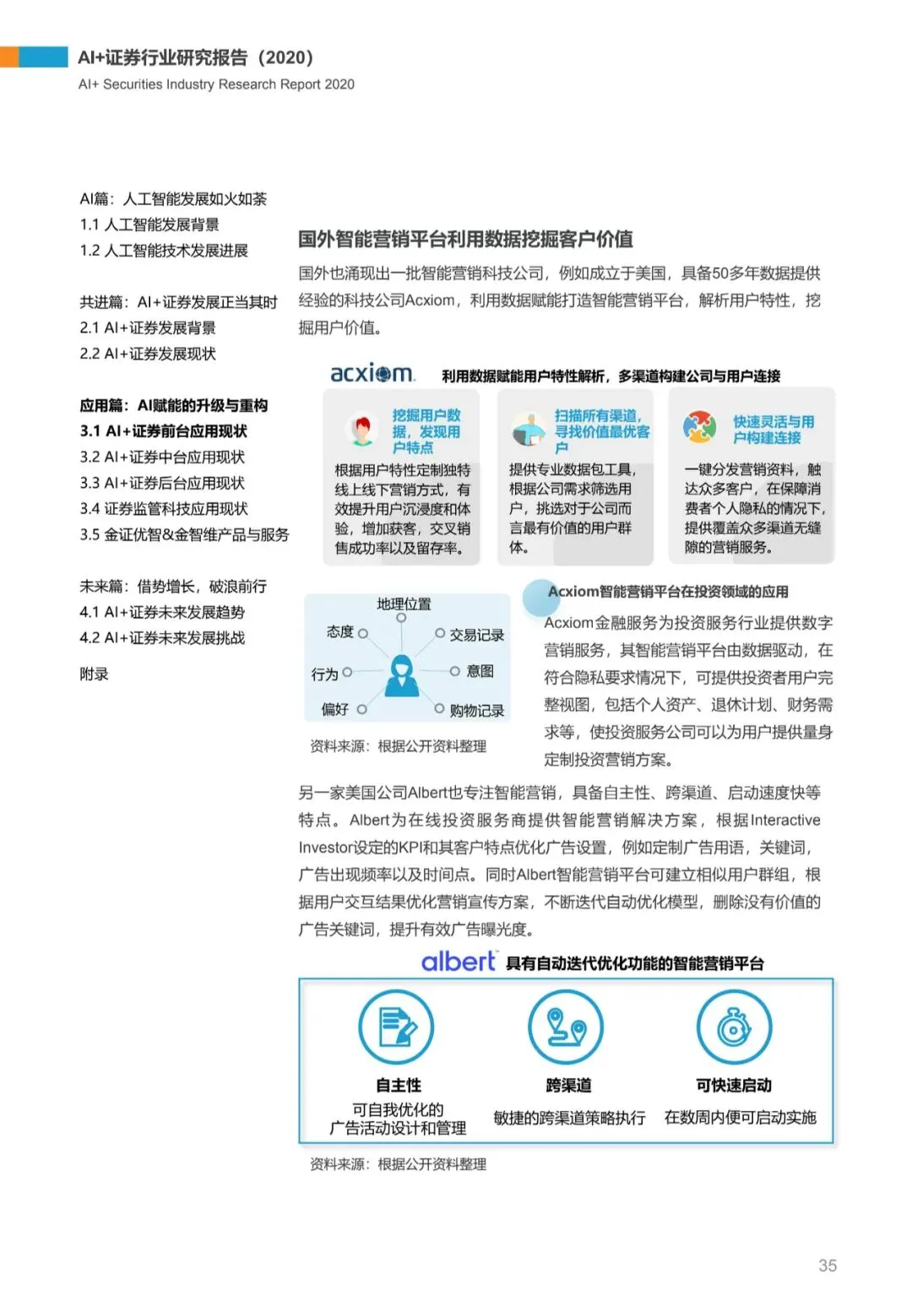 2020年12月10日,《AI+证券行业研究报告(2020)》正式发布。该报告在北京大学汇丰金融研究院执行院长、中国银行业协会首席经济学家巴曙松教授指导下,由金证股份与亿欧智库历时一年时间共同完成。报告通过对人工智能企业、监管机构、证券公司等多个行业的从业专家进行访谈,从不同角度看待AI在证券行业的现状与未来发展,同时辅以大量文献资料作为数据支撑,分析了人工智能发展背景及技术进展,进而阐述了AI+证券发展背景和现状,重点解释了人工智能在证券行业经营过程中的前台、中台、后台以及监管端应用现状。报告认为平台化、场景化、智能化及生态化为AI+证券发展四大趋势,意识鸿沟、数据鸿沟、技术鸿沟、人才鸿沟为AI+证券四大挑战。