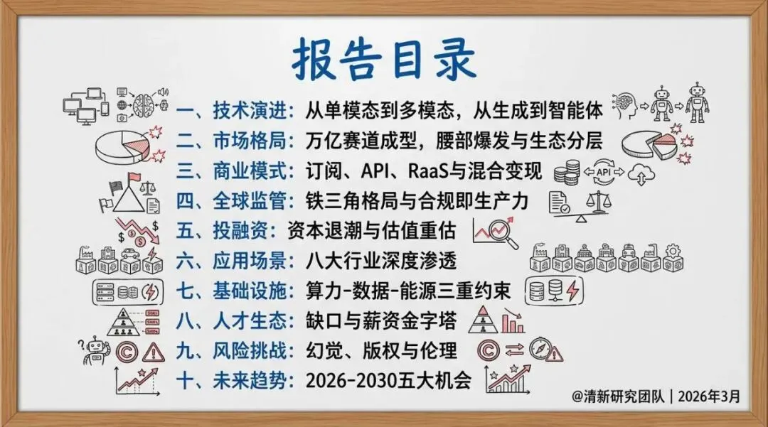这份由清华大学清新研究团队发布的 2026 年版 AIGC 行业深度研究报告,围绕生成式人工智能行业发展现状、核心维度及未来趋势展开全面分析,核心展现了行业迈入规模化落地、合规驱动、垂直爆发的新阶段,同时也面临多重约束与挑战,以下是核心总结: