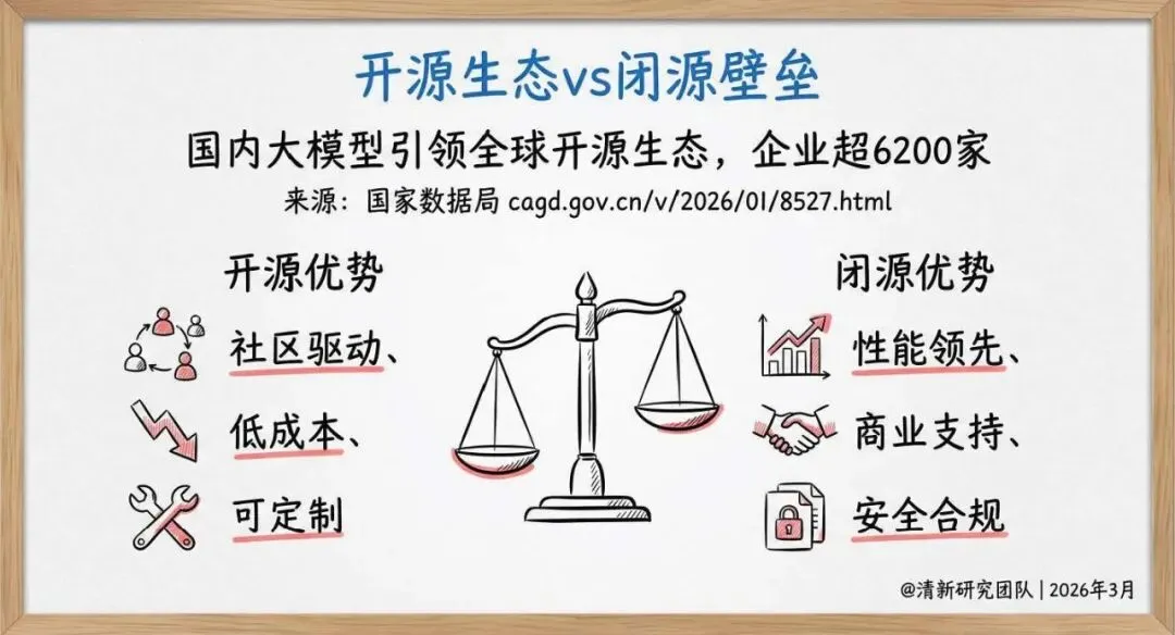 生态博弈:国内引领全球开源生态,开源(社区驱动、低成本可定制)与闭源(性能领先、安全合规)各有优势;