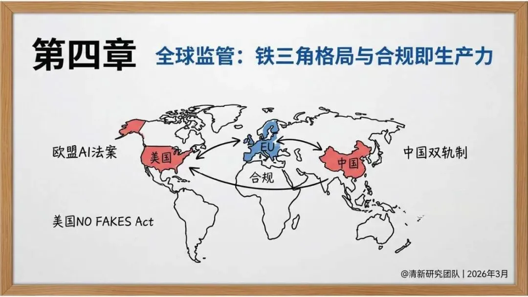 形成欧盟 AI 法案、中国双轨制、美国 NOFAKES Act的全球监管铁三角,合规成为企业市场准入的关键门槛: