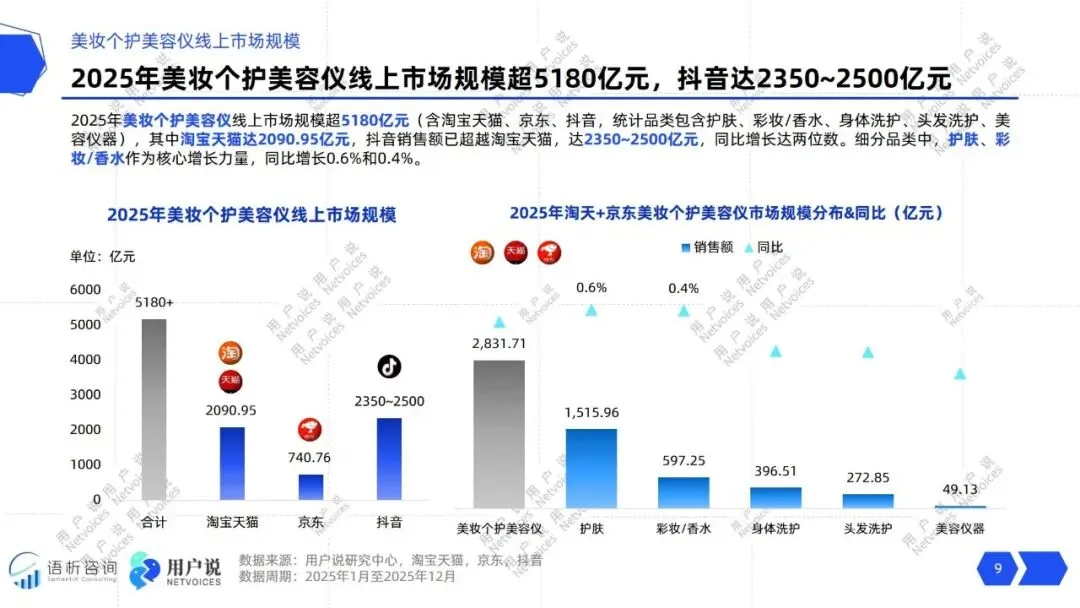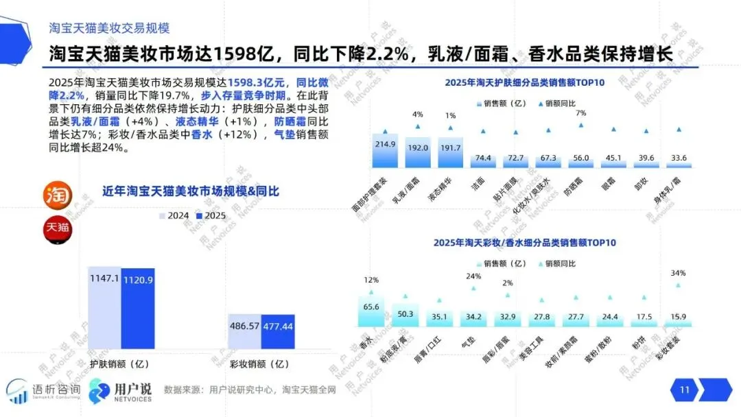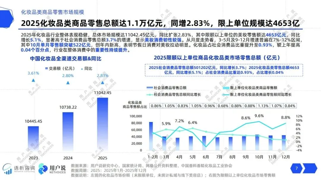 在消费理性化与监管趋严的双重背景下,中国化妆品行业正经历从流量驱动向产品力驱动的深刻转型。报告指出,2025年市场规模已达1.1万亿元,其中国货份额攀升至57.37%,线上渠道贡献超65%的销售额。行业的核心增长逻辑已从粗放式扩张转向对精准需求、科技创新与场景延伸的深度挖掘。
