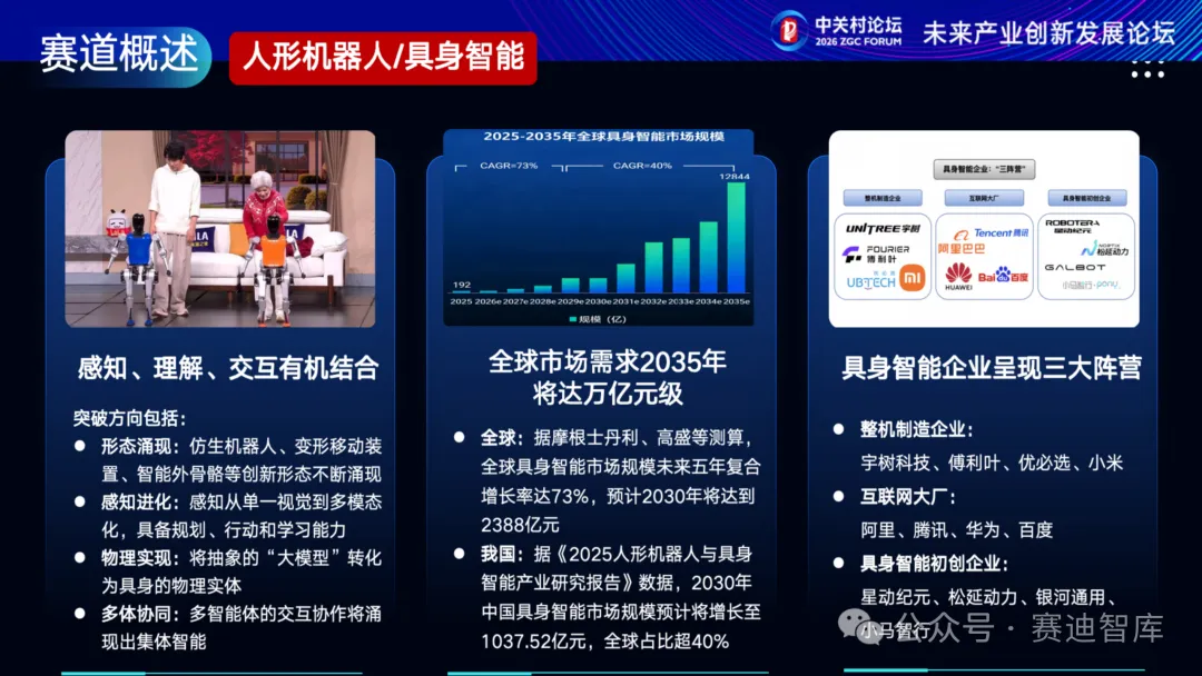 具身智能将按照感知、理解、交互有机结合的趋势发展,在形态涌现、感知进化、物理实现、多体协同等方面实现突破。据测算,全球具身智能市场规模未来五年复合增长率达73%,预计2030年将达到2388亿元。按市场划分,我国人形机器人企业呈现整机制造、互联网大厂、具身智能初创企业三大阵营。工业制造、商业表演、特种应用、家庭服务四大应用场景成为2026年产业落地重点方向。