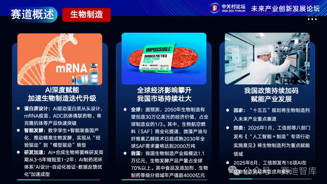 技术方面,生物制造迎来AI深度赋能期,智能发酵推动生产模式从“经验驱动”向“模型驱动”转型。规模方面,据预测,2050年有望创造30万亿美元价值,其中,生物航空燃料(SAF)商业化提速。政策方面,“十五五”规划将生物制造列入七大未来产业赛道,工信部等八部门发布《“人工智能+制造”专项行动实施意见》将其列为重点赋能领域。