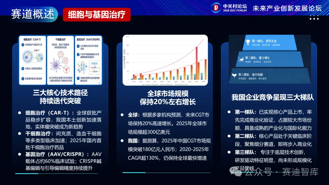 从技术路径看,细胞治疗、干细胞治疗、基因治疗三大核心技术路径加速迭代突破。从市场规模看,据多家机构预测,未来全球细胞与基因治疗市场保持20%以上高速增长。当前,四大方向值得重点关注,体内CAR-T颠覆传统体外制备模式,非病毒载体实现安全性与效率双突破,基因编辑迈入大写入时代,干细胞与再生医学加速临床验证。