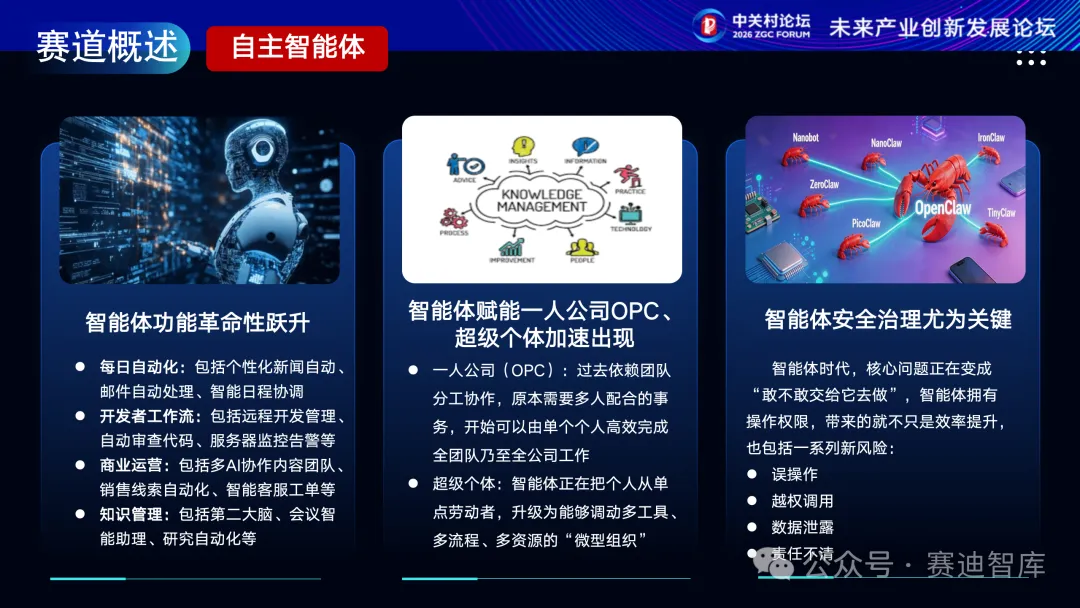 自主智能体能力正迎来革命性跃升,能够实现自动处理日常工作、辅助开发、优化商业运营,成为高效的智能助手。当前,自主智能体正催生“一人公司”等新组织形态,极大拓宽个体能力边界。同时,需关注智能体权限增大带来误操作、数据泄露等问题,建立完善的安全治理体系成为产业健康发展的关键。