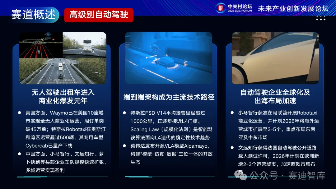 产业化进程方面,2026年无人驾驶出租车(Robotaxi)商业化将进入爆发元年。技术方面,端到端架构成为主流技术路径,性能与效率实现双重提升。商业化方面,自动驾驶企业全球化及出海布局加速推进。自动驾驶应用方面,2025年底,工业和信息化部公布我国首批L3级有条件自动驾驶车型准入许可。