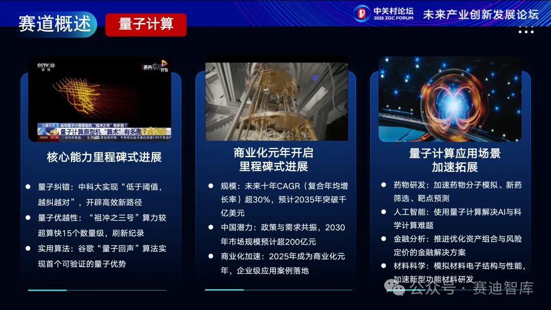 作为颠覆性前沿技术,量子计算迎来关键突破期。我国在量子纠错、量子优越性等核心领域取得里程碑式进展。商业化进程持续加快,未来十年市场规模年复合增长率超30%,预计2035年突破千亿美元。应用场景从药物研发、人工智能向金融分析、材料科学持续拓展。