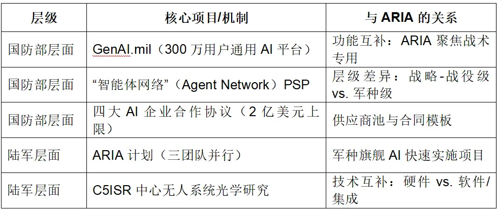 ARIA计划在美国国防部整体AI战略框架中具有明确的定位。2026年1月发布的《人工智能加速战略》提出构建人工智能优先作战力量的四大目标:激励AI模型实验、清除集成障碍、巩固不对称优势、启动定步速项目(Pace-Setting Projects, PSPs) 。ARIA计划可被视为陆军层面的定步速项目,其快速实施理念与战略中的速度至上原则高度契合。